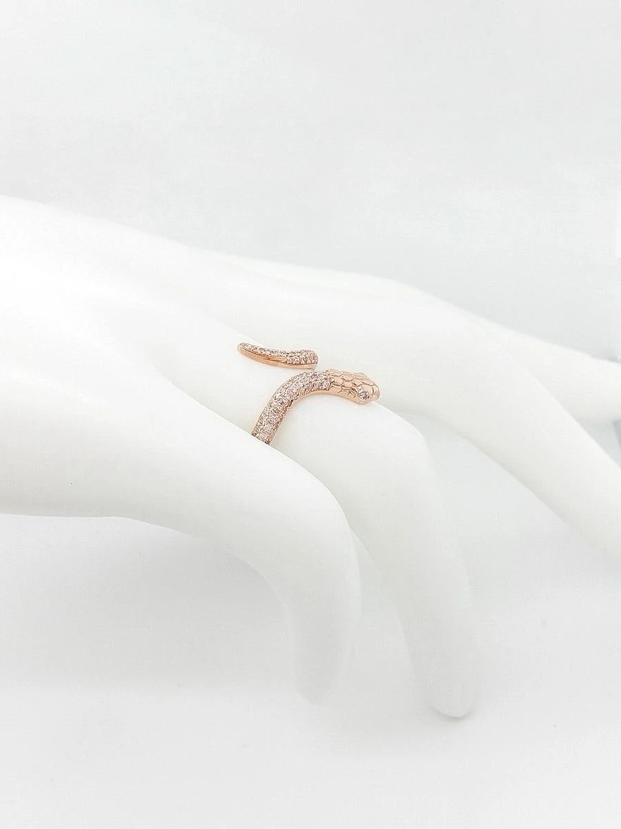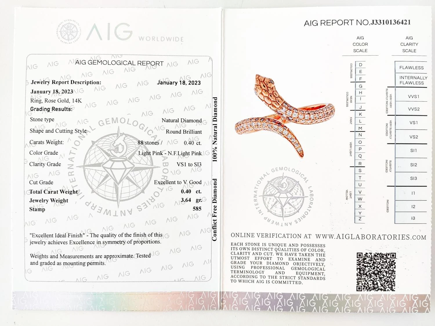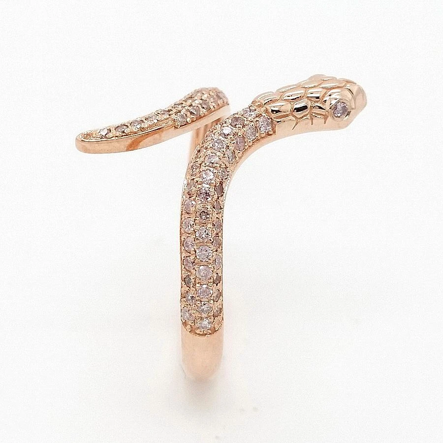 This eye-catching and beautifully handcrafted 14k pink gold snake design ring is set with 88 mixed pink round brilliant-cut diamonds, weighing in a total of 0.40 ct. The ring weighs 3.65 gr.