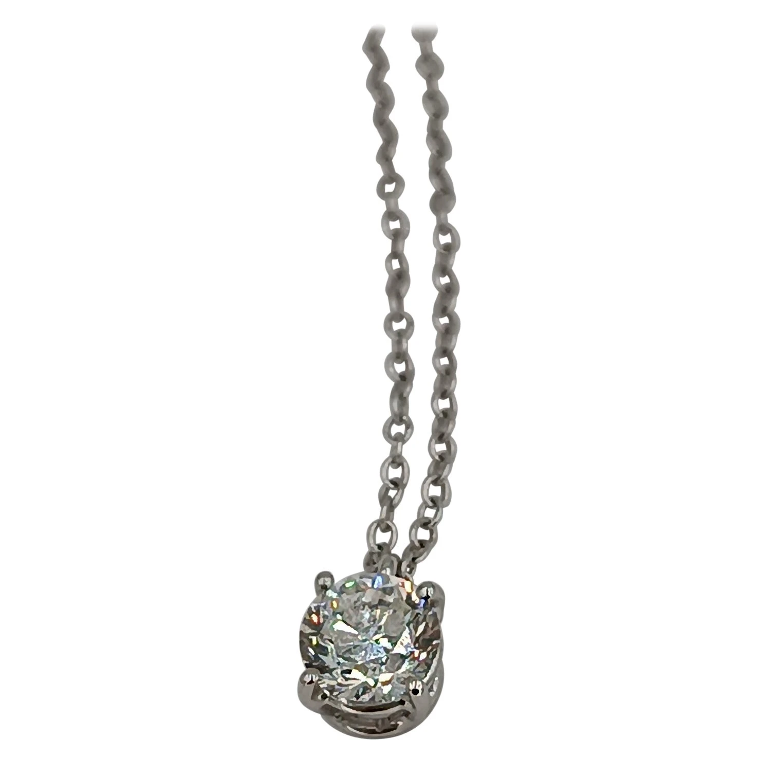 This timeless classic is all about the round brilliant cut stone, a magnificent 0.70 carat VS G color stone, mounted on a refined 18 carat white gold chain. the lenght of the necklace is 41 centimeters and the weight is 2.40 grams