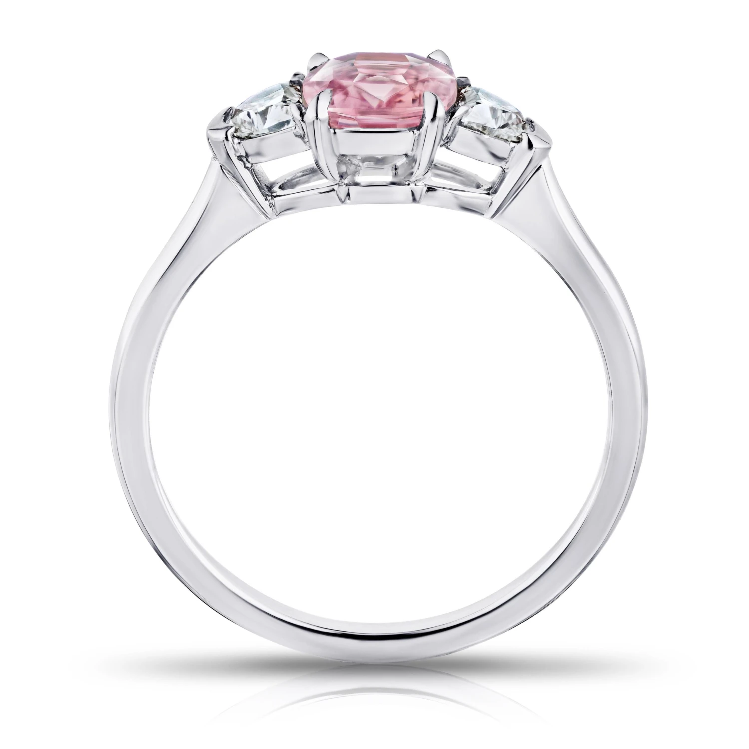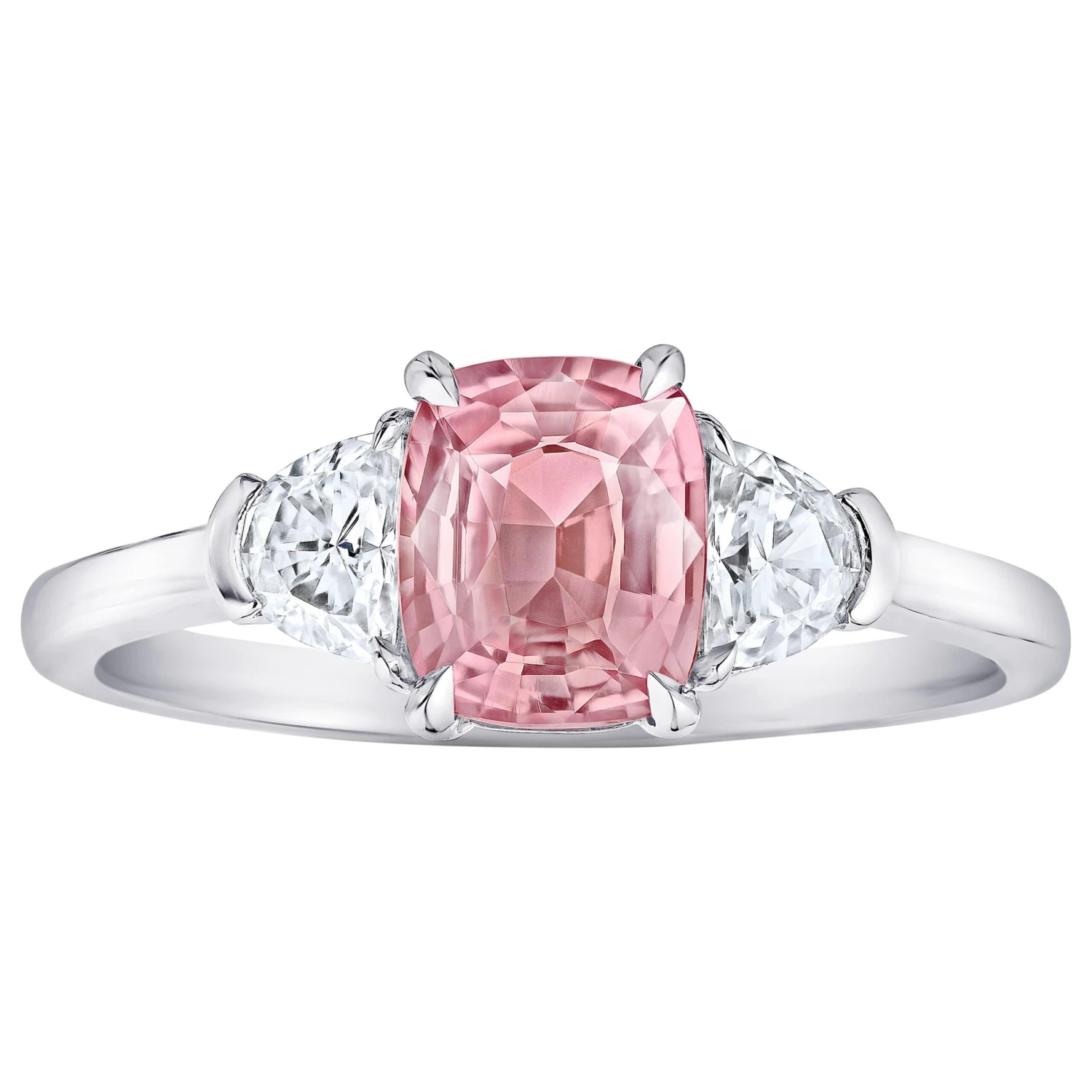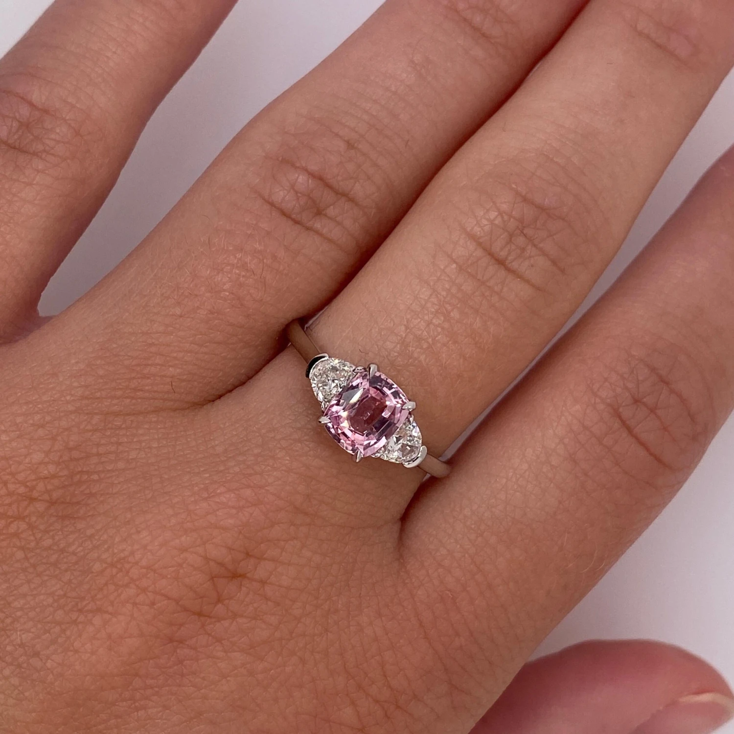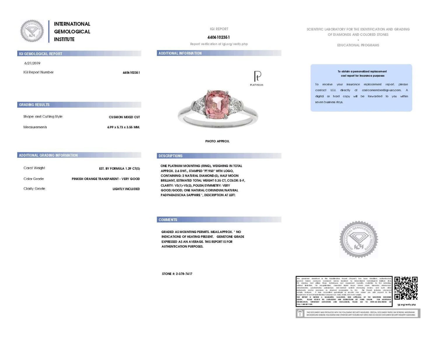 1.29 carat cushion padparadscha sapphire (NH) with half moon diamonds .35 carats set in a platinum ring. This ring is currently a size 7. We will resize to your finger size without charge.
