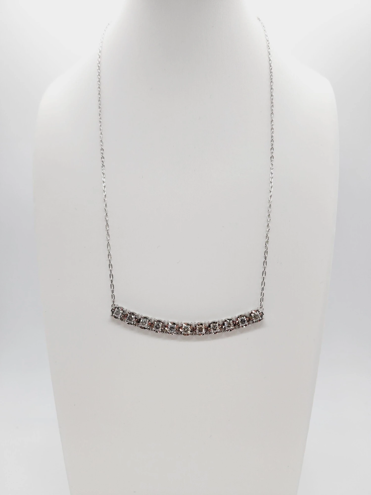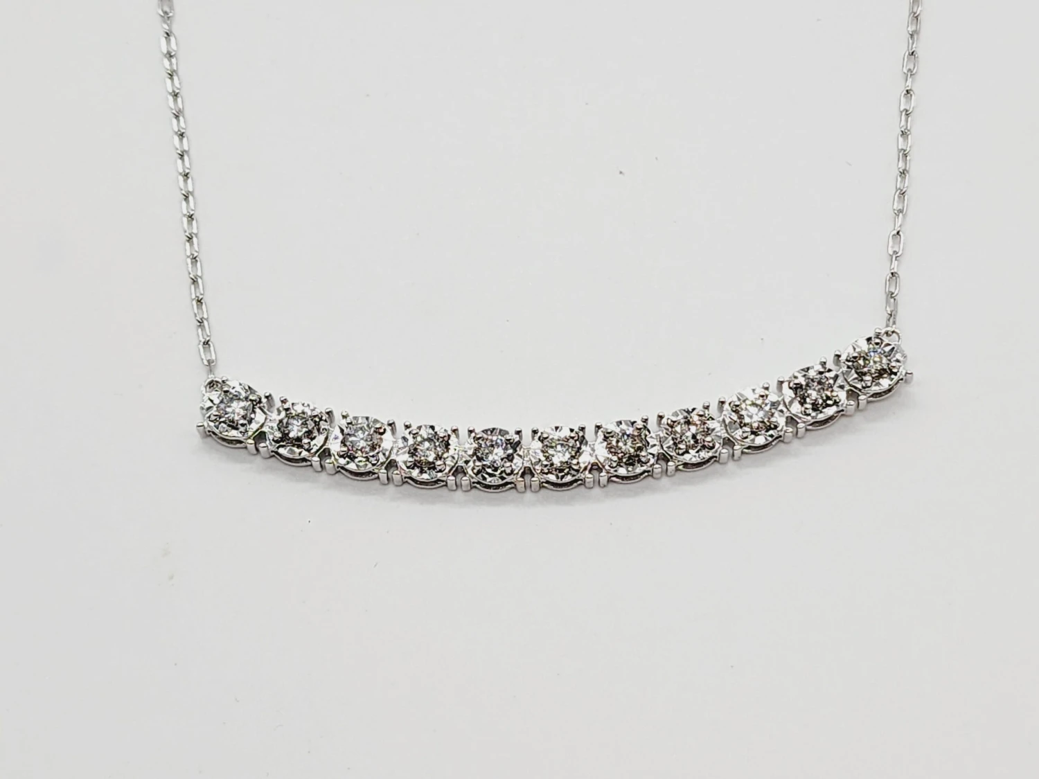 Brilliant and beautiful mini illusion setting necklace, natural round-brilliant cut white diamonds clean and Excellent shine. 14k White gold illusion setting four-prong for maximum light brilliance. 18 inch length. Average I Color, SI Clarity. Elegance for every moment.