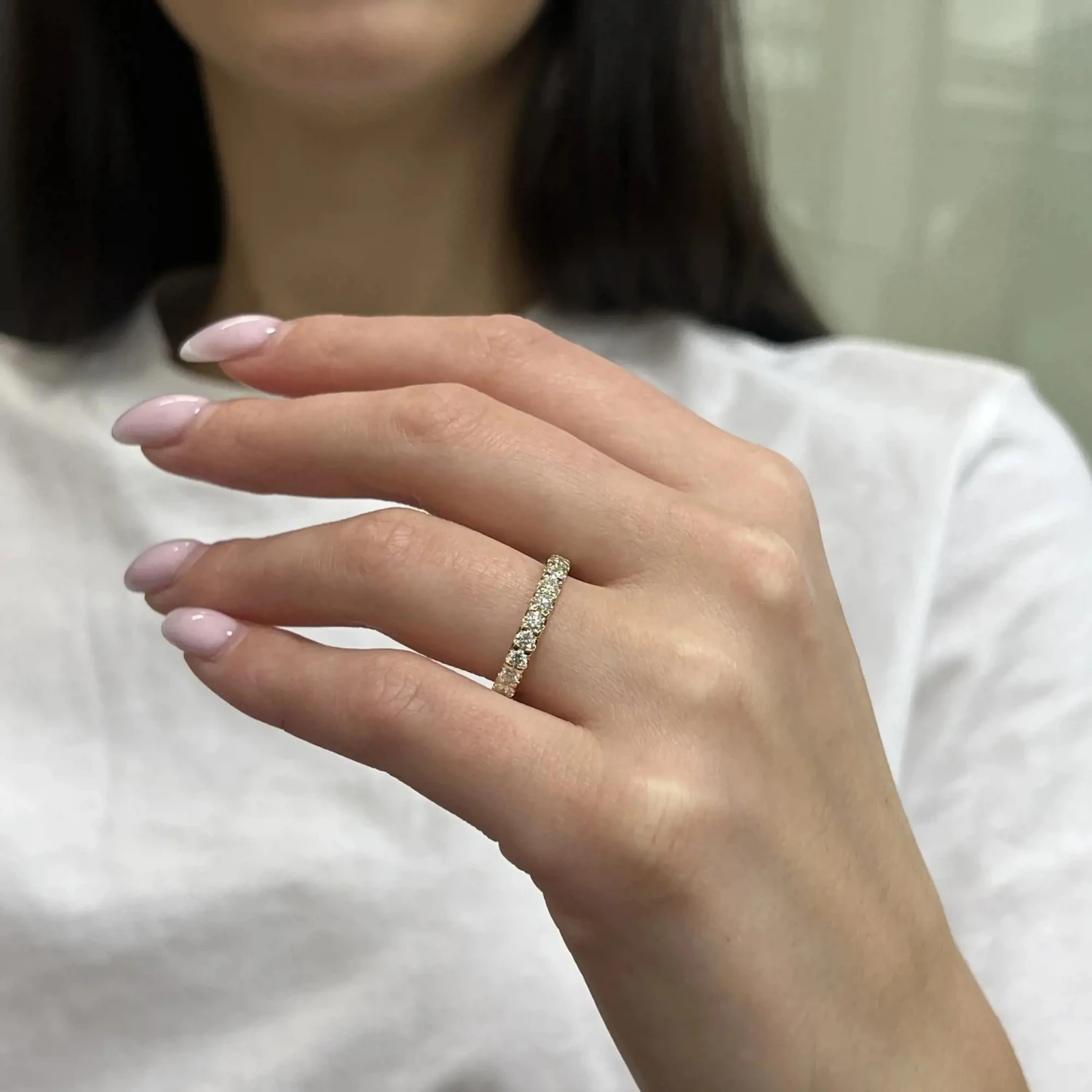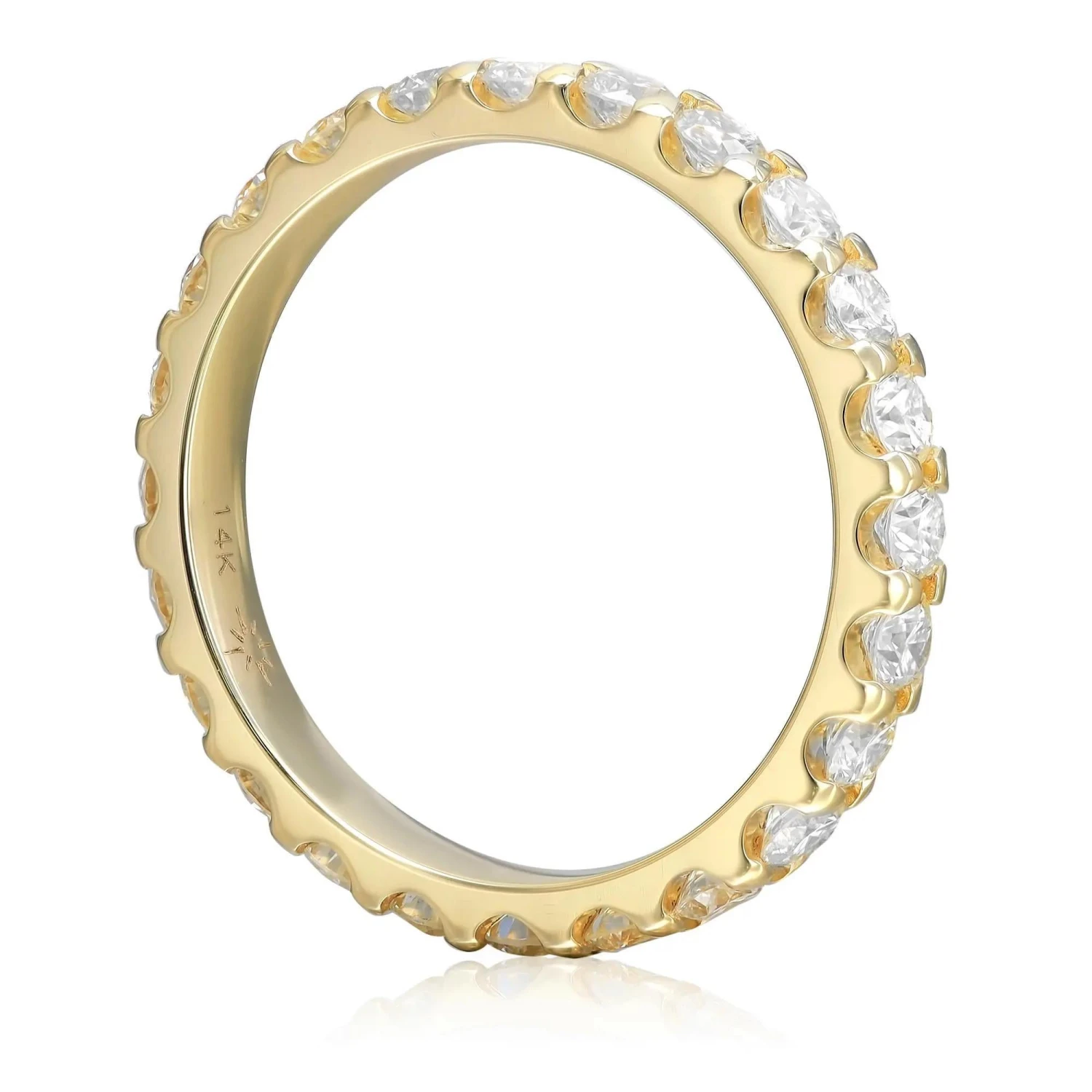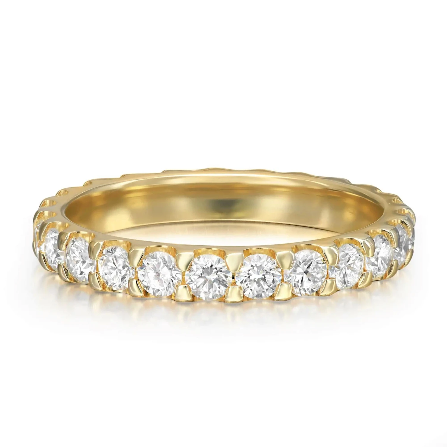This classic diamond eternity band ring makes a standout addition to your jewelry collection. It features 24 prong set round brilliant cut sparkling diamonds, crafted in 14K yellow gold. Total diamond weight: 1.50 carats. Diamond quality: color H-I clarity VS-SI. Band width: 3mm. Ring size: 7. Total weight: 2.8 grams. This eternity band is perfect to show your eternal love to the love of your life. Comes with a presentable jewelry box.