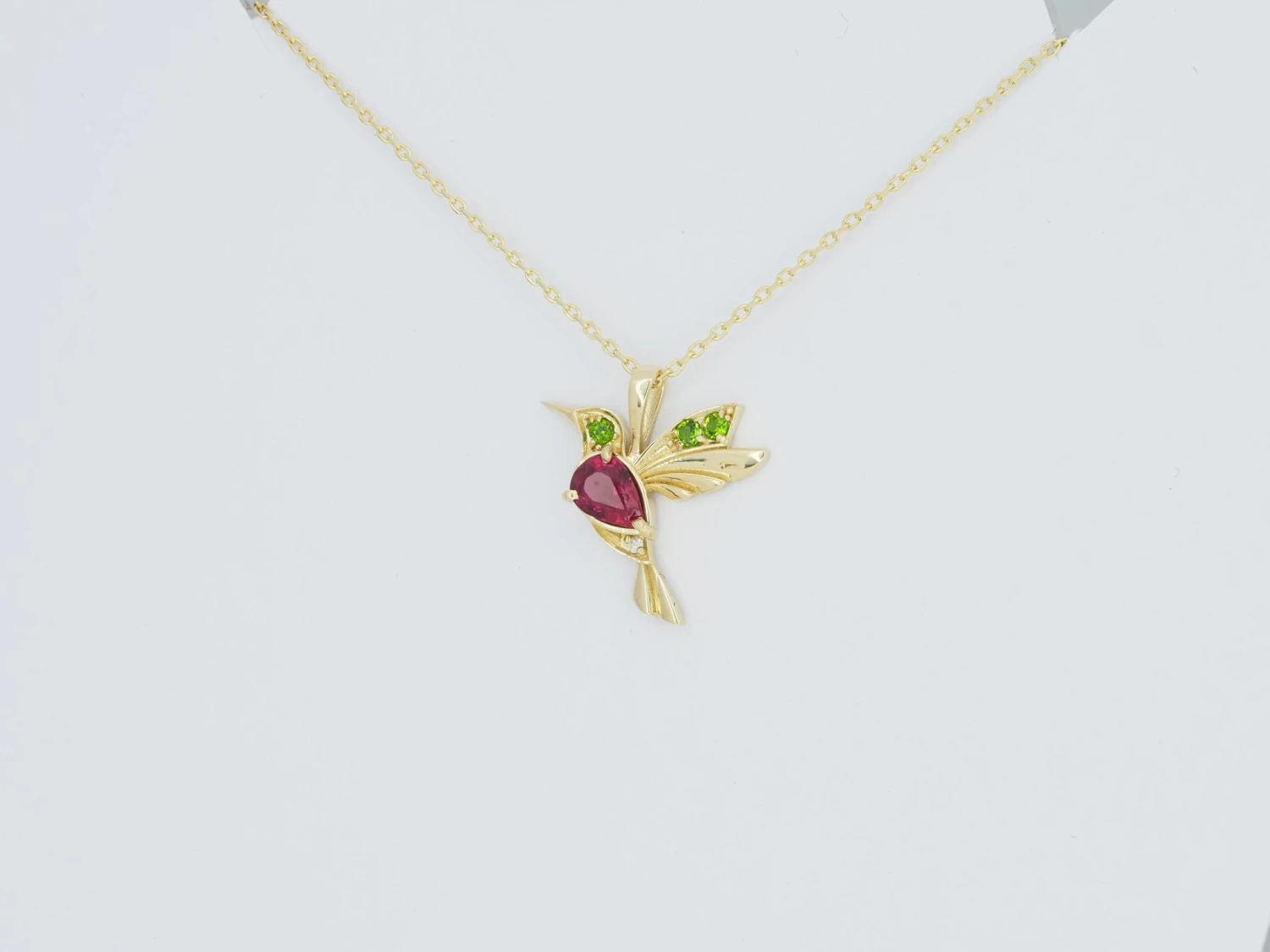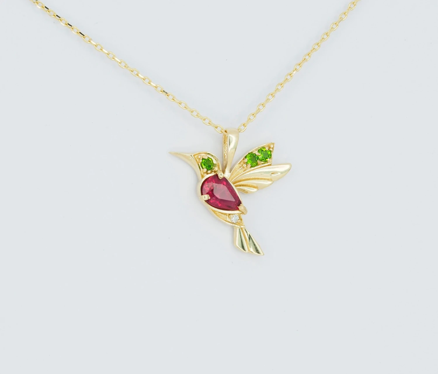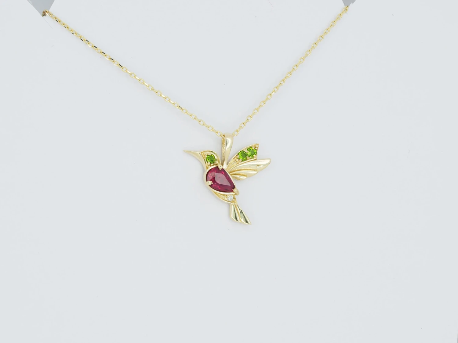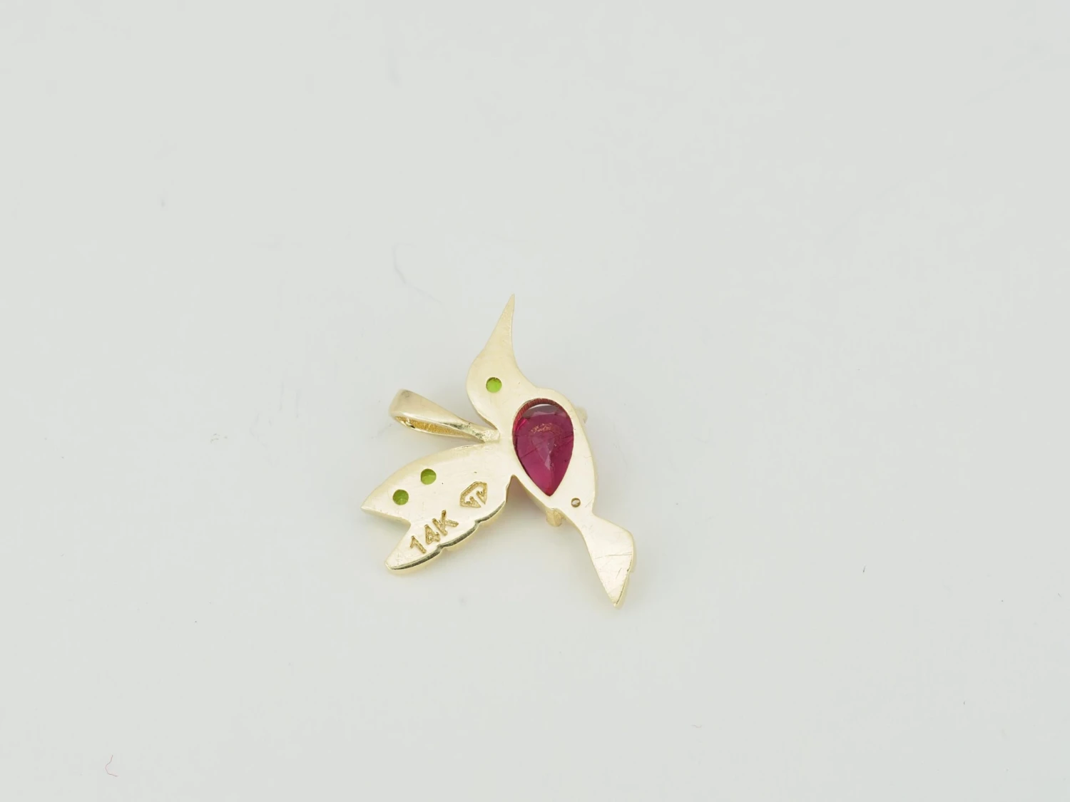 14 kt gold bird pendant with ruby, tsavorites and diamond.
