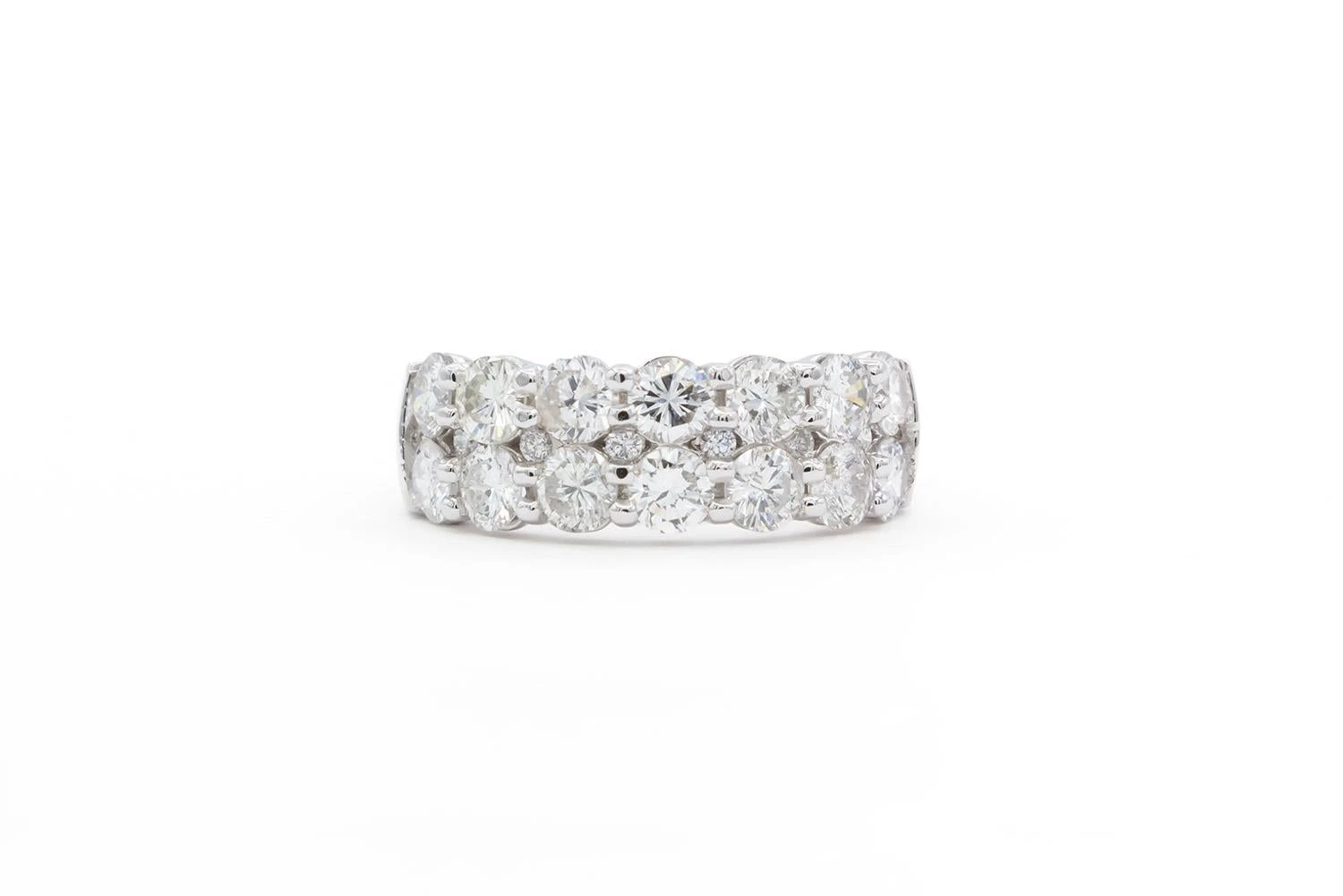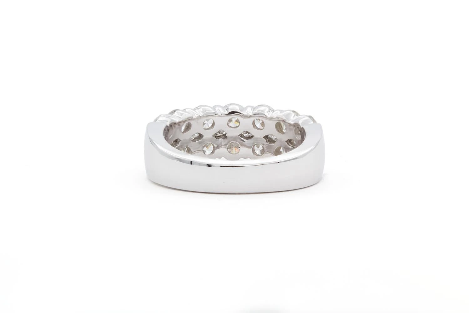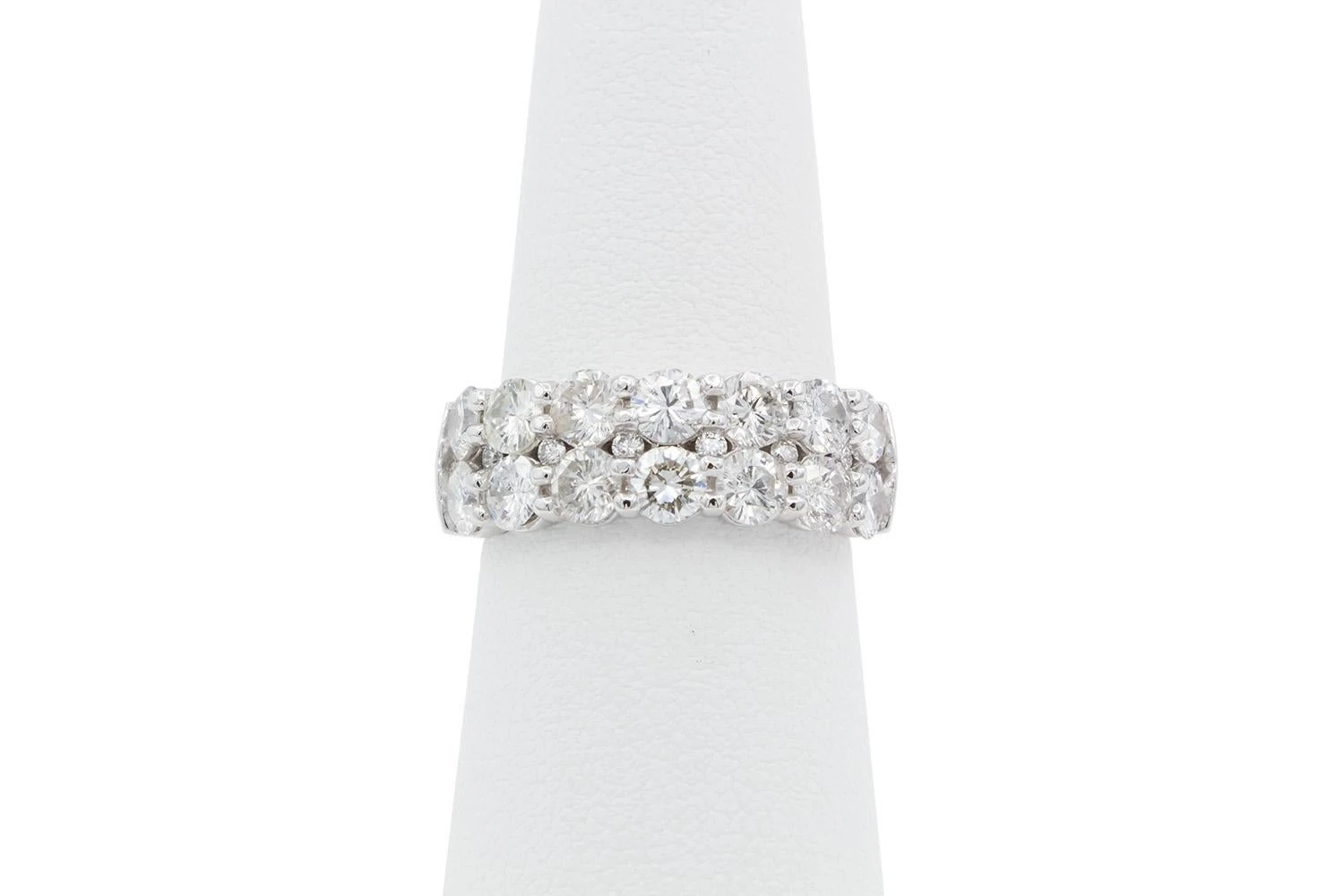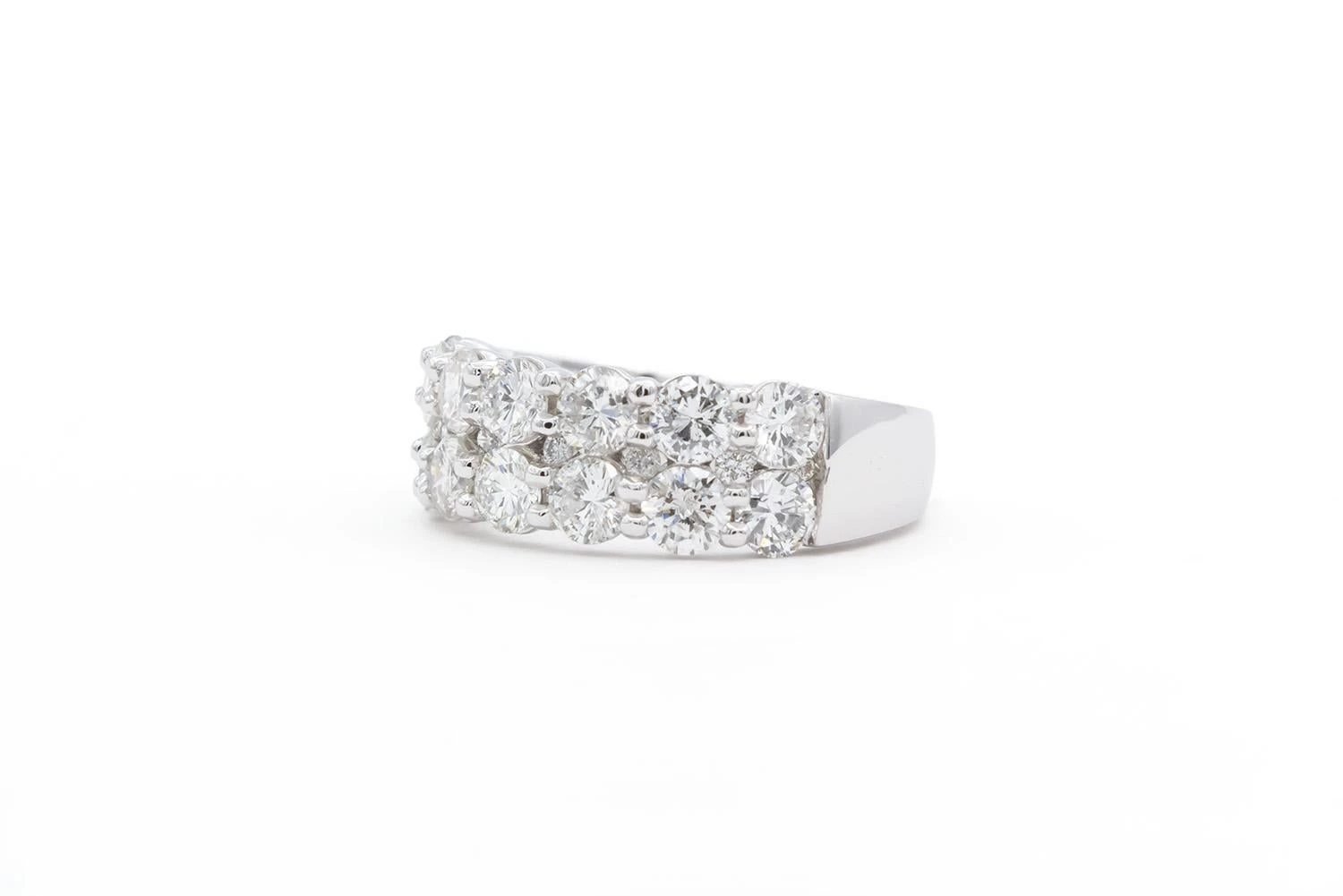 We are pleased to offer this Brand New 14k White Gold & Diamond 2 Row Shared Setting Fashion Ring. This is not your typical two row band, it actually has smaller hidden diamonds in between the larger diamonds for added bling! It features 2.26ctw G-H/SI1-SI2 Round Brilliant cut diamonds all set in a 14k White Gold shared setting band. The brilliance and sparkle of this ring is outstanding, truly a stunning piece. The ring tappers from 7mm at the wides point of the diamonds to 3.75mm below the finger and fits a size 6 finger. The ring is brand new, never worn.