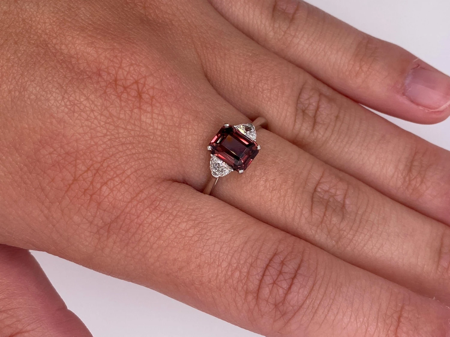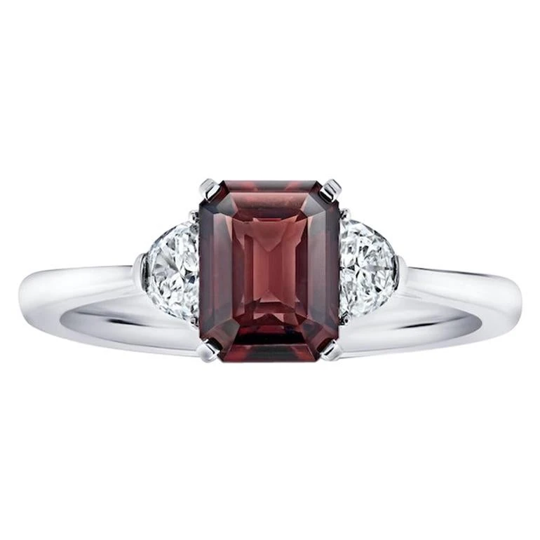 2.08 carat emerald cut (natural no heat) reddish brown sapphire with half moon shaped diamonds .29 carats set in a platinum ring.