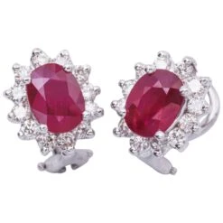 The oval ruby in these earrings have a total carat weight of 3.20 carats, and they measure 8×6 MM.. The diamonds have a total carat weight of 0.94 carats.
