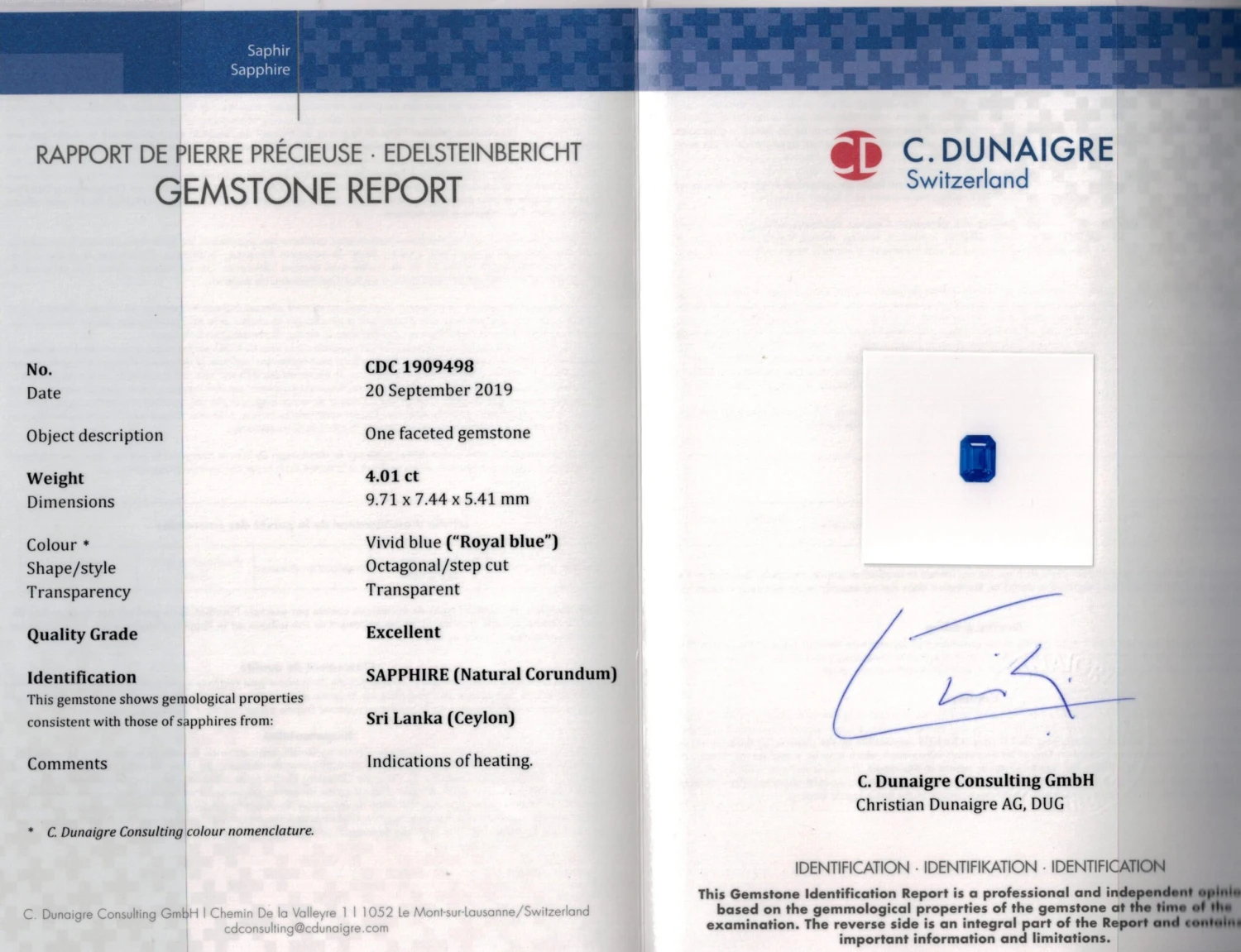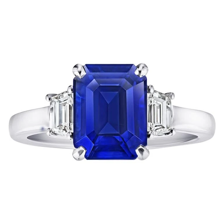 4.01 carat emerald cut blue sapphire with trapezoid diamonds .57 carats set in a platinum ring. Size 7. Free resizing included to your finger size.
