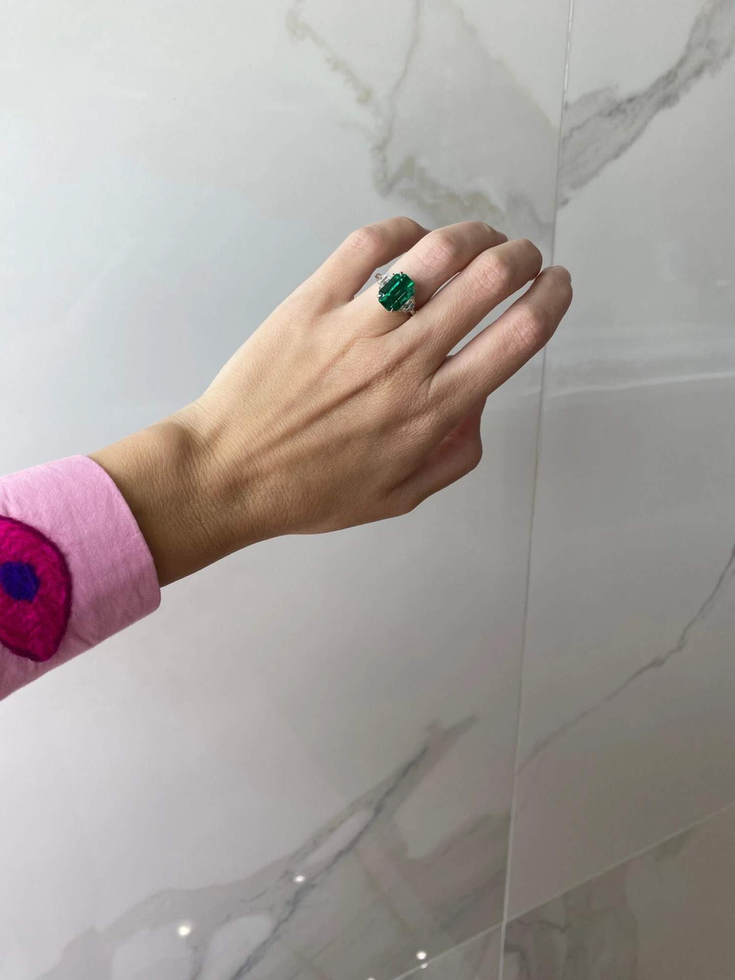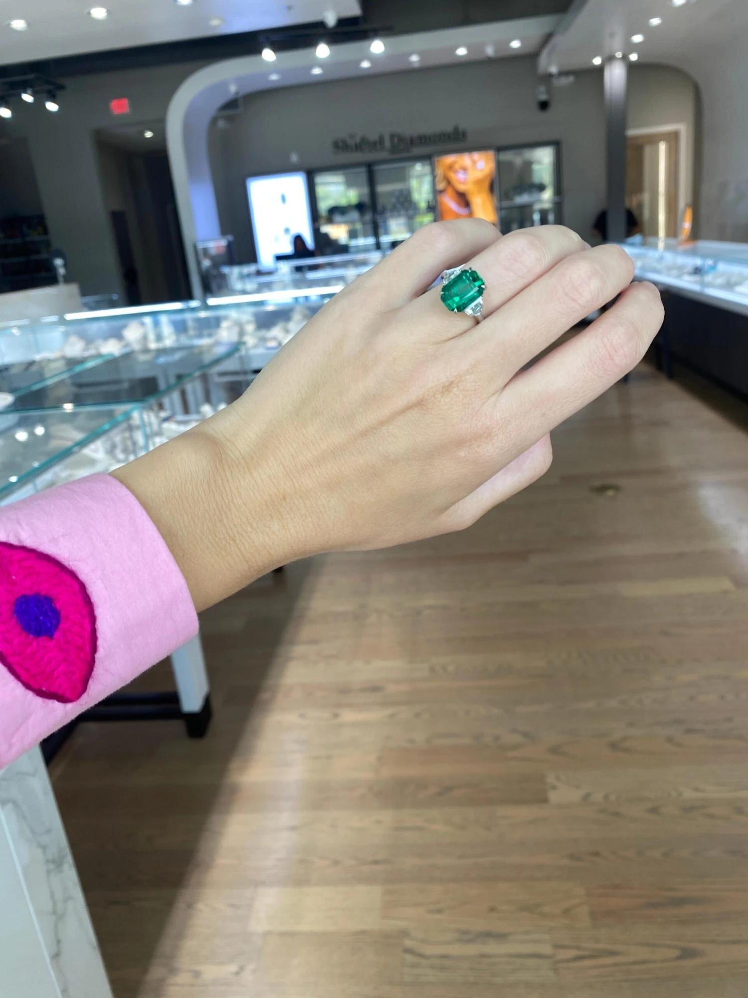 This beautiful ring features a 5.02 carat emerald cut natural emerald accented by 1.02 carat total weight in two cadillac cut diamonds set in platinum. The emerald has a high level of transparency and strong green saturation. This is a one of a kind piece that will sure turn heads!