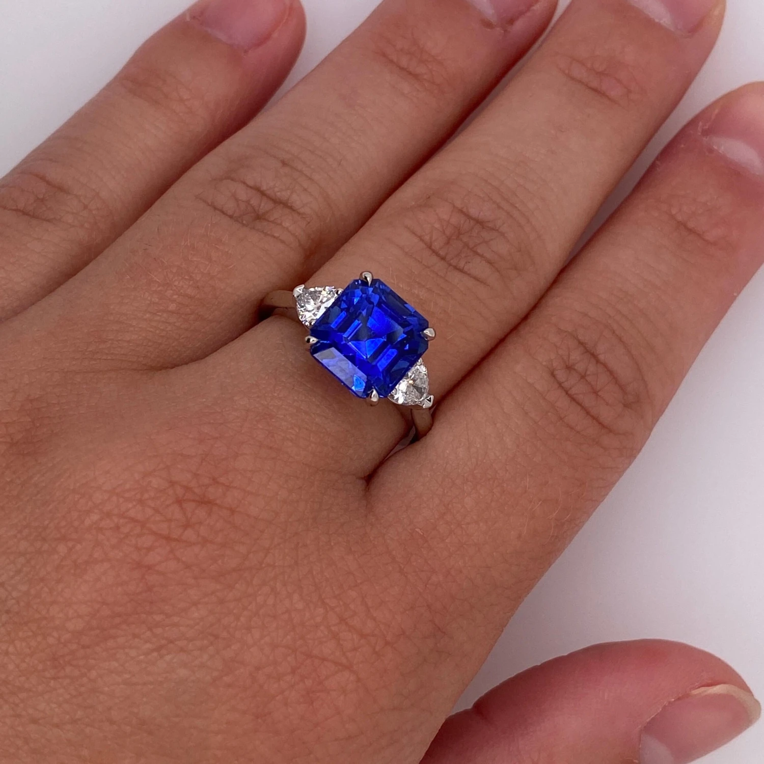 5.65 carat square emerald blue sapphire with heart shape diamonds .58 carats set in a platinum ring Size 7.