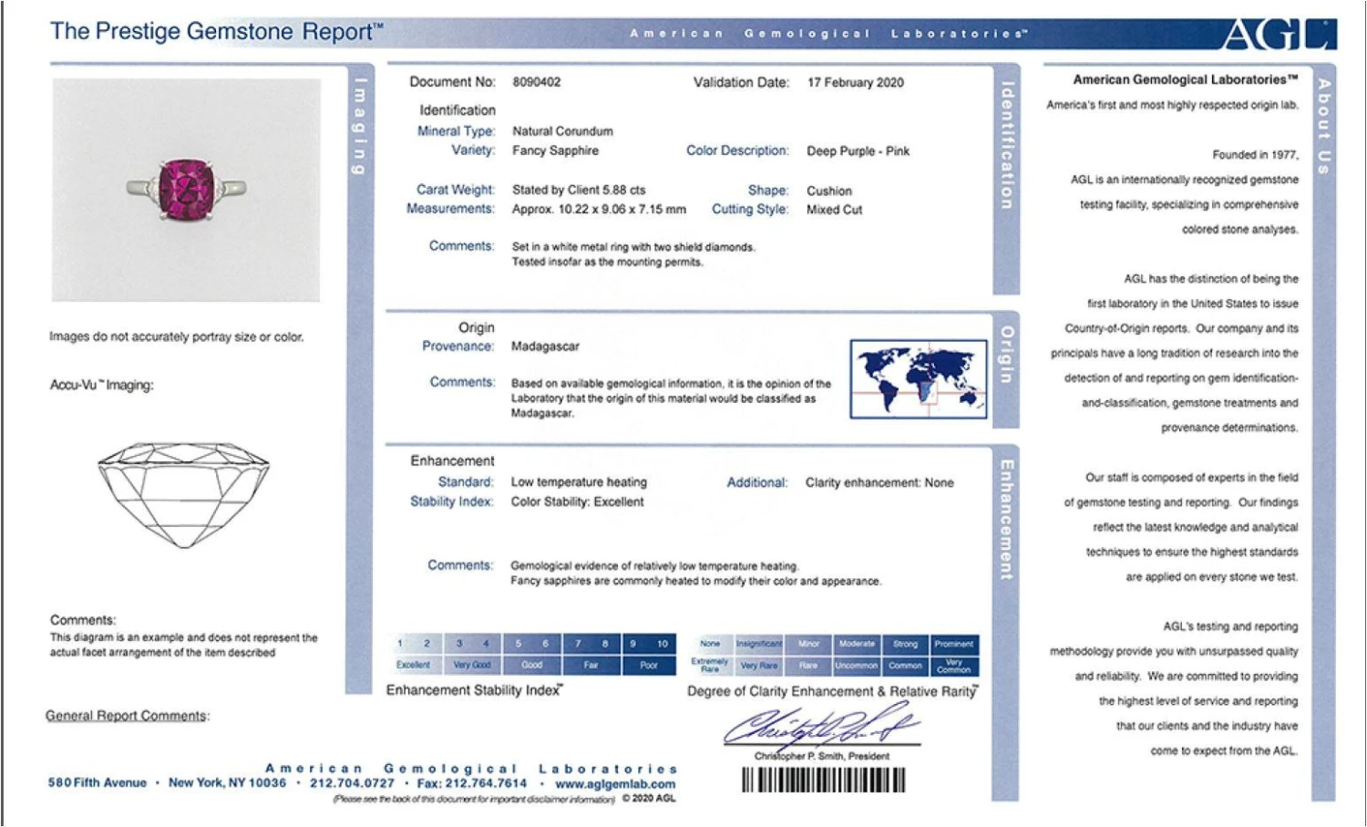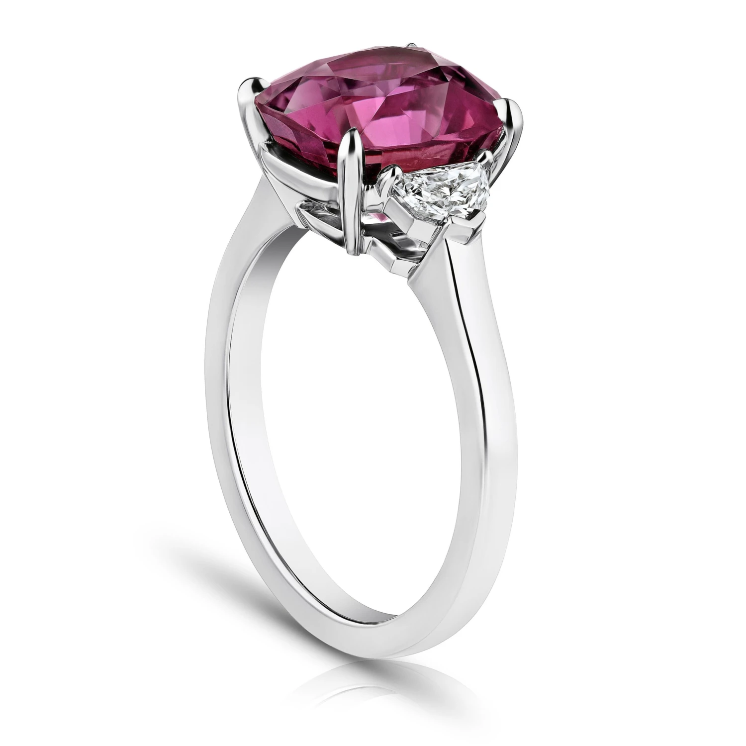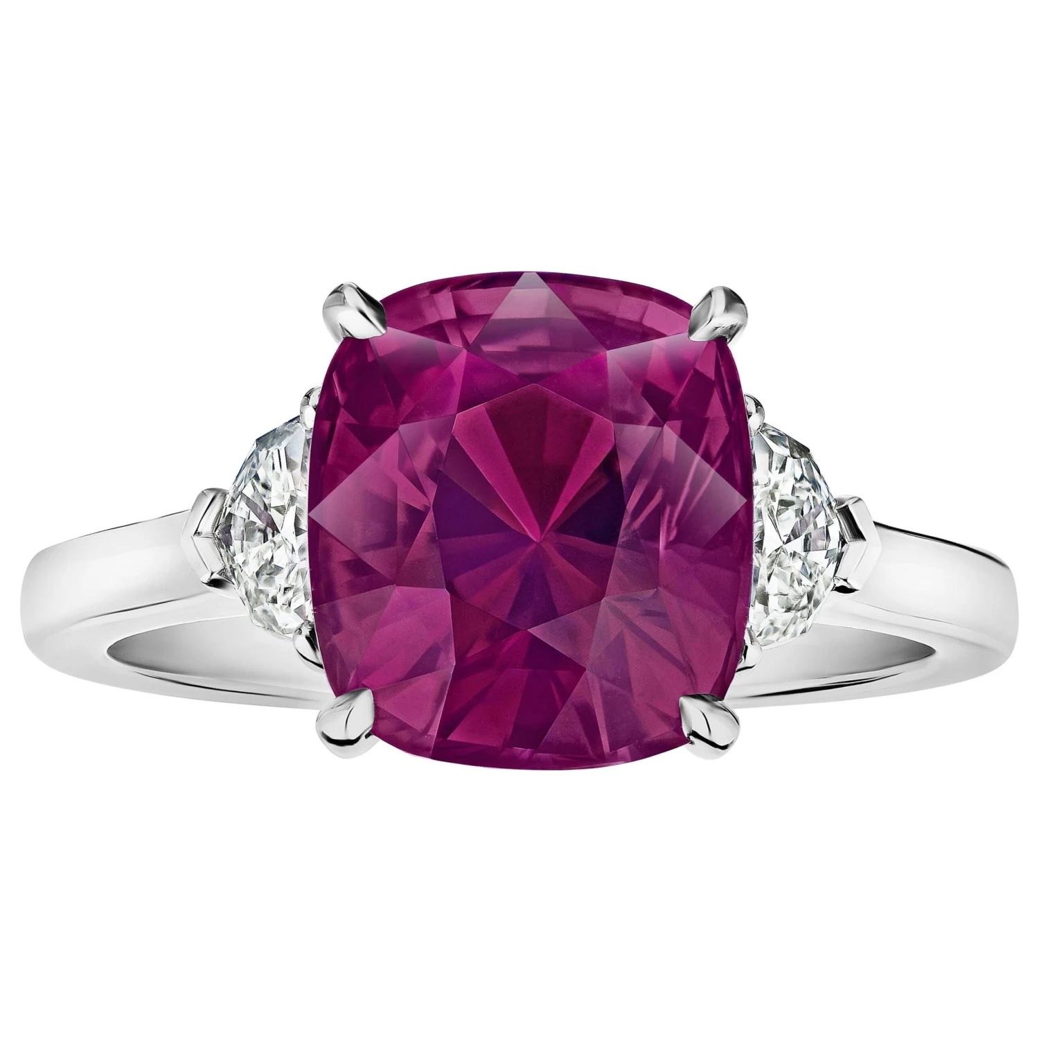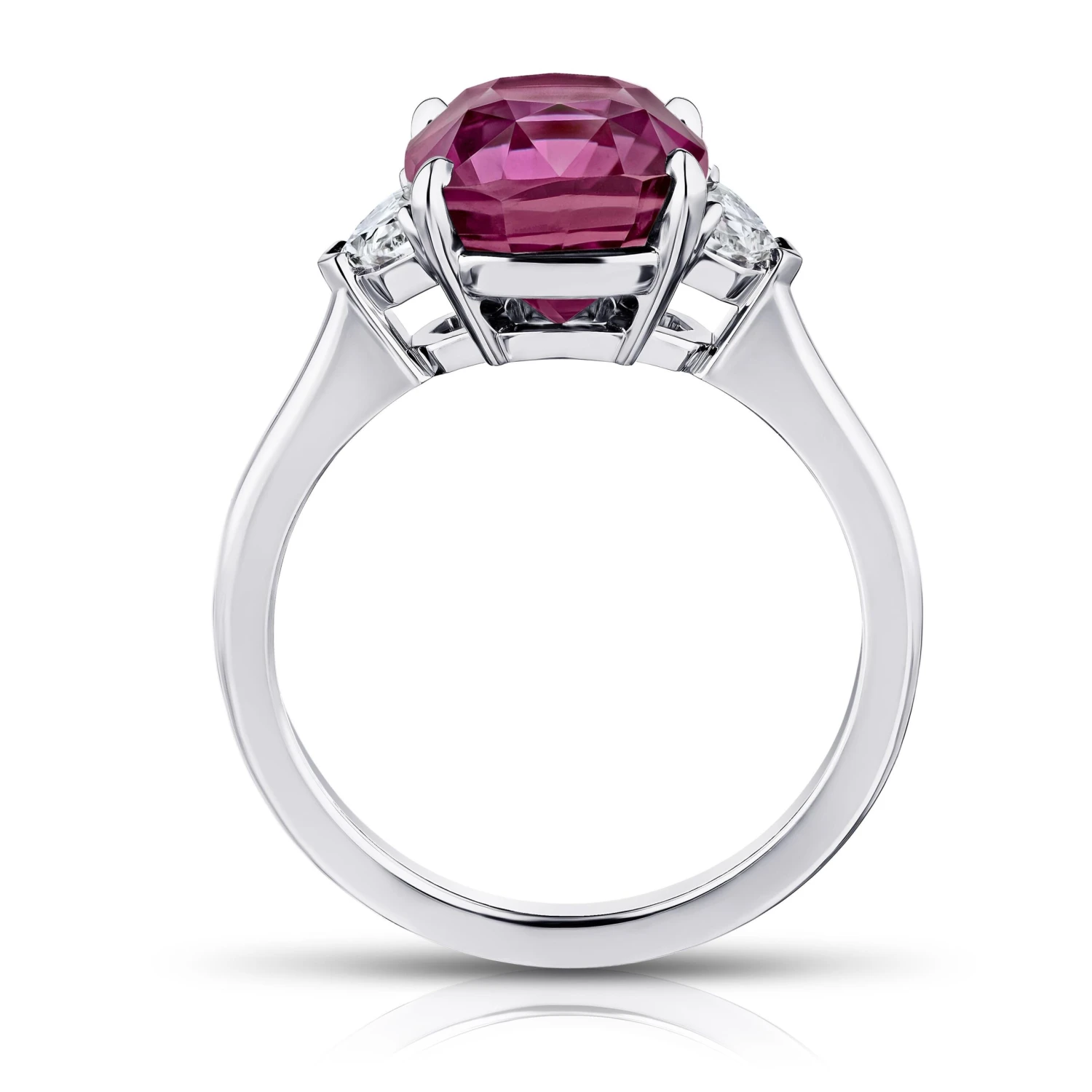 5.88 carat cushion pinkish red sapphire with epaulet cut diamonds .34 carats set in a platinum ring. Size 7. Resizing ring to your finger size is included.