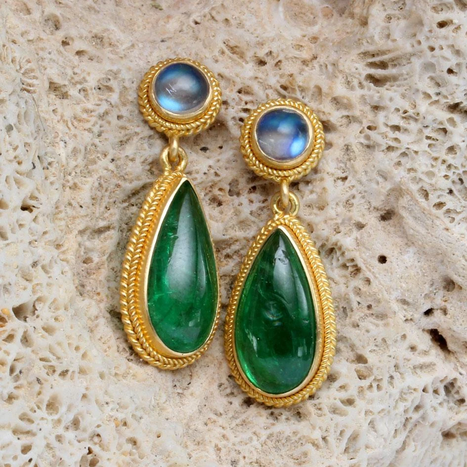 Two vivid bright green 7 x 14 mm pear shaped tsavorite cabochons glow below 5mm magical blue sheen rainbow moonstone cabochons, all wrapped in rich handmade large/small 18K gold twist wire decorated bezels in this opulent and eye-catching post earring design. Tsavorites this large are hard to come by! These earrings will be noticed and commented on by many. You will not be disappointed!