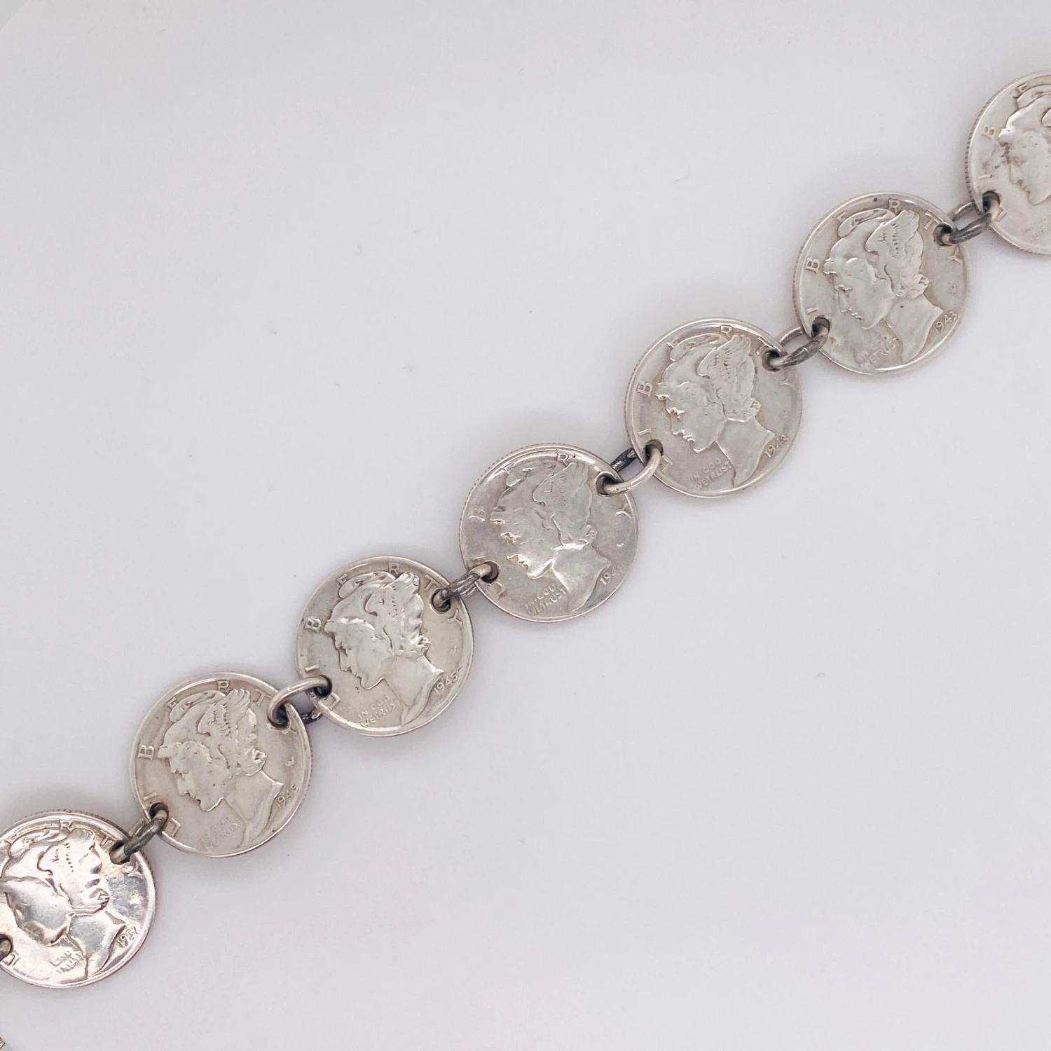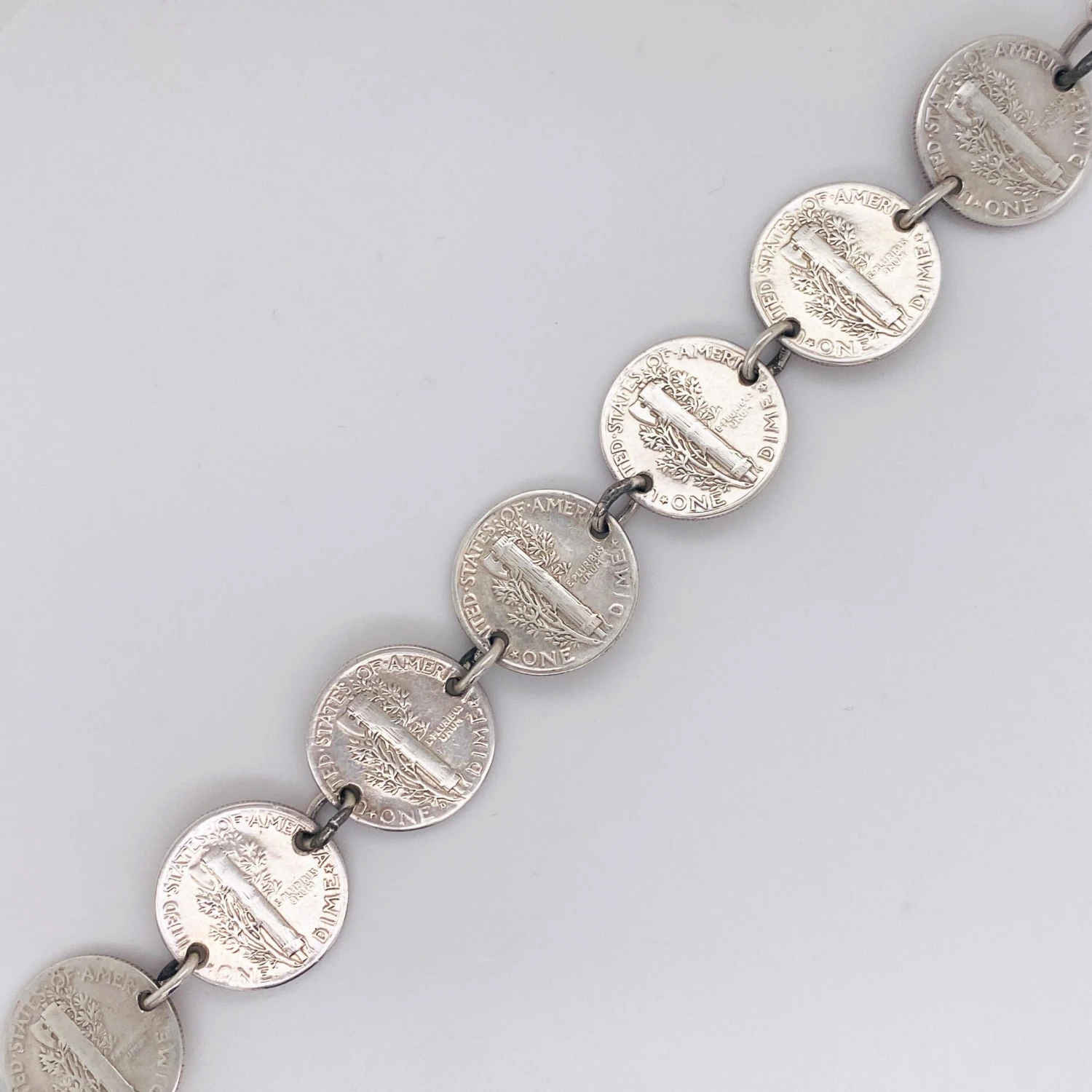 This sterling bracelet is one of a kind! It is made of seven mercury dimes that are held together by sterling silver jump rings. The bracelet has a sterling silver toggle clasp that is easy for putting on and off. This bracelet was designed for a small to extra small wrist as it only is 6.5 inches long. It will look great on you!
