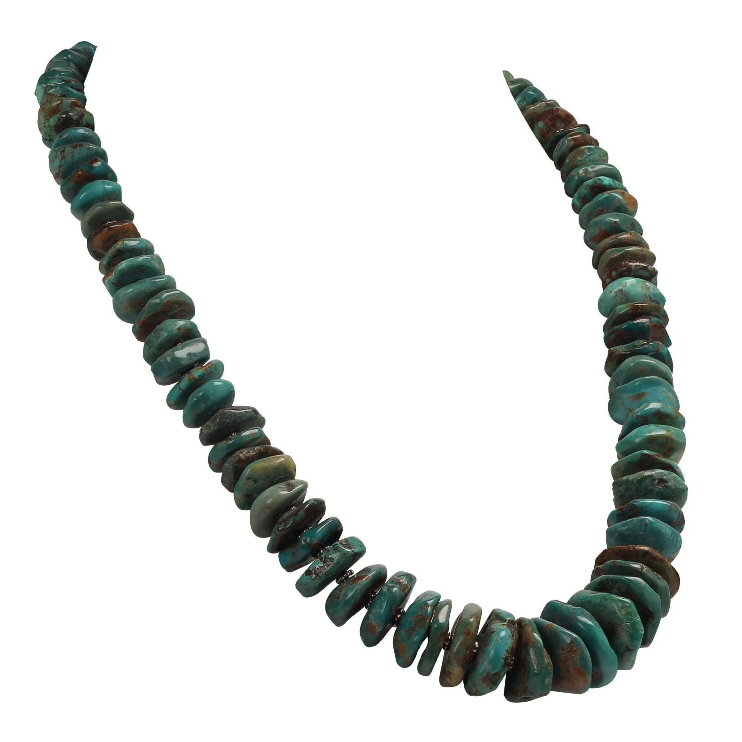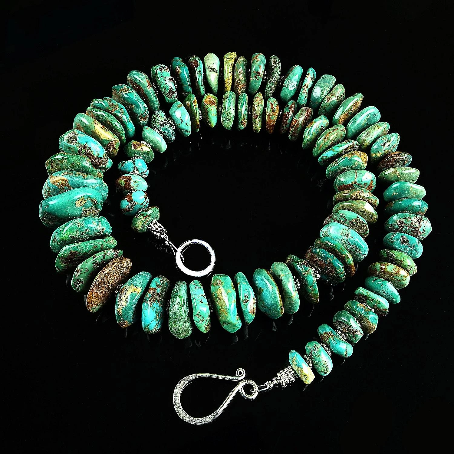 Custom made necklace of Natural Turquoise Graduated from 10 to 22 mm. This unique necklace is 22 inches in length and is secured with a silver tone hook. Lovely Turquoise in blue green and green and a bit of matrix. The Turquoise rondels are separated with fluted silver tone spacers. These Turquoise gems are polished and glow that warm, delicious blue green turquoise we all love.