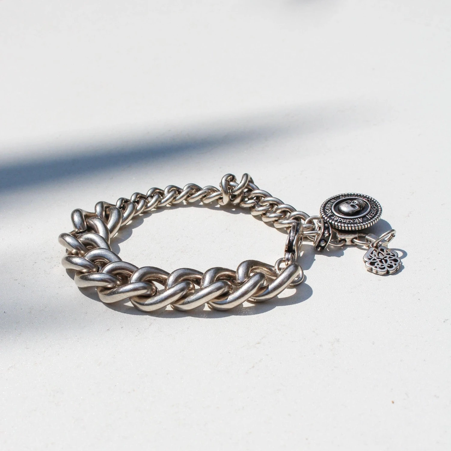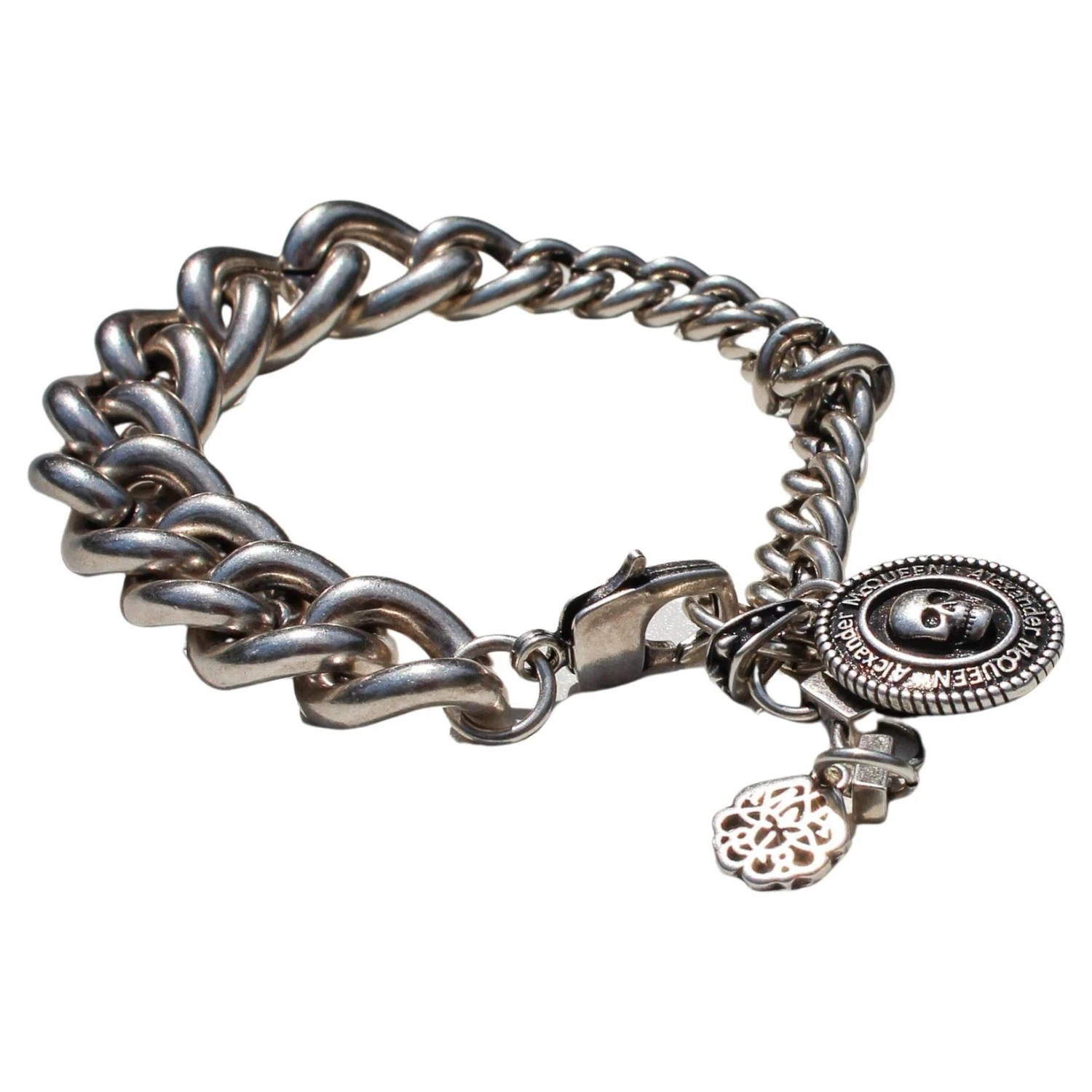 Channel your inner rebel with this pre-loved Alexander McQueen bracelet. Crafted with meticulous attention to detail, this bracelet features a striking silver plated twisted curb chain and a gothic skull charm that has become synonymous with Alexander McQueen, embodying his rebellious spirit.
