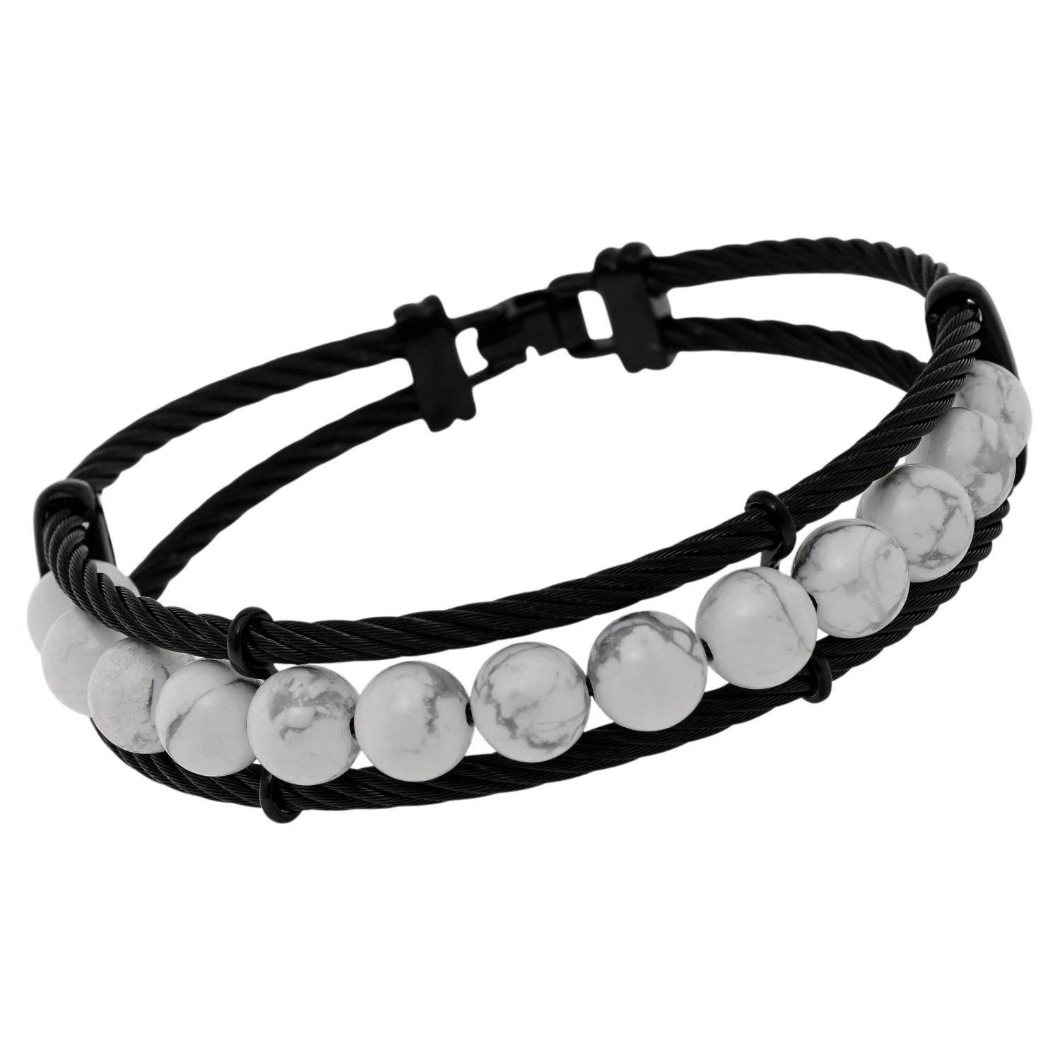 Alor stainless steel cable bracelet features two layers of black cable centered with howlite beads. The band width is 1/2″. The length is 8″. The weight is 32.7g.