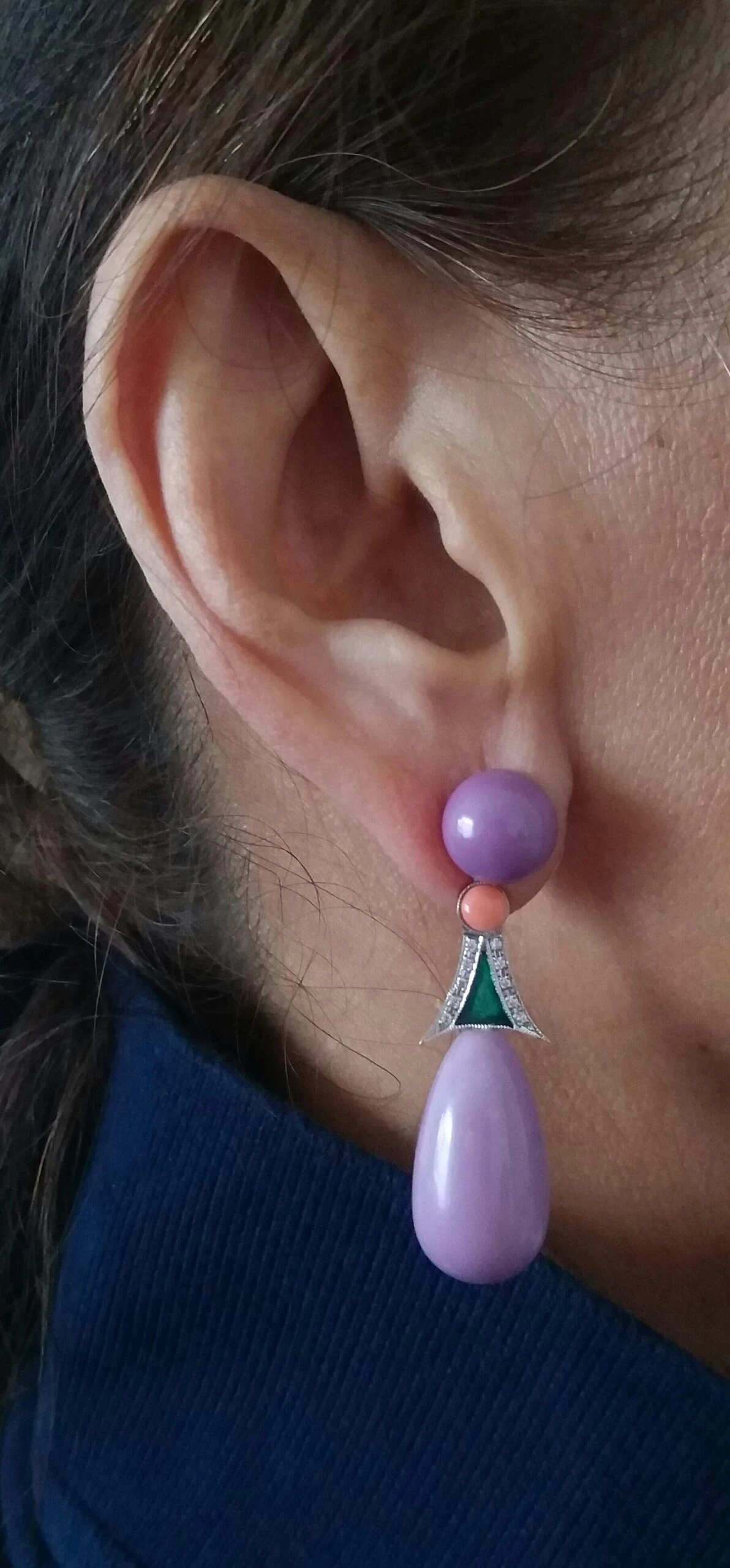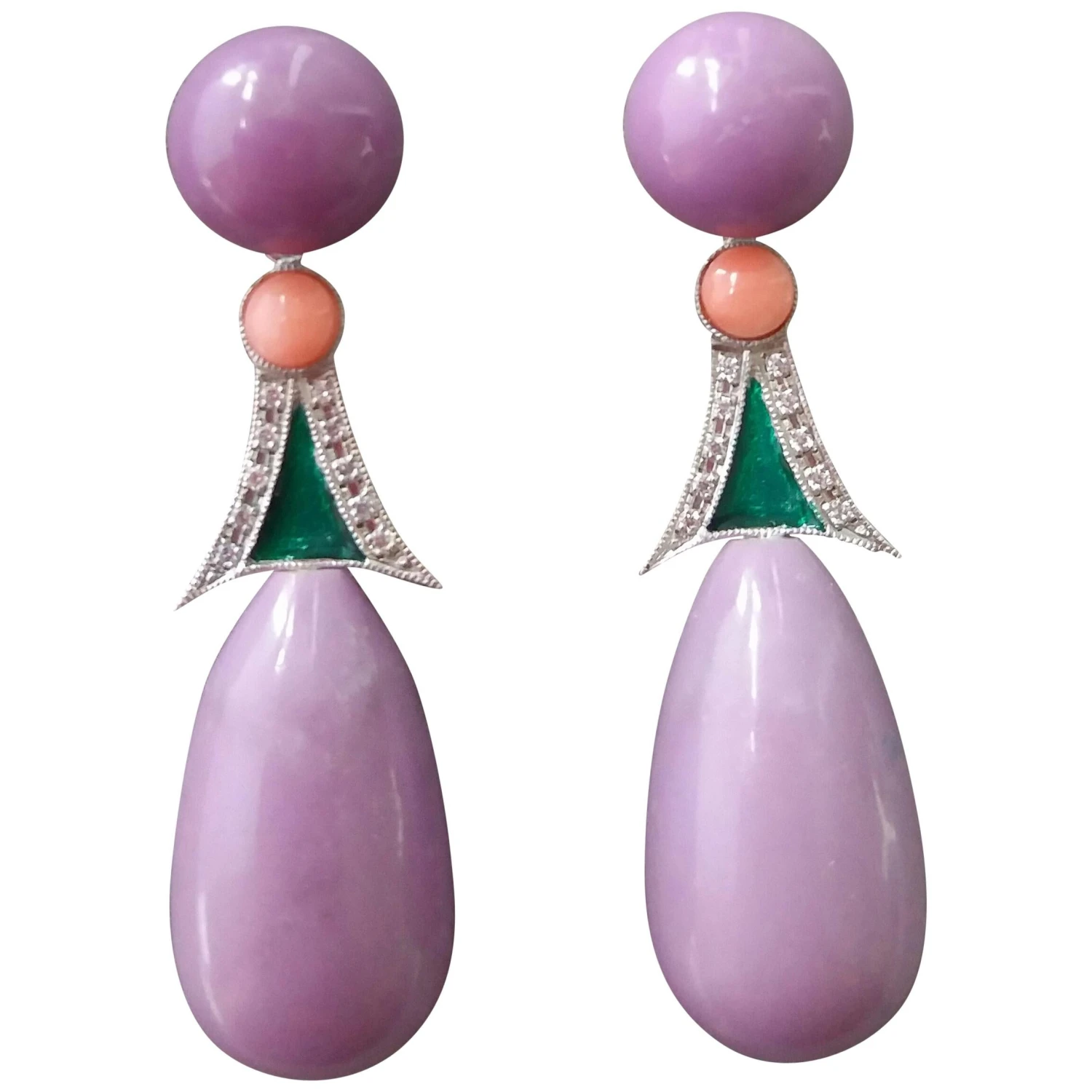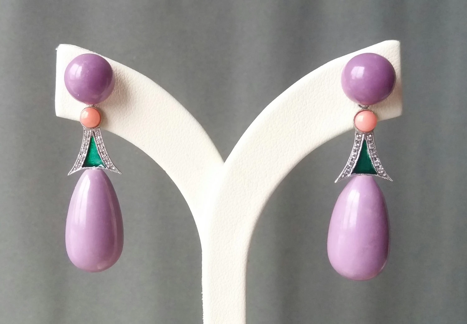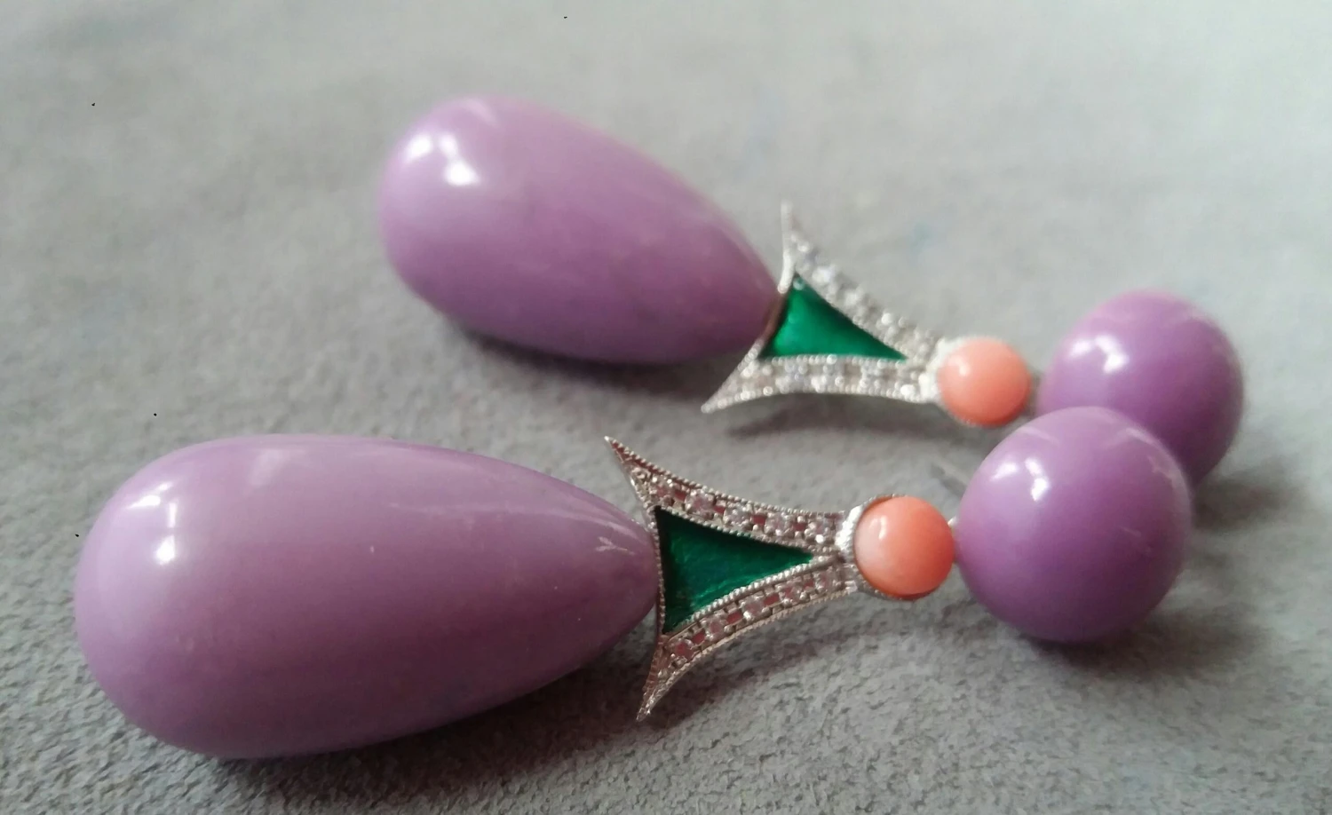 These earrings have the upper part consisting of 2 round Phosphosiderite buttons diameter 10mm.They support 2 white gold elements, diamonds, green enamel and 2 small pink Coral buttons, in the lower part we have 2 Phosphosiderite round drops measuring 12 x 24 mm.