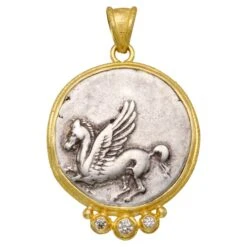 An authentic hand struck Corinthian silver « Stater » coin from 375-300 BC is set within a Steven Battelle designed handmade line textured double bezel with graduated « jawan » granulation and 1.8 to 2.4 mm VS1 white diamonds flashing below. The Corinth staters circulated extensively through the ancient Greek world. The opposite side of the coin features the goddess Athena, (the personification of wisdom and also courage). Pegasus is often associated with magic and wonder, and is seen as a symbol of the power of the imagination. Zeus transformed Pegasus into the constellation seen in the night sky. This pendant comes with a laminated coin certificate of authenticity. The handmade hammered chain shown is not included, but can be ordered additionally. We discount our chains 20% when ordered with a pendant.