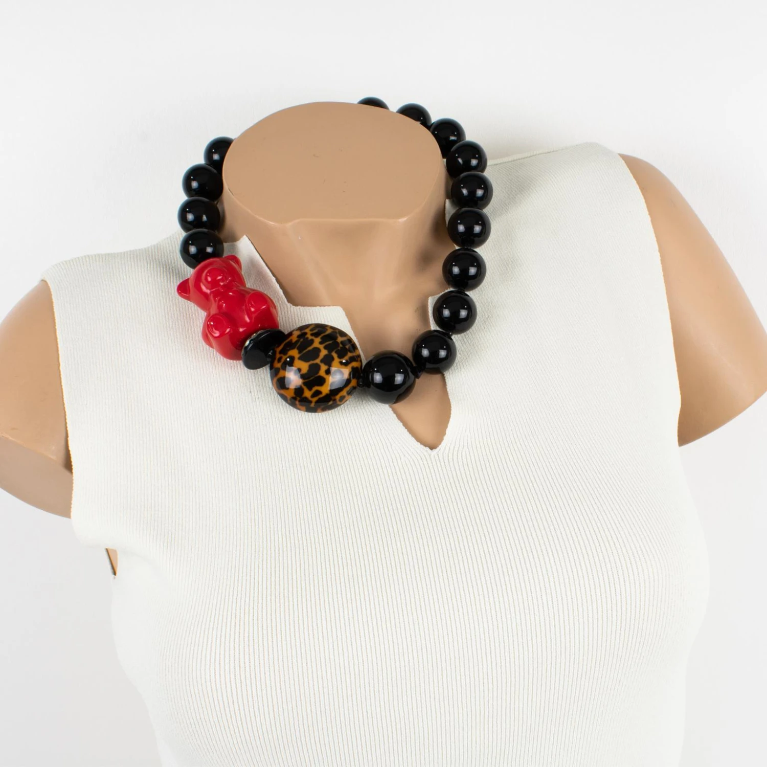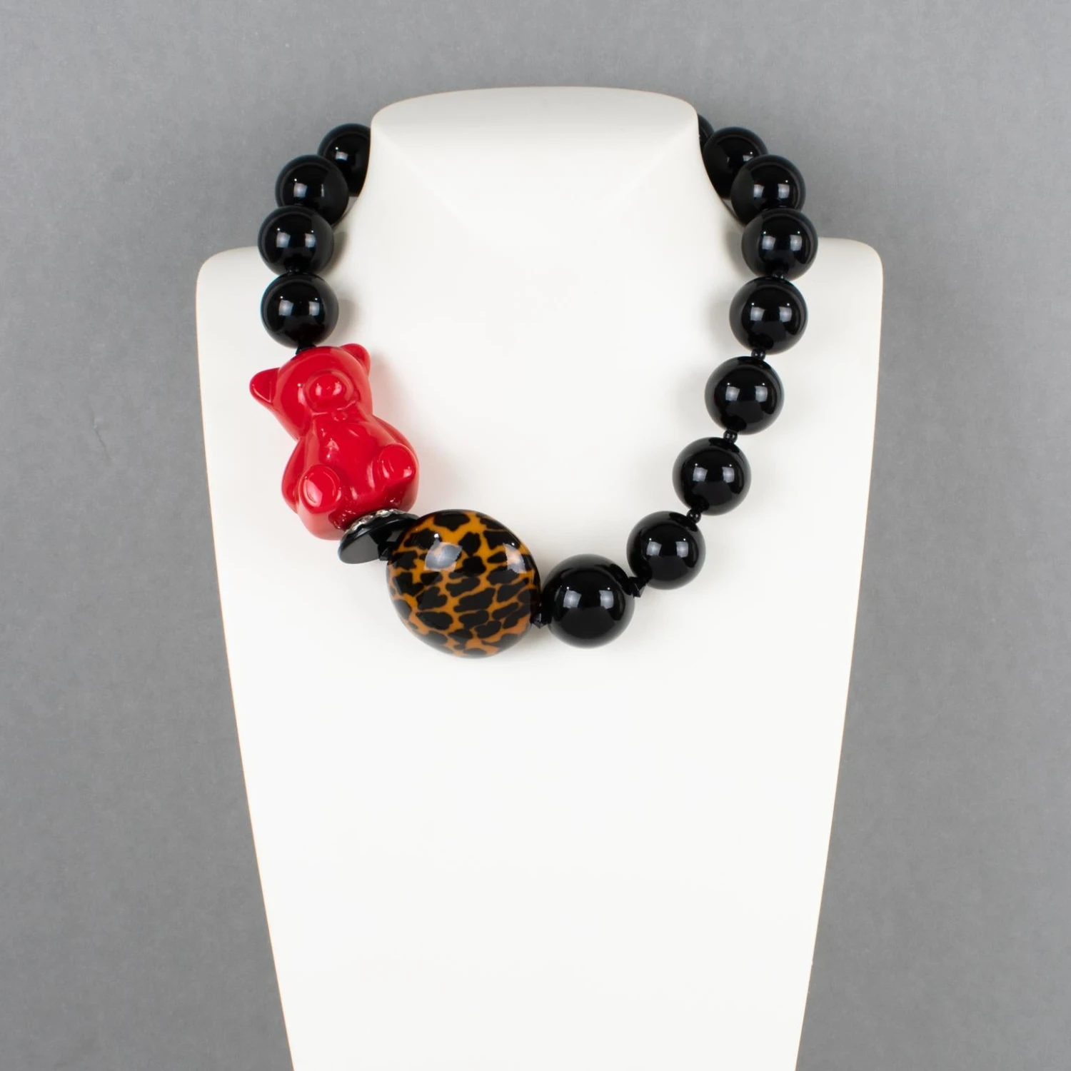 Angela Caputi designed this super cute resin choker necklace. This necklace features a set of rounded beads with a side-carved teddy bear and domed pebble elements and is working on black with bright red colors and tortoise-like color contrast. Her color combination is always extremely classy, perfect for casual and fancy occasions.