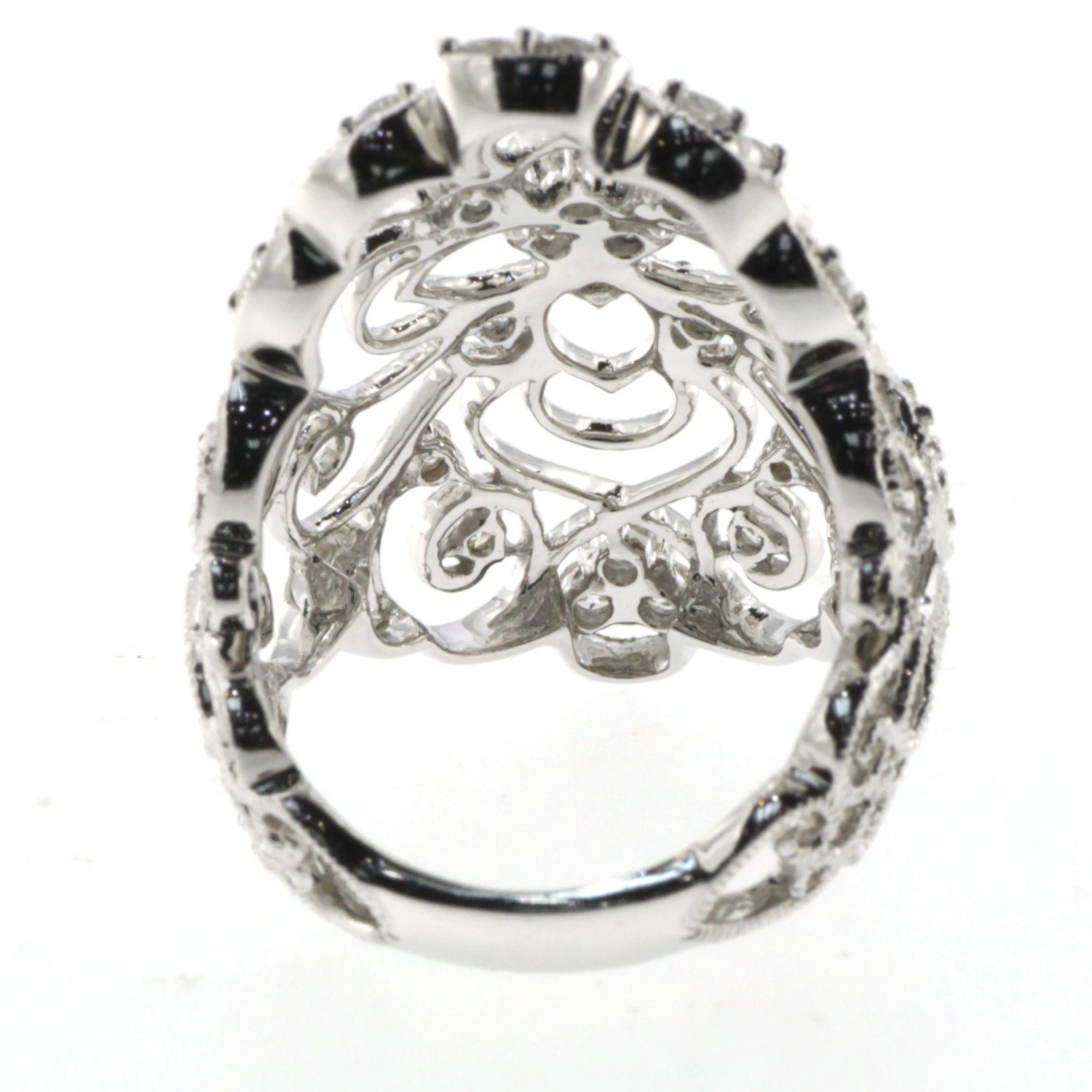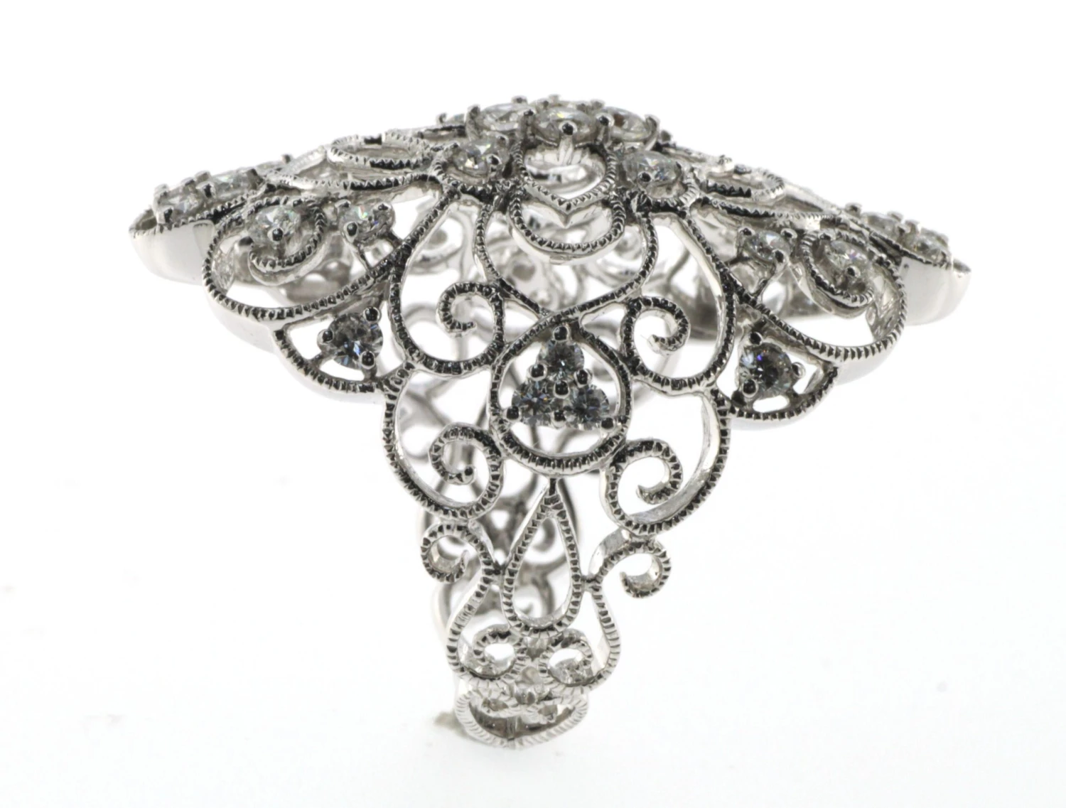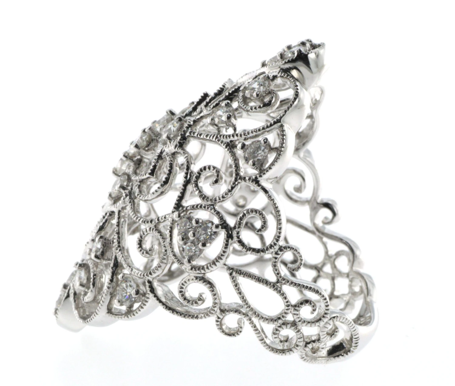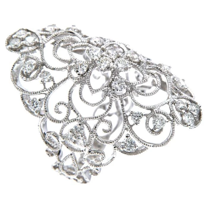 The intricate filigree bead edge detailing adds an extra layer of elegance and sophistication to the design, evoking the timeless beauty of antique jewelry. This ring set is crafted from premium 18k white gold, providing both a durable finish and a stunning complement to the sparkling diamonds.