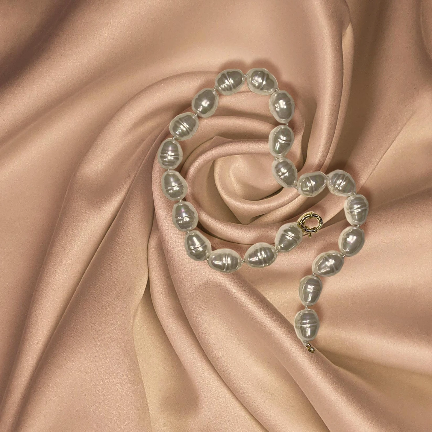 Baroque South Sea White Faux Pearl 16mm Pearl 18 Inch Necklace Hand Knotted Gilt Spring Clasp- Very real looking handmade faux pearls with beautiful white South Sea look pearly coating. Generous easy 18 inches long