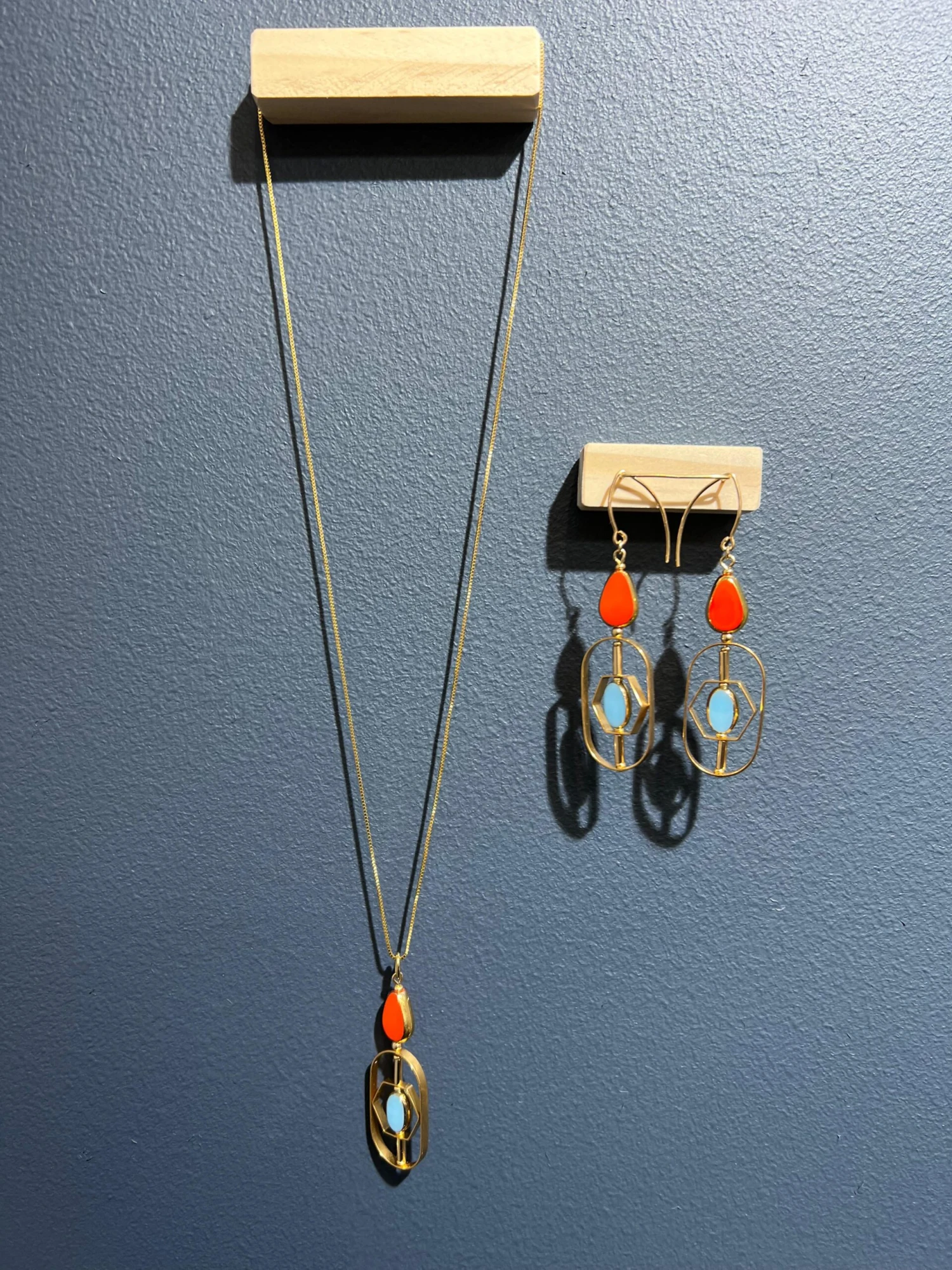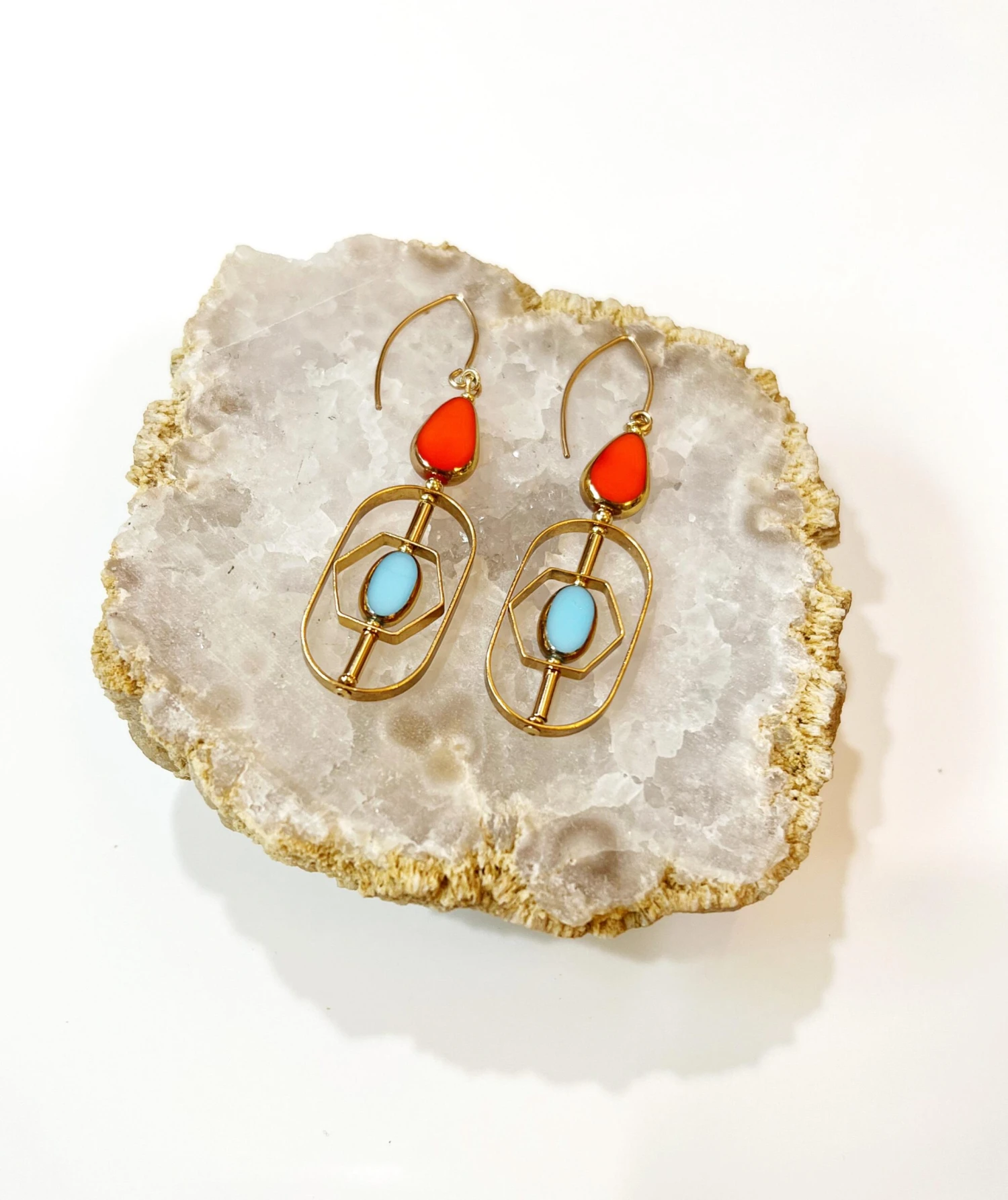 The earrings consist of an orange teardrop and a baby blue oval shaped beads. They are new old stock vintage German glass beads that are framed with 24K gold. The beads were hand pressed during the 1920s-1960s.