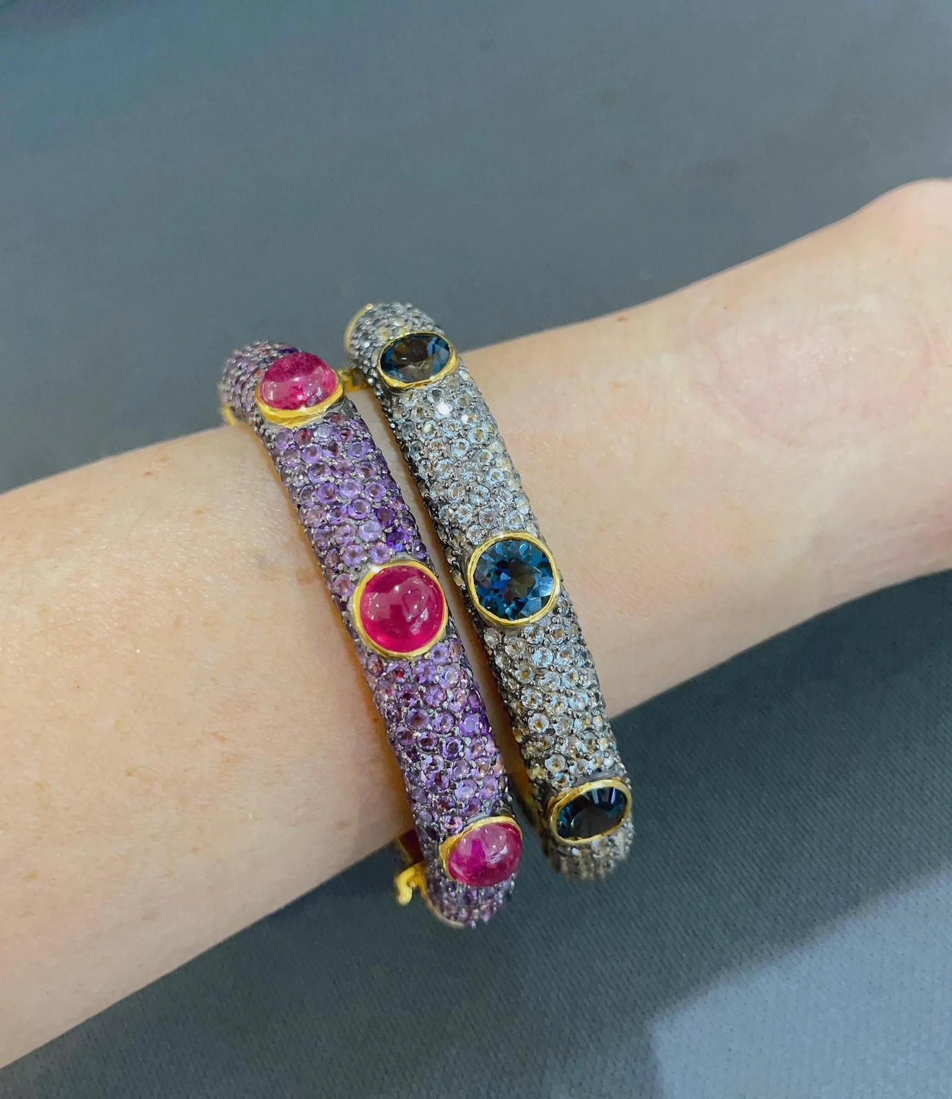 We made a this special Bangle for our traveling collection called “Capri” The collection is set in 22 Gold & Silver – And has Natural Gem stones, like Ruby, Emerald, Fancy color Sapphires and Baroque white south sea natural pearls.