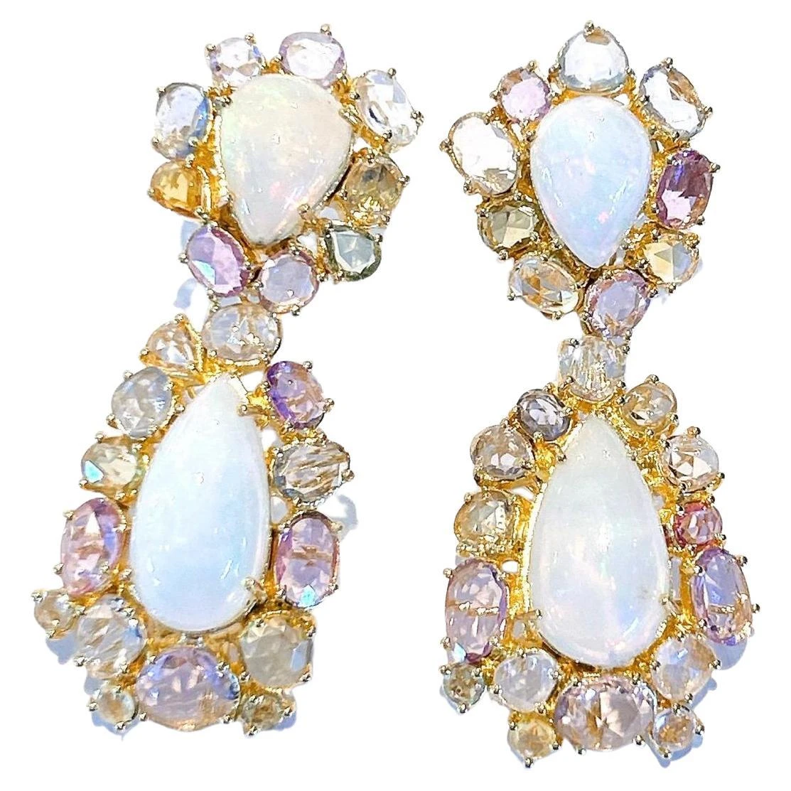 Bochic “Capri” White Opal & Multi Rose Cut Fancy Color Sapphires Earrings Set In 18K Gold & Silver