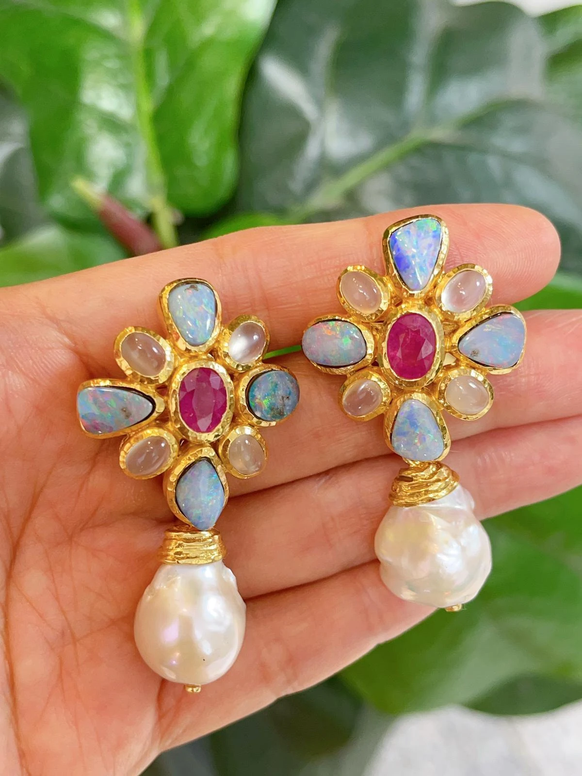We made this Earrings for a special traveling collection for Bochic called “Capri” The collection is set in 22 Gold & Silver and has Natural Gem stones, like Ruby, Emerald, Fancy color Sapphires and Baroque white south sea natural pearls. The collection is perfect Day to night, You will add a little something extra to your favorite caftan, swim wear or evening wear.
