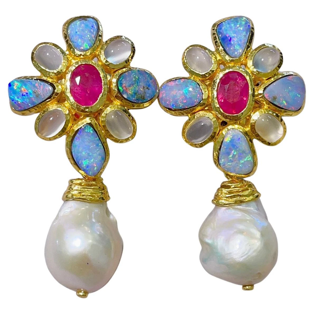 Bochic “Capri”, Ruby, Blue Opal & Moonstone Earrings Set in 22 Gold & Silver
