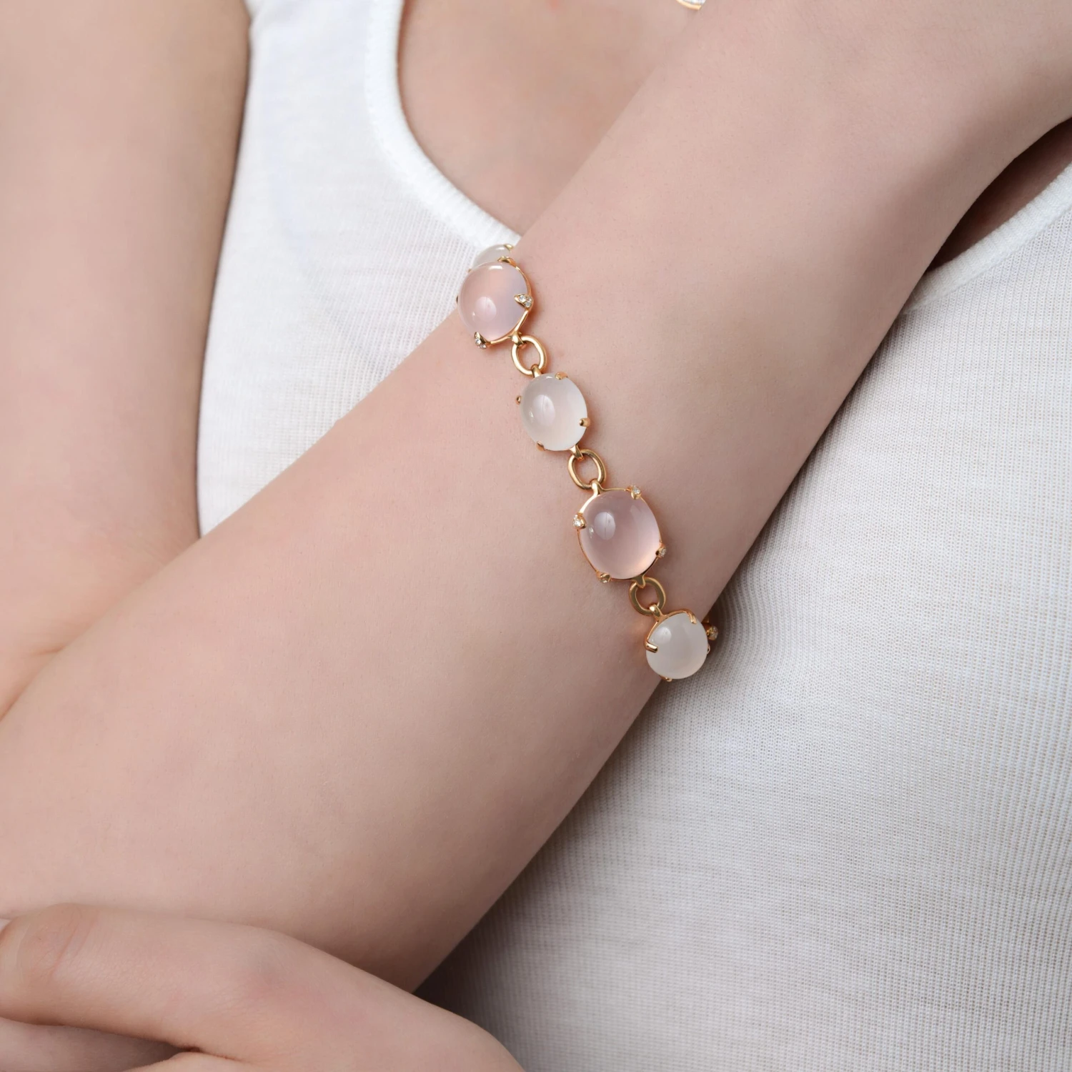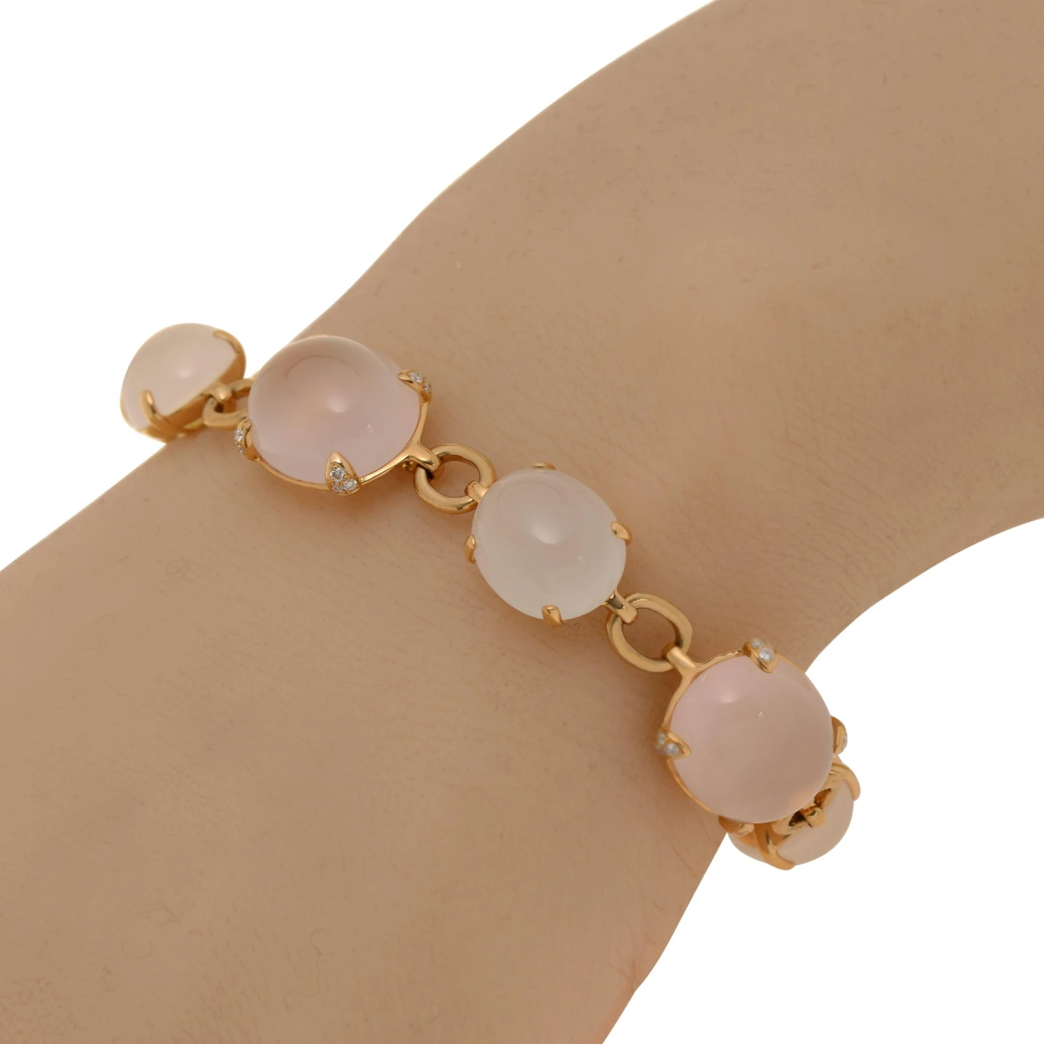 Bucherer 18k rose gold link bracelet features 0.29ct. tw. brilliant cut diamonds with 28.54ct. tw. white quartz and 38.95ct. tw. rose quartz. the bracelet thickness is 9mm. the length is 7″. the total weight is 32.5g.