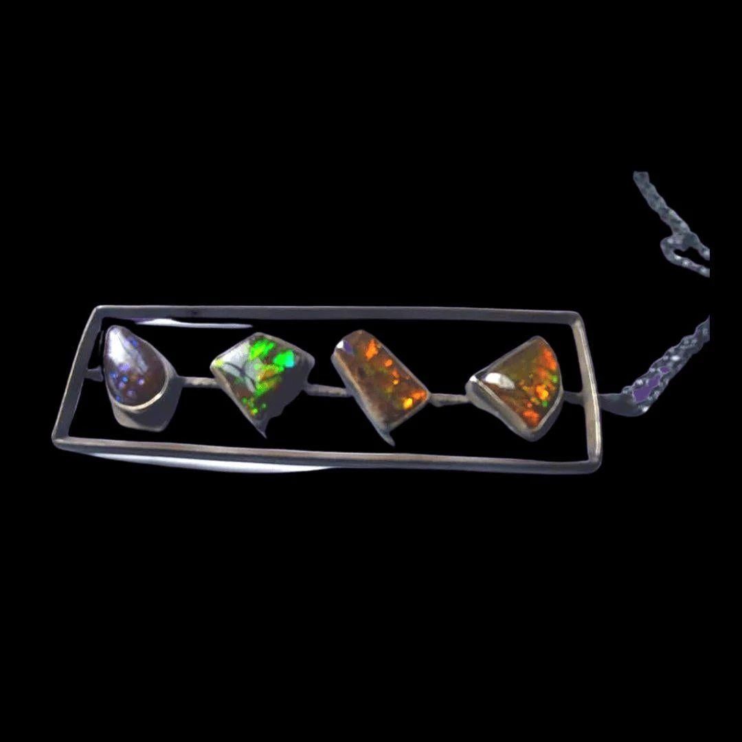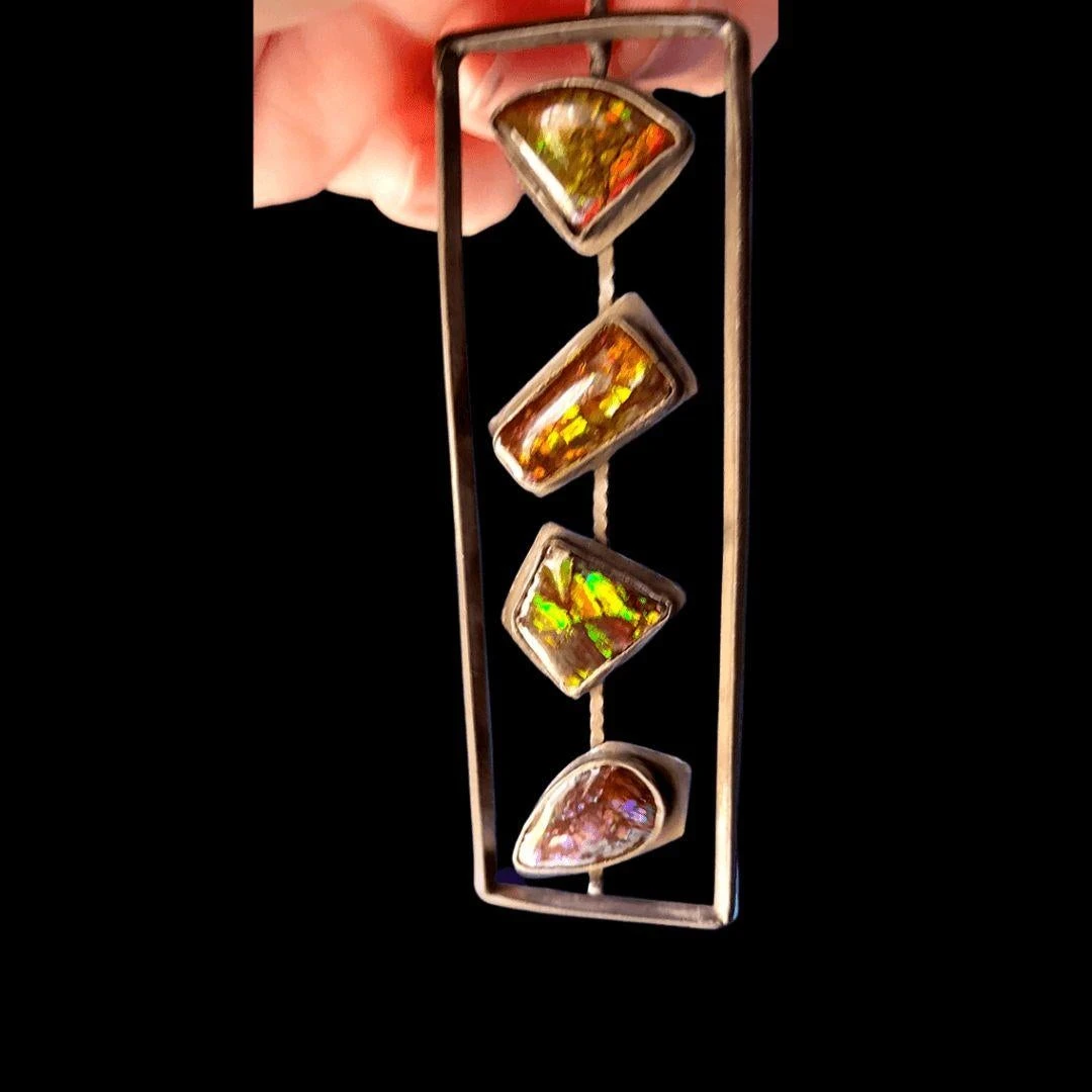 Introducing the Canadian Ammolite Silver Ladder Pendant, a new must-have fashion addition that’s sure to turn heads. This contemporary pendant is crafted from oxidized Sterling Silver, which gives it an attractive modern look. But what really sets this piece apart is its four flashy fluorescent Ammolite cabochons. This gemstone has been prized since ancient times for its unique beauty and variety of hues that range from deep red to intense green. Not only is it visually stunning, but Ammolite is also known to bring good luck and positivity to its wearer. Whether you’re looking for a special gift or something stylish for yourself, this gorgeous Ladder Pendant is sure to be appreciated by all who see it. Get yours today and experience first-hand why so many people love this wonderful piece of jewelry!