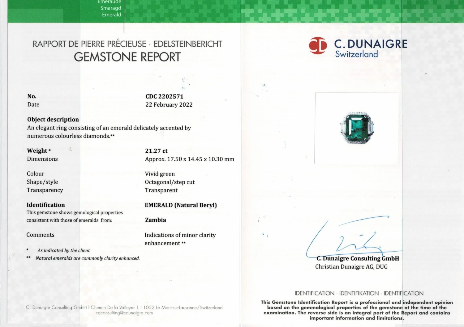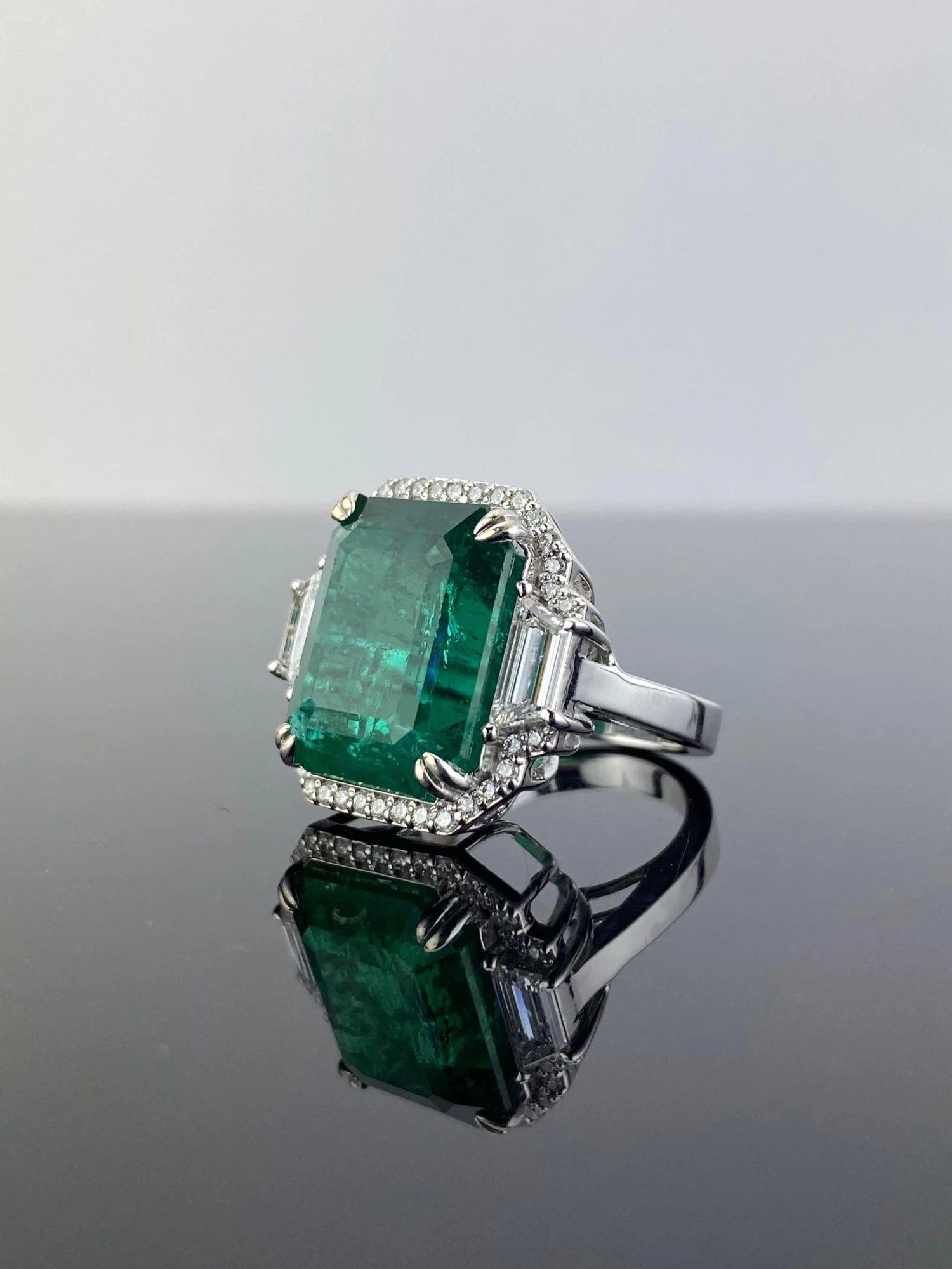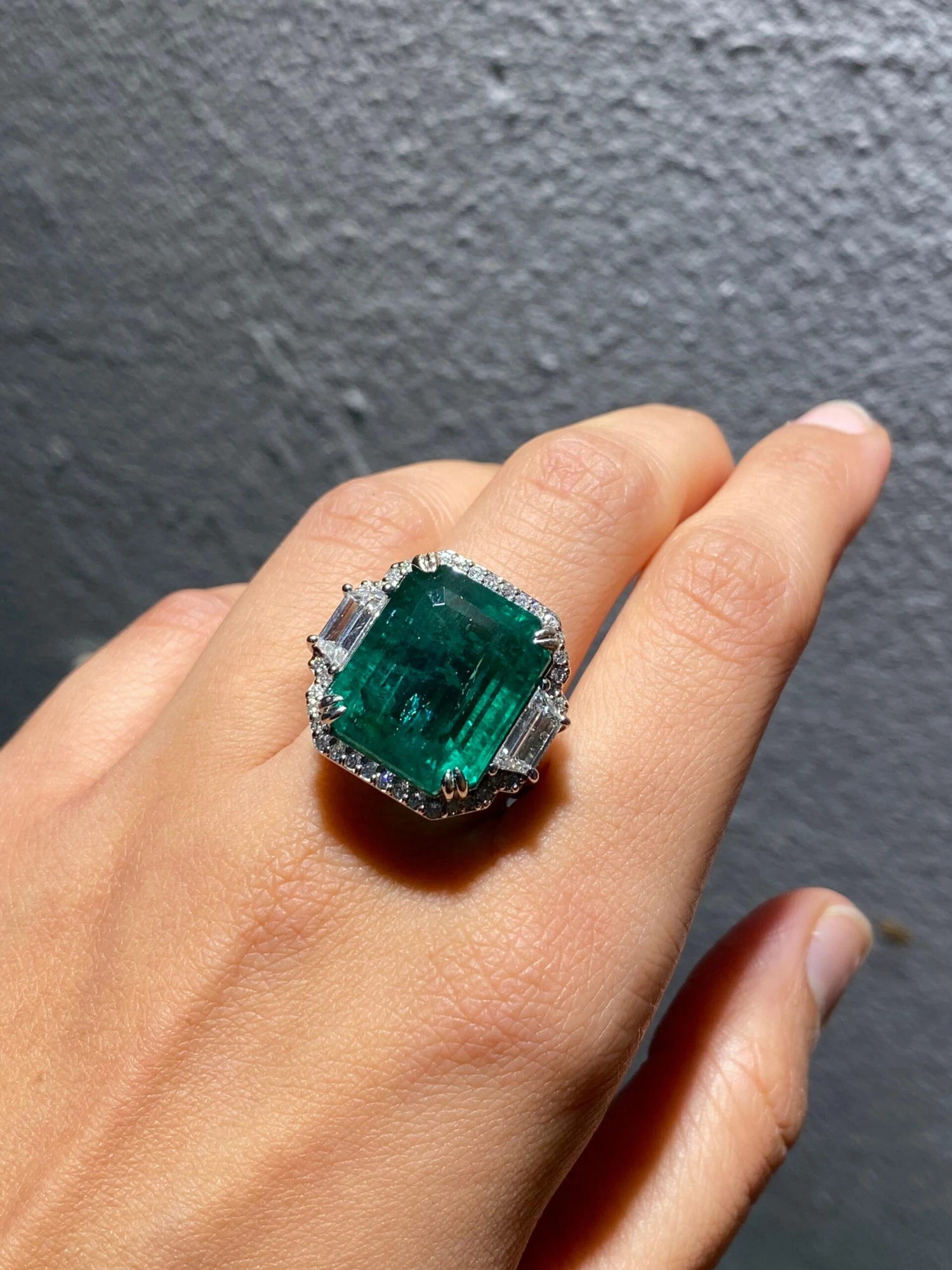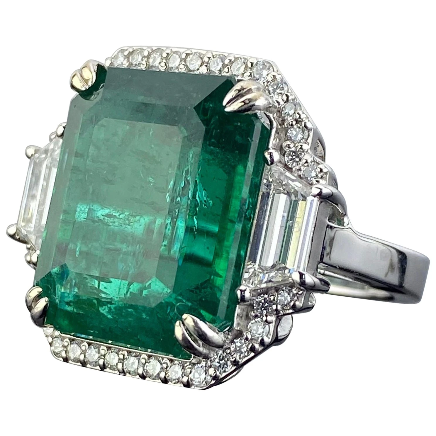 An exceptional natural 21.27 carat Zambian Emerald and 0.94 carat trapeze shaped VS quality White Diamonds three-stone cocktail ring, with a border of 0.46 carat White Diamonds. The centre stone, is definitely one of a kind, collectors item – transparent with an amazing vivid green color, and luster. All stones are natural, with no dye/treatment, and are set in solid 18K White Gold. Currently sized at US7, can be resized.