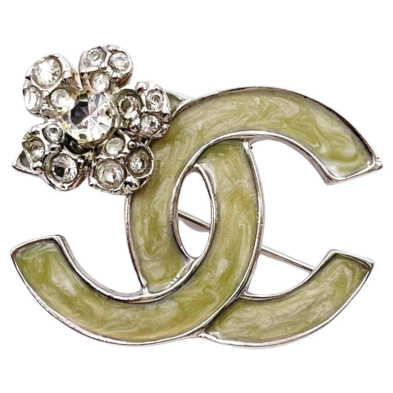 Chanel Silver CC Mint Enamel Corner Crystal Flower Brooch