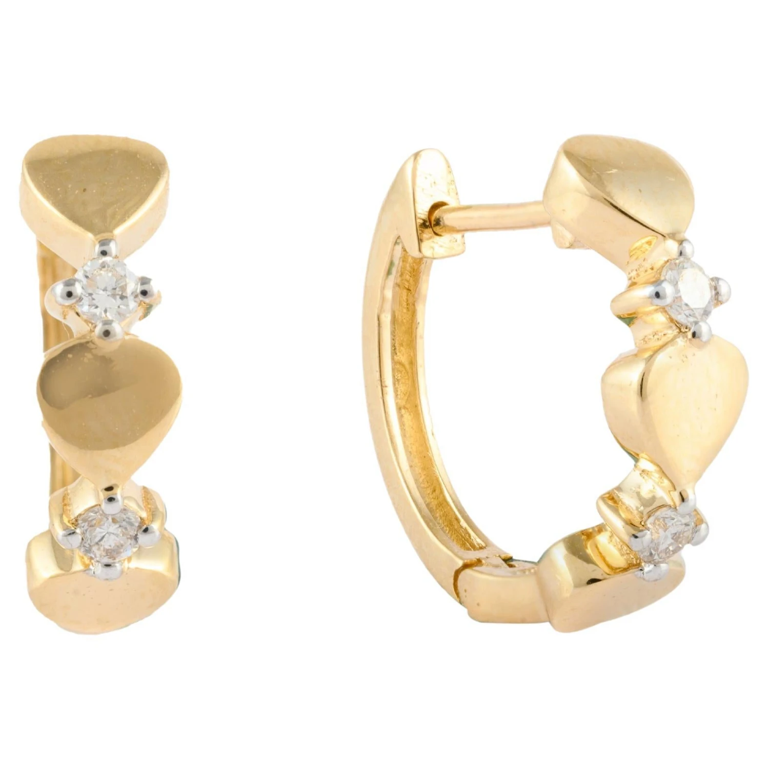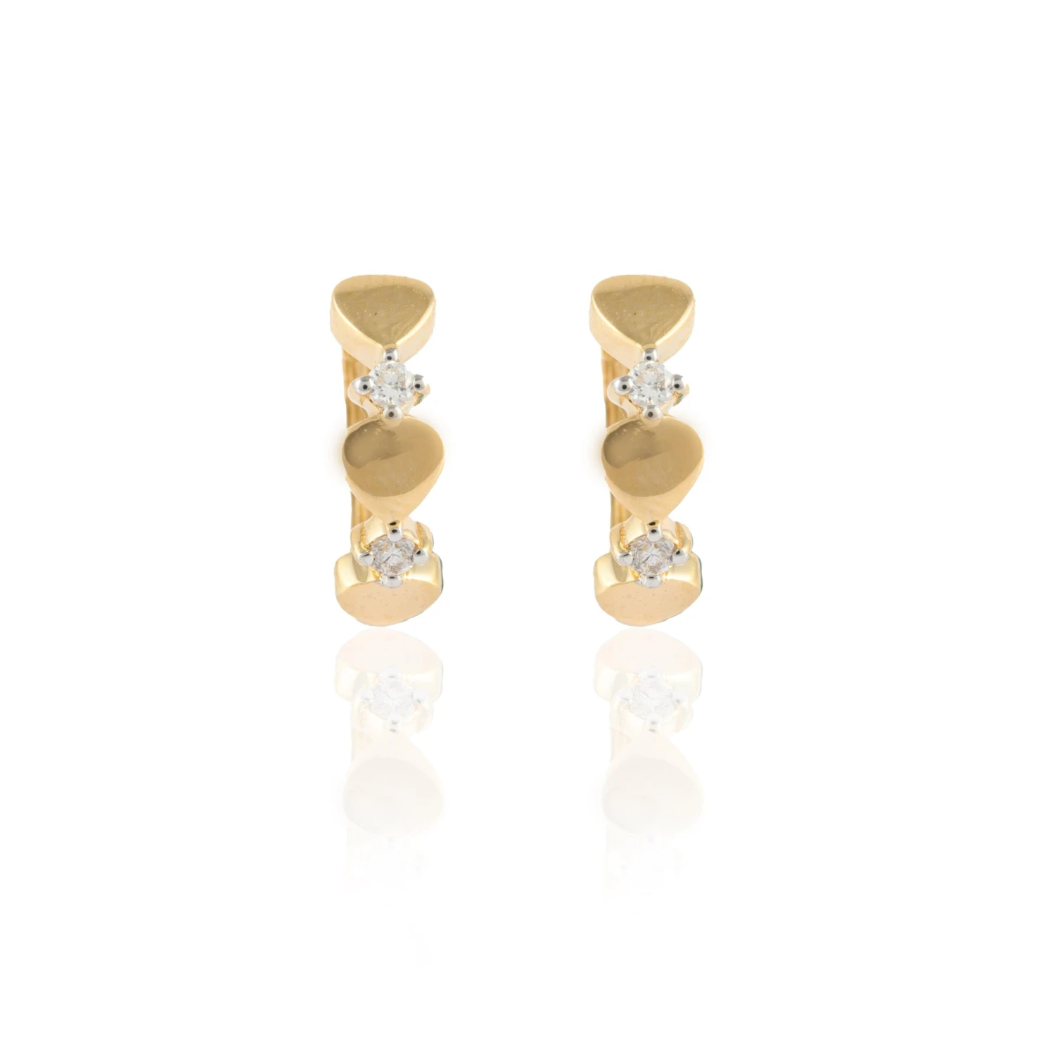 Designed with round cut diamonds studded between gold heart in prong setting. This beautiful handcrafted diamond huggie earrings are great birthday gift or anniversary gift or bachelorette gift for anyone on your list.