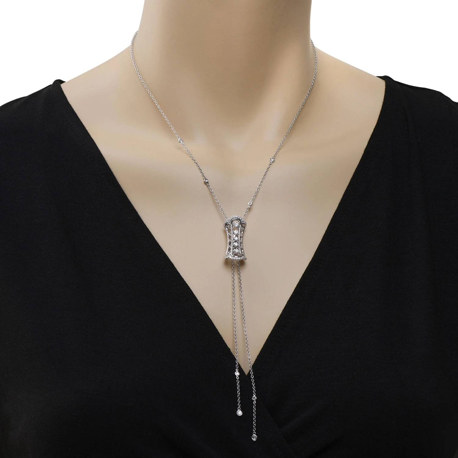 Damiani 18K white gold lariat necklace features a glittering combination of round brilliant cut prong set, shared prong, and bezel set 0.81ct. tw accent diamonds. The total length is ~26″ and can be worn at 16″ with the drop (~5 3/8″). The weight is 12.2g.