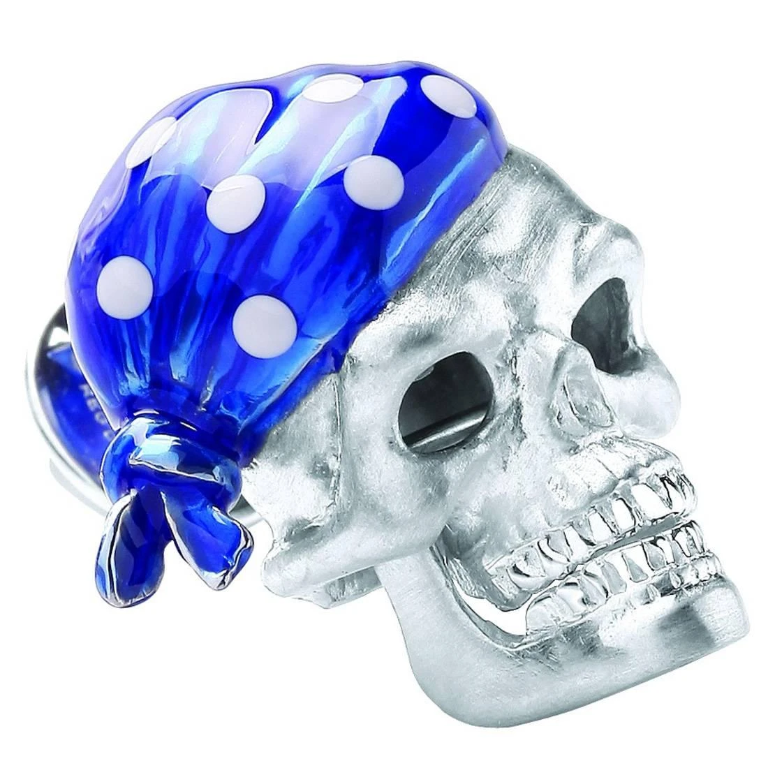 This sterling silver skull bandana lapel pin is enameled in blue and has a moving jaw and popping sapphire eyes.