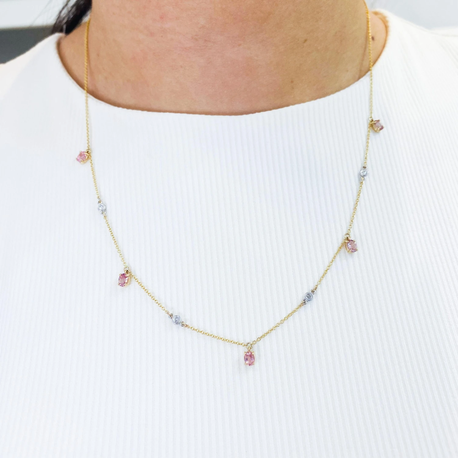 Add a touch of dainty elegance to your jewelry collection with this delightful pink tourmaline and diamond necklace! Tourmaline is one of October’s birthstones! Celebrate an October loved one with this perfect gift to mark a graduation, anniversary, birth, or important milestone! The white gold diamond bezels alternating with bright and cheery pink tourmaline ovals creates an enchanting pattern along the yellow gold chain! This necklace would be wonderful worn alone or stacked with other favorite chains and pendants and the colors are lovely year round! The total weight of the pink tourmalines is 1.15 carats and the diamonds are 0.06 carats on the 18.5 inch necklace. This fabulous necklace was made by our designers here at Austin’s Five Star Jewelry! If you like this piece but want your own take on it, we could make a beauty like this for you with your choice of gems in many colors and shapes! Reach out and see what we can do for you!