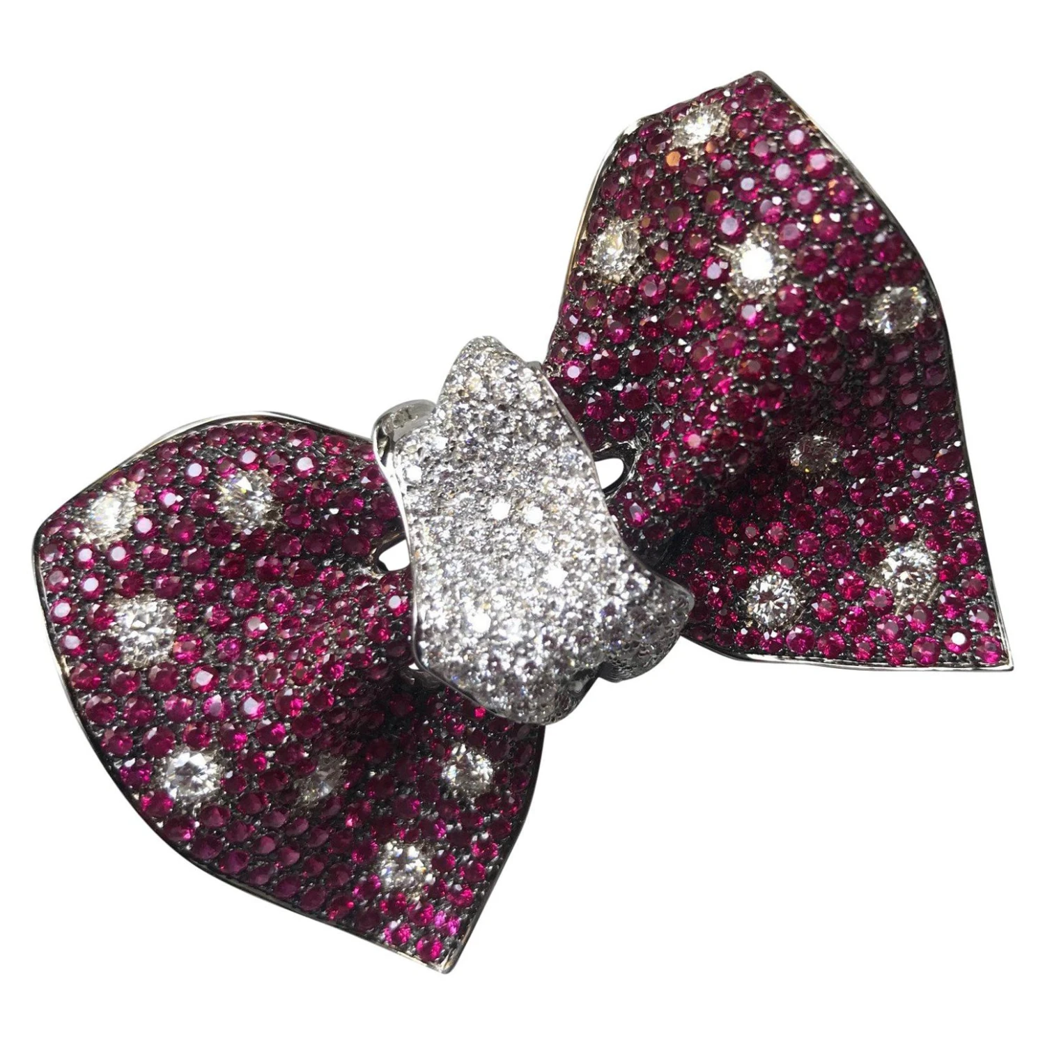 The bow brooch is set with 110 diamonds for total ct 4,72 and n.447 rubies for total ct 16,51