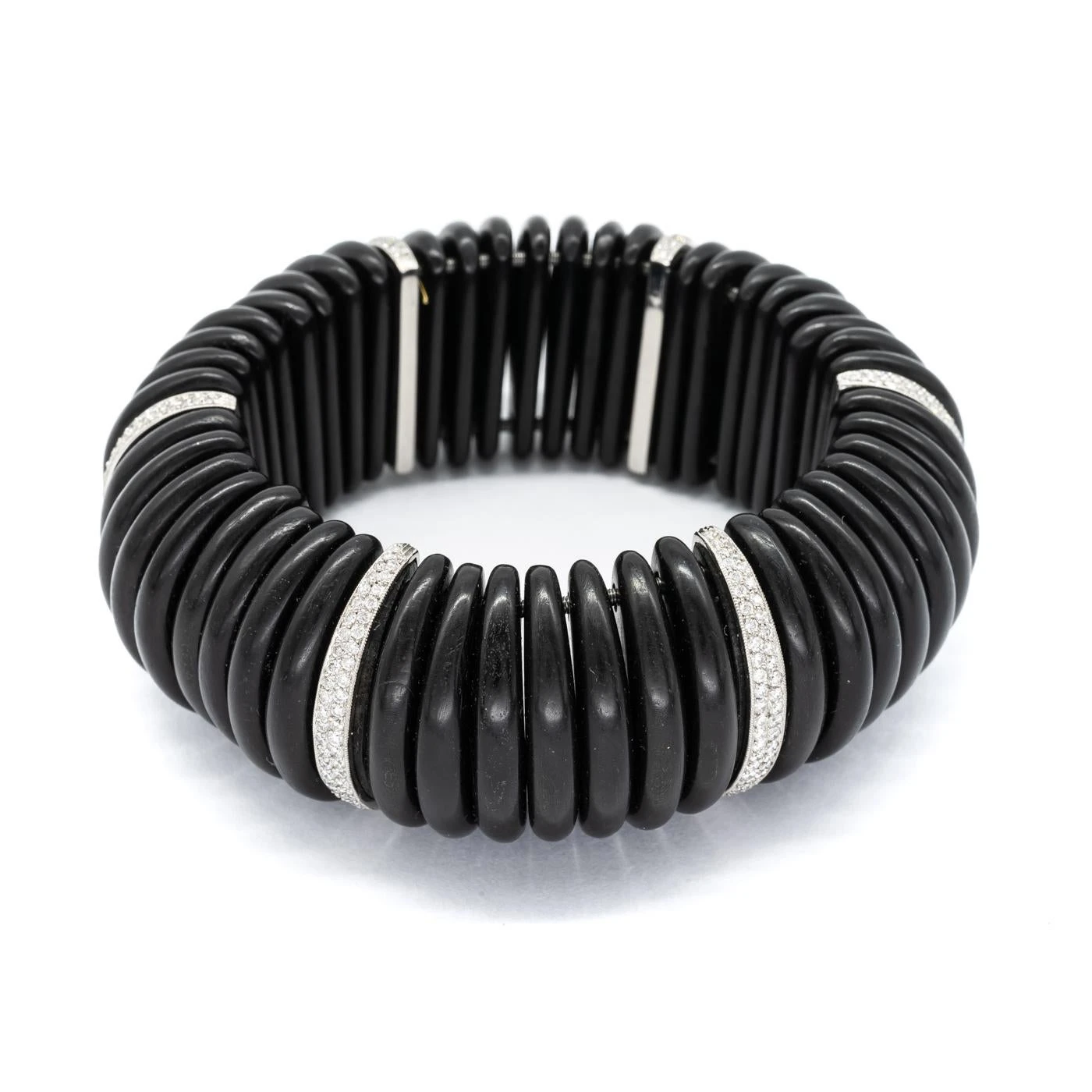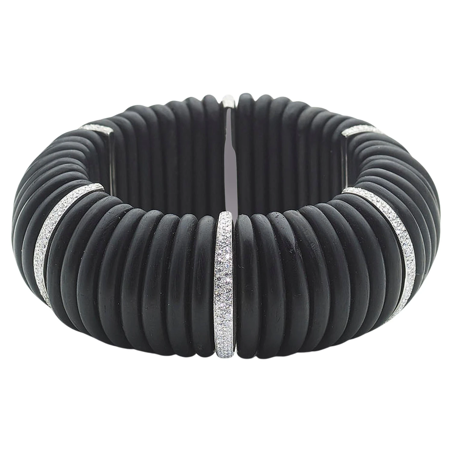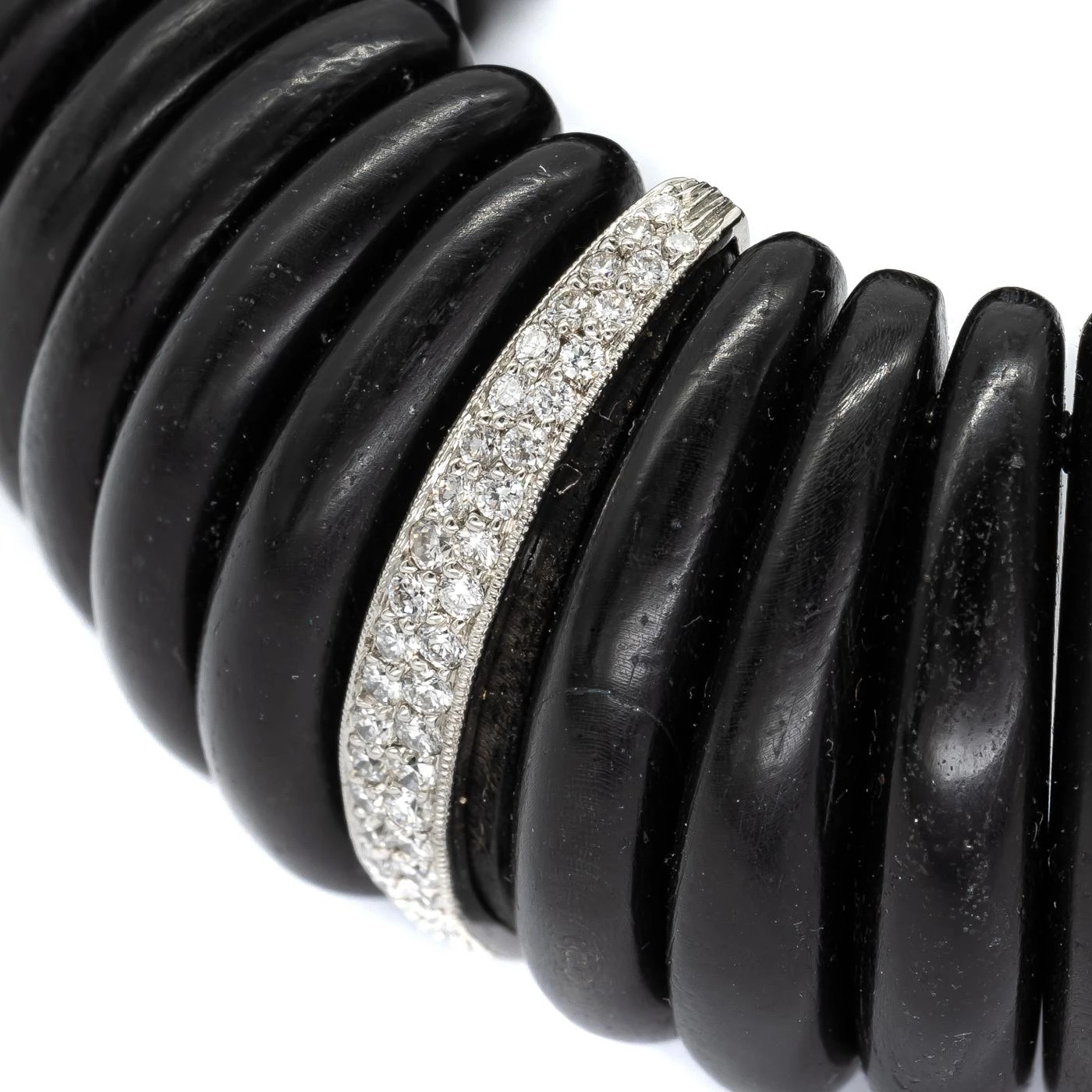 An ebony and diamond cuff bracelet, designed as a repeating pattern of eight, ebony segments, spaced by a diamond link, which is pavé set with two rows of graduated, round brilliant-cut diamonds, in platinum settings, weighing an estimated total of 2.75ct, on stainless steel springs.