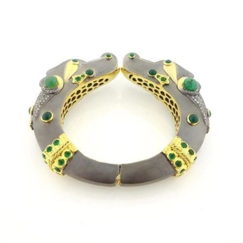 Dragon Bracelet containing emerald mix of about 12.00 carats and round diamonds of about 4.49 carats. All stones are set in 14k yellow gold and silver. Total weight of the bangle is approximately 91.67 grams (1.20g of gold and 90.47 of silver).