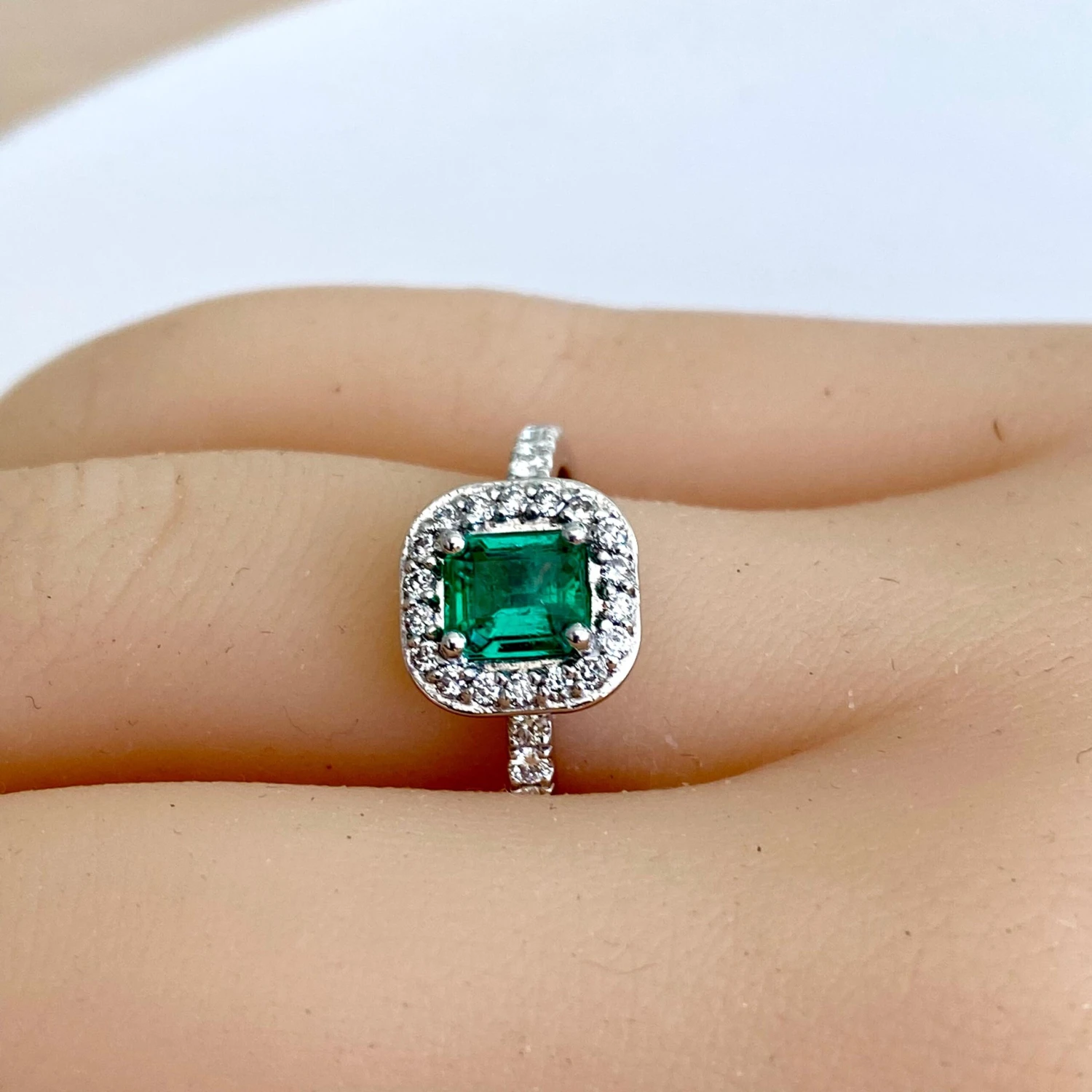 An emerald shaped Colombia emerald diamond platinum ring is a type of jewelry piece that features a rectangular or square-shaped emerald cut from a Colombian emerald, a type of emerald that is highly valued for its rich, vivid green color and exceptional clarity. The emerald is typically the centerpiece of the ring and is surrounded by a halo of smaller, high-quality diamonds that accentuate its beauty and sparkle.
