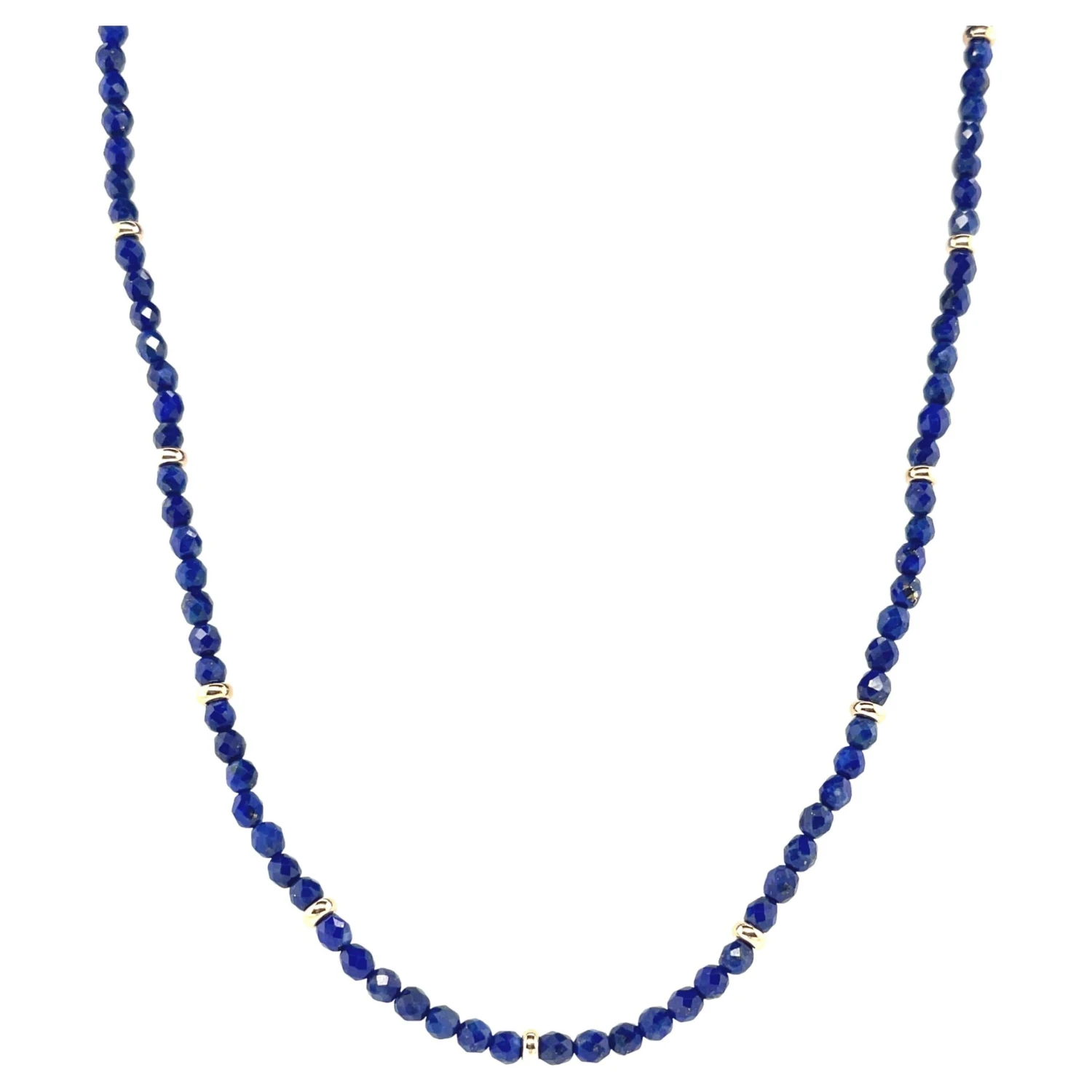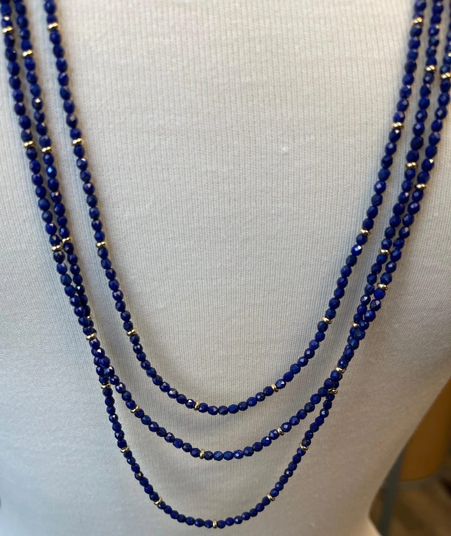 Note: This necklace was photographed nesting with additional lapis strands of different lengths. The price shown is for one individual strand. This strand (NCK-1198) measures 34 inches in length. Additional strands, NCK-1197 measures 32 inches in length, and NCK-1199 measures 36 inches in length. Each strand is sold separately.