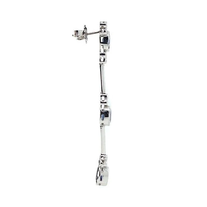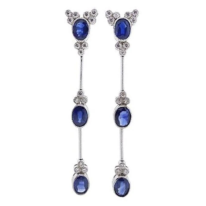 Dangle earrings containing 6 fine blue oval sapphires of about 6.95 carats and 30 round brilliant cut diamonds of about 0.75 carats with a clarity of VS and color G. All stones are set in 14k white gold. The total weight of the earrings is approximately 8.60 grams.