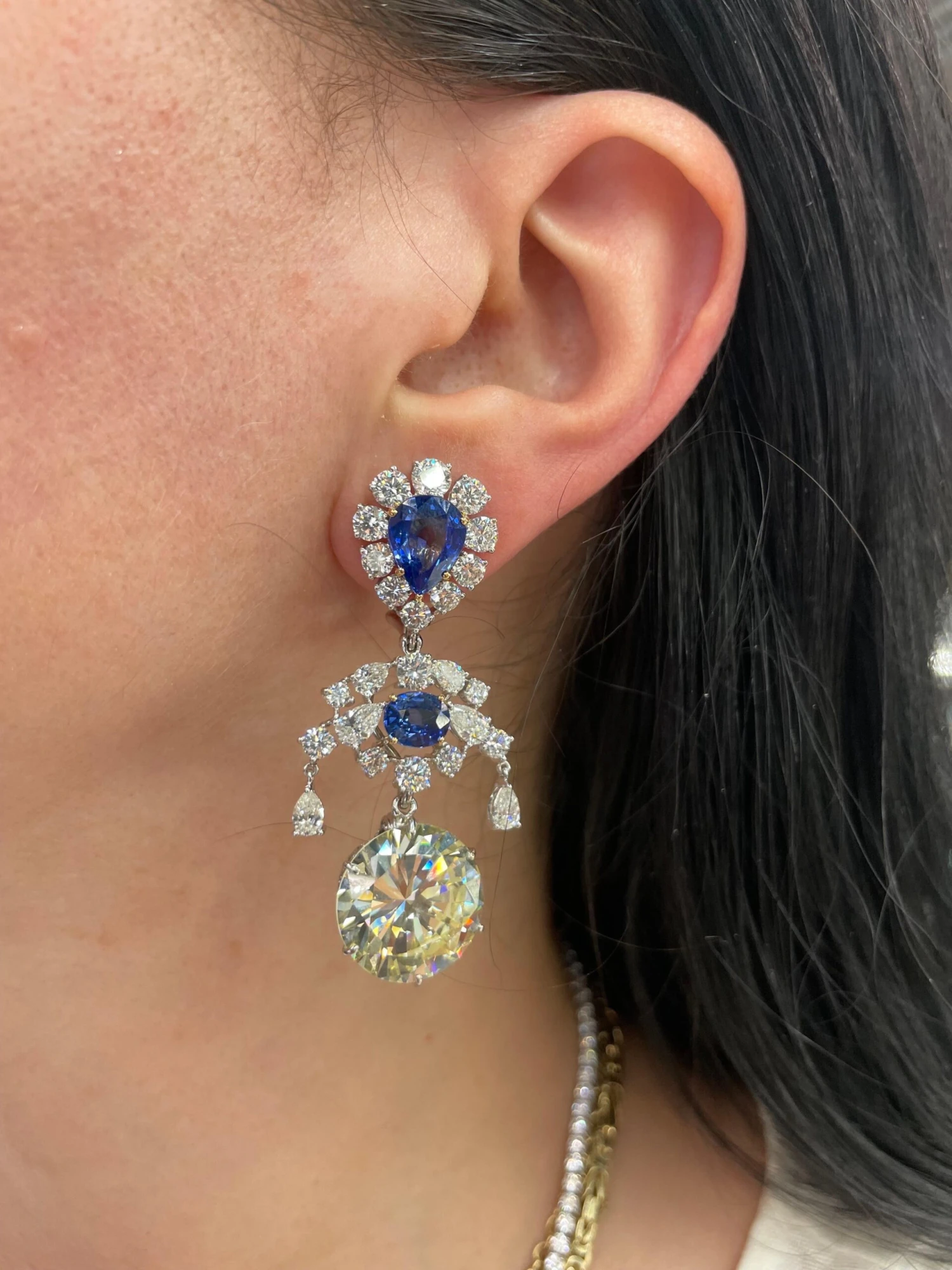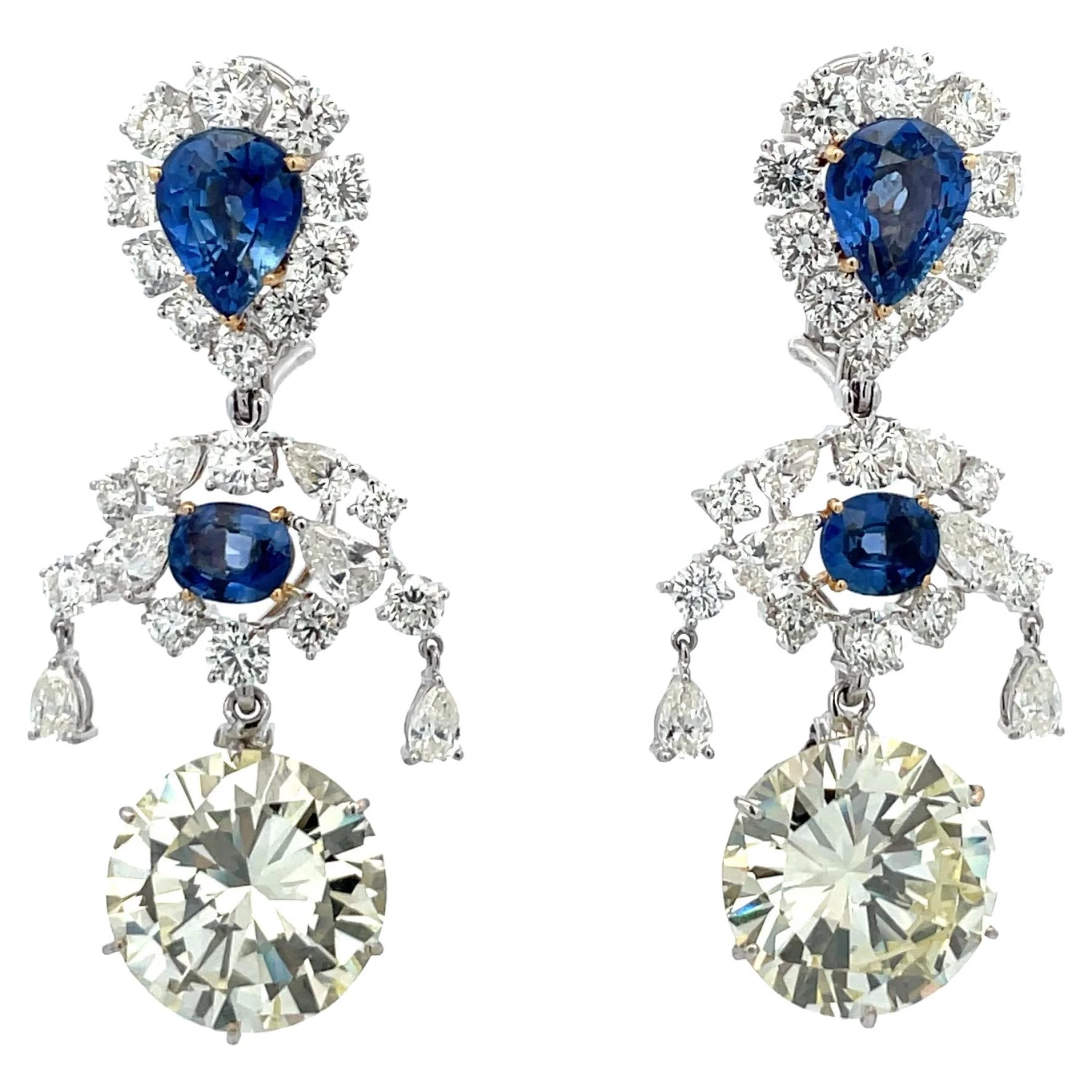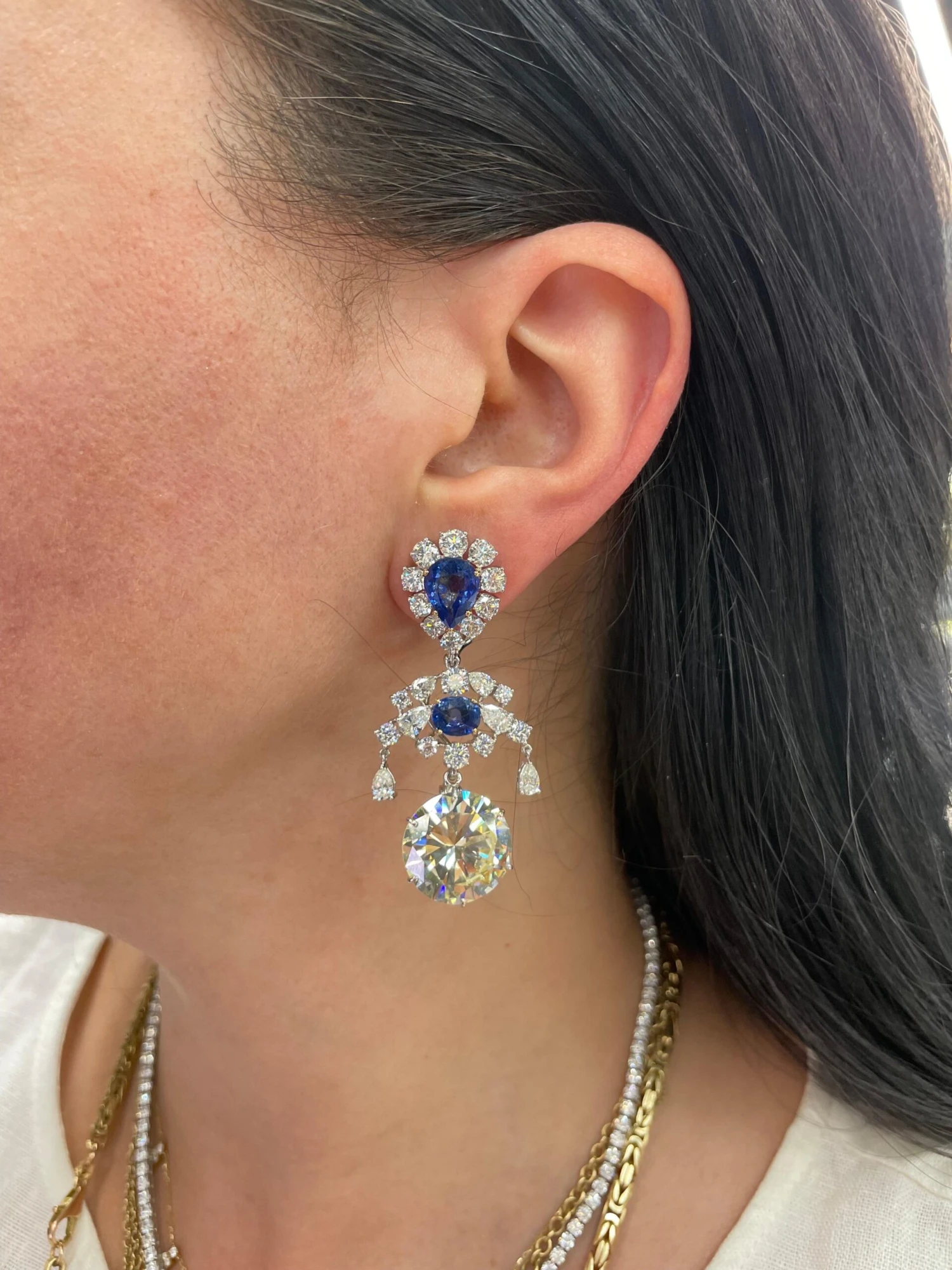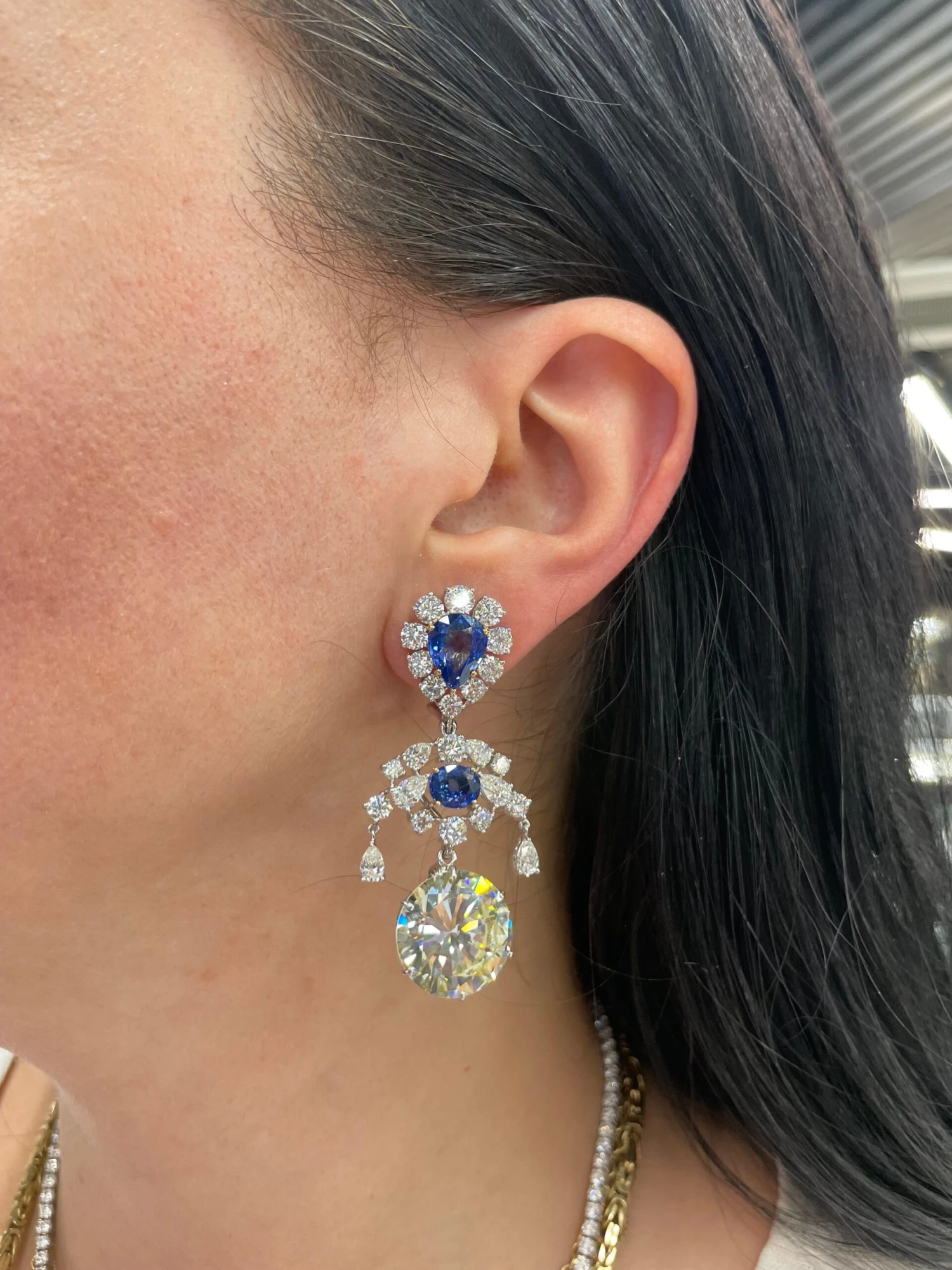 GIA Certified drop earrings featuring two Round Brilliants weighing each 15.08 Carats with a top design of Pear and Oval cut natural Sri Lanka Sapphires, in 18 karat white gold.