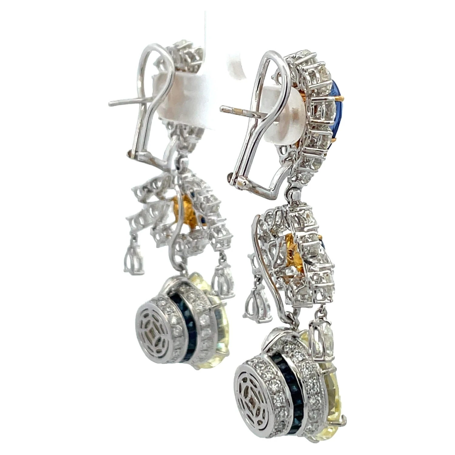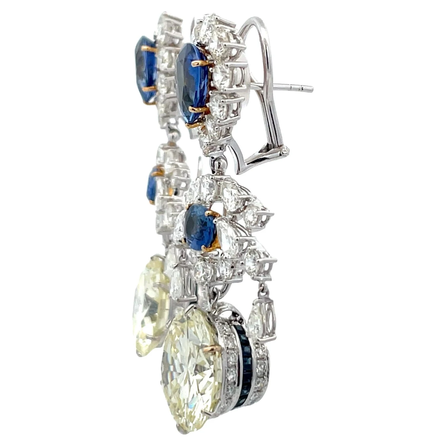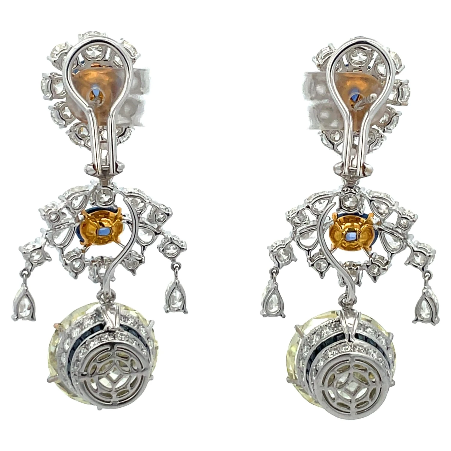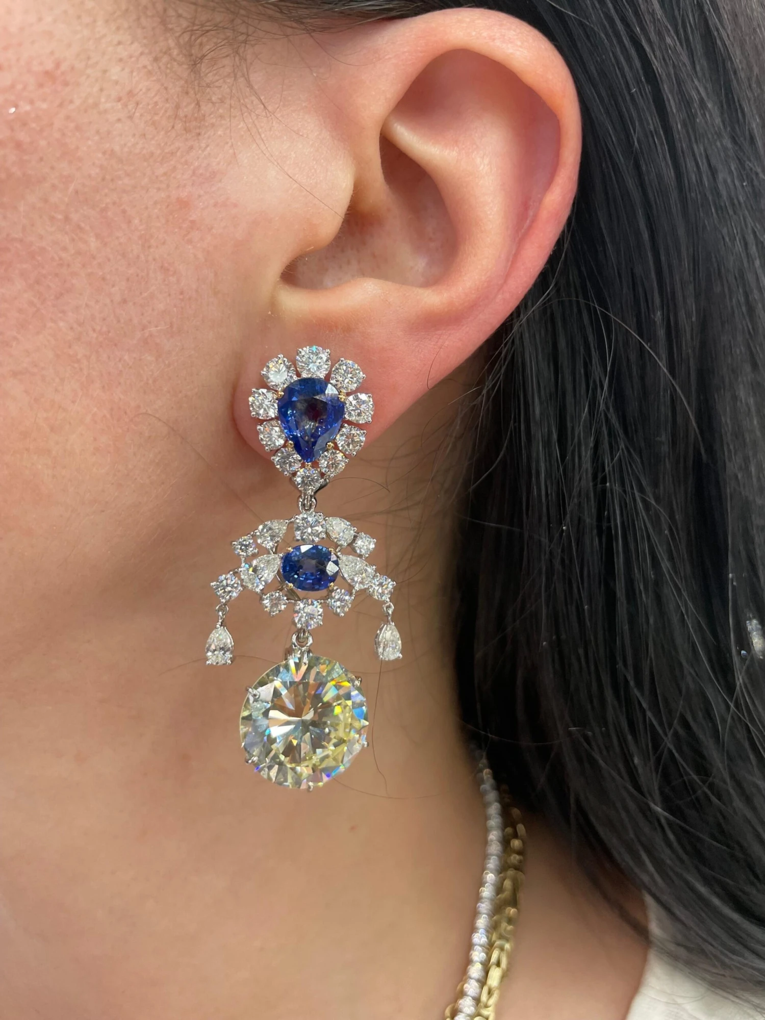 GIA Certified drop earrings featuring two Round Brilliants weighing each 15.08 Carats with a top design of Pear and Oval cut natural Sri Lanka Sapphires, in 18 karat white gold.