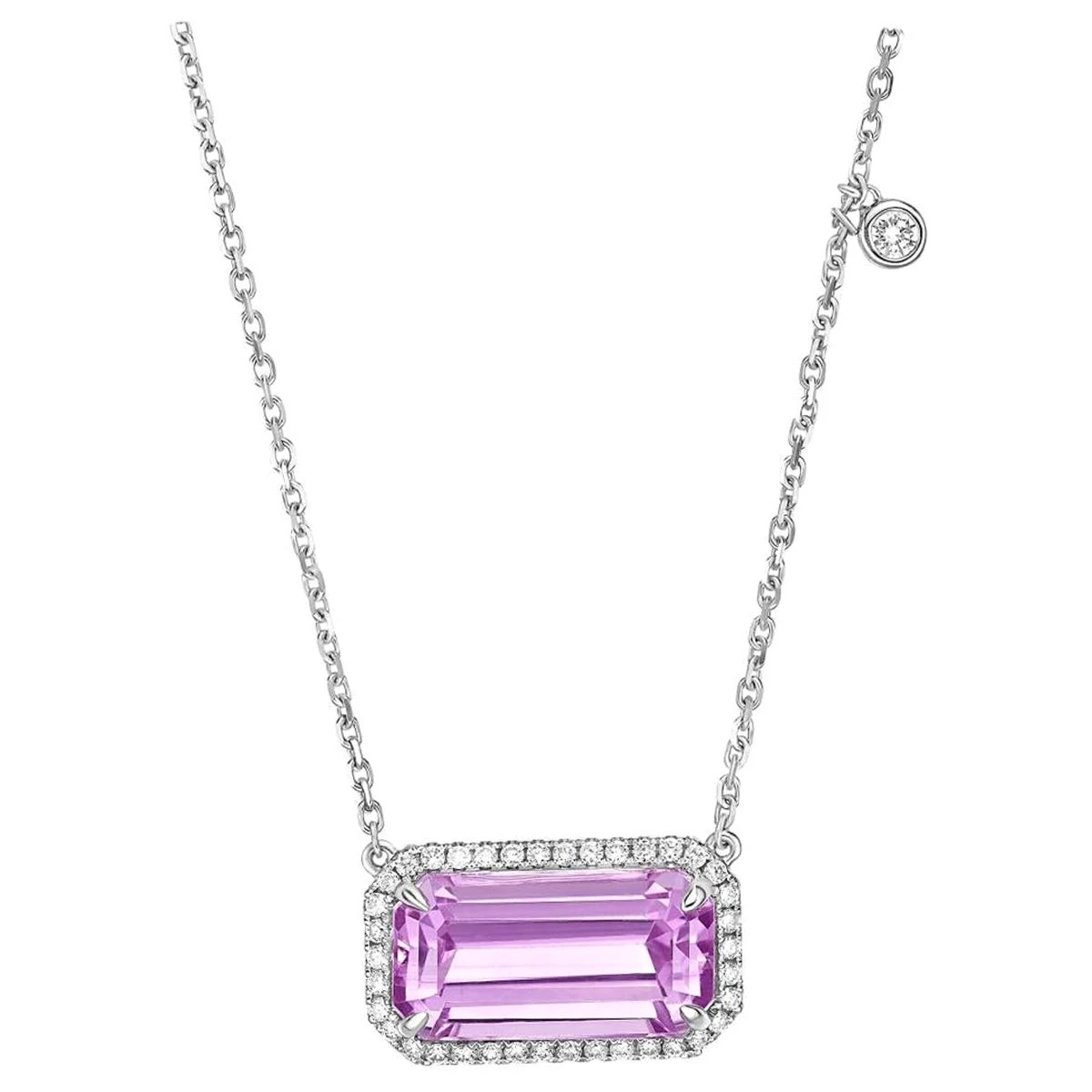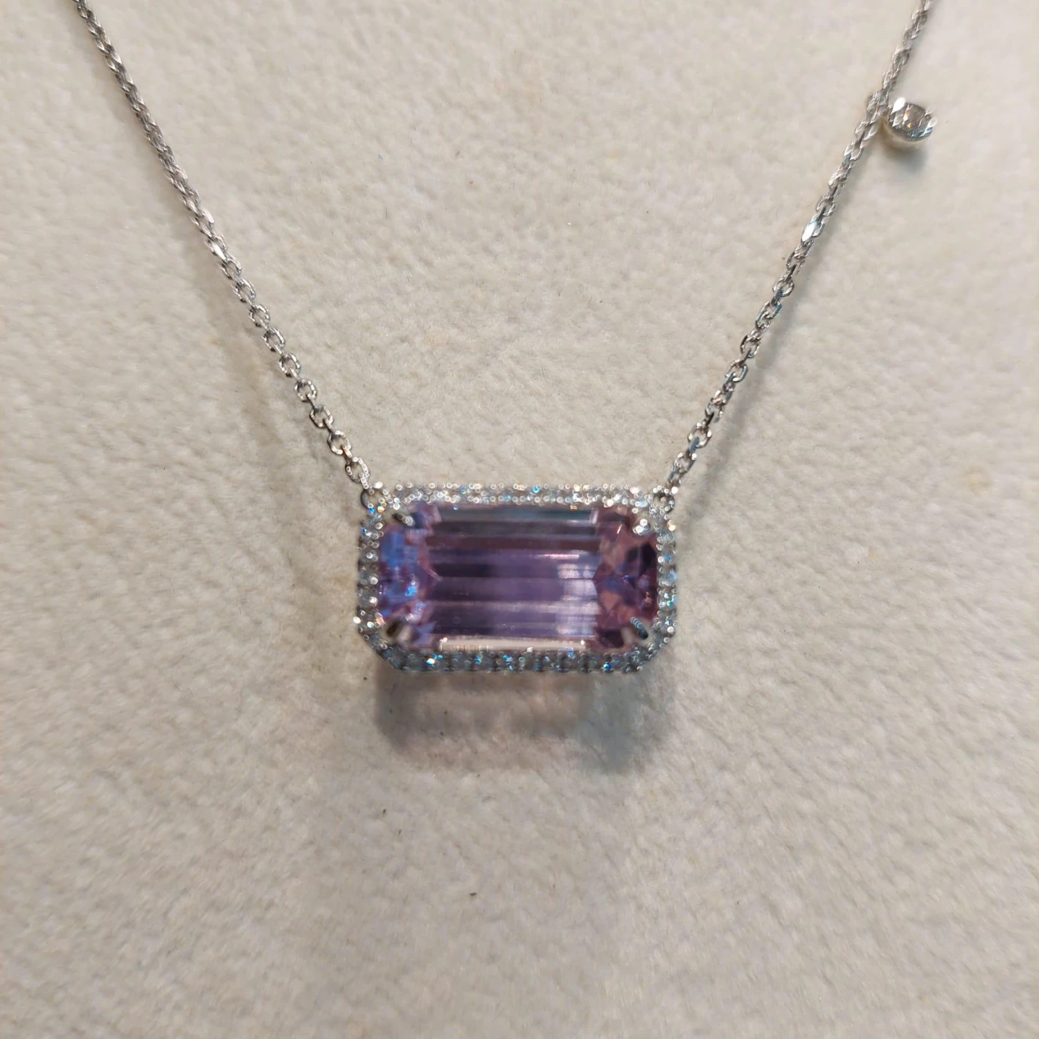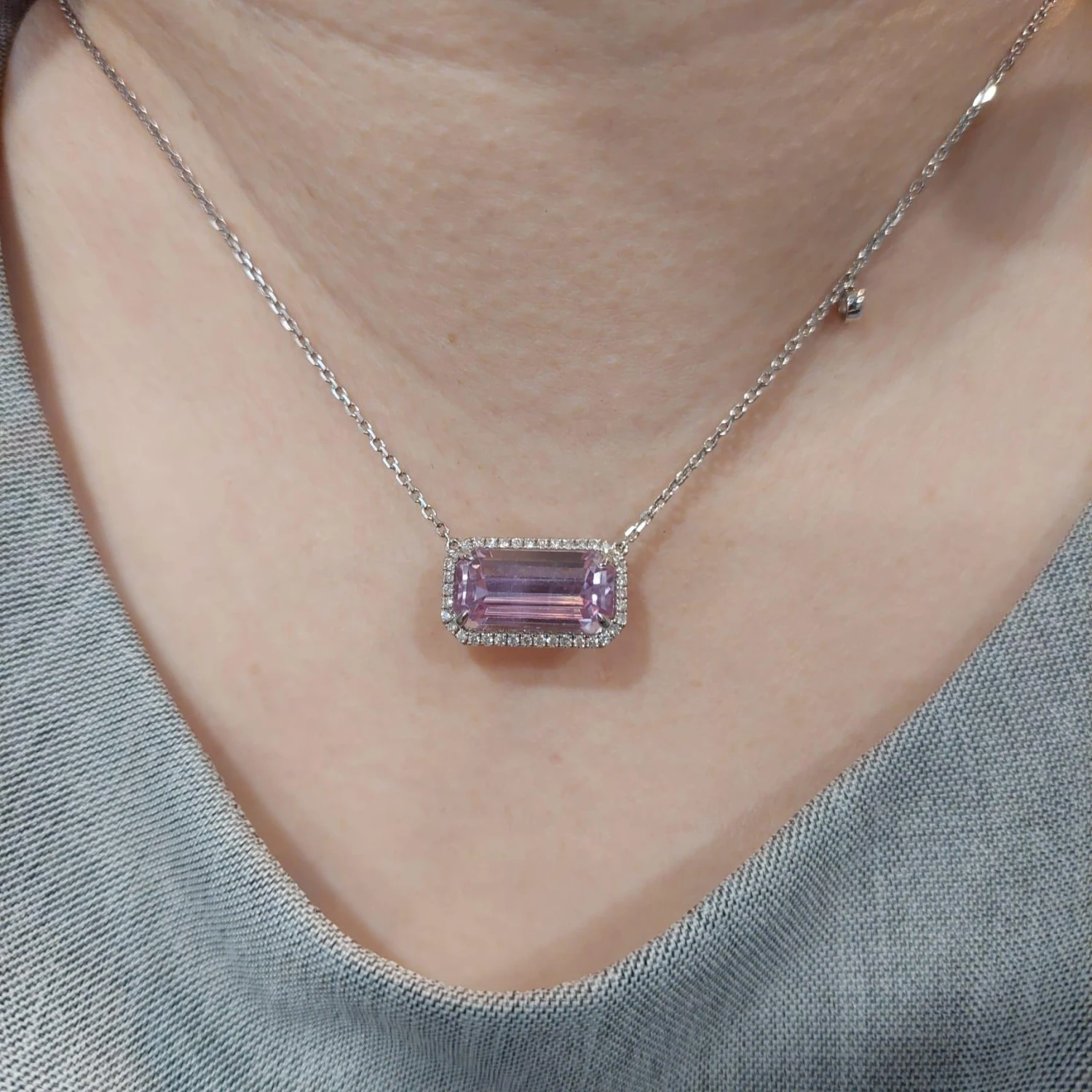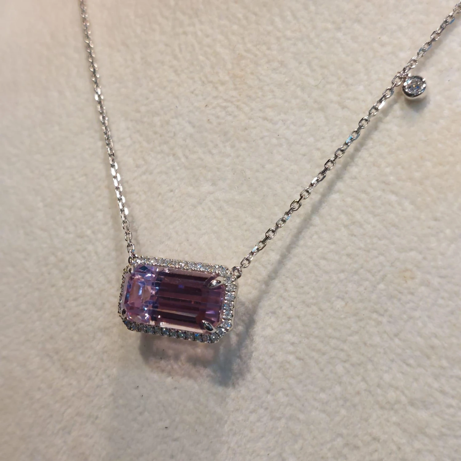 The Centre Kunzite weighs 9.33 carat, with 39 pieces 0.32 Carat of diamonds beautifully set around it. The necklace is made in 18K White Gold.