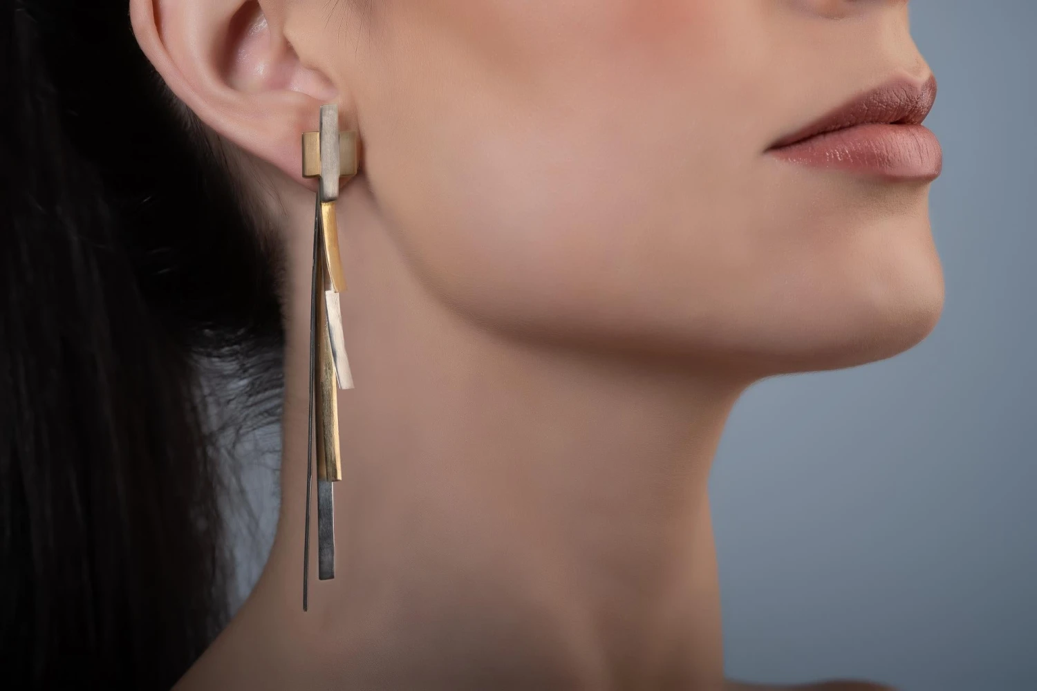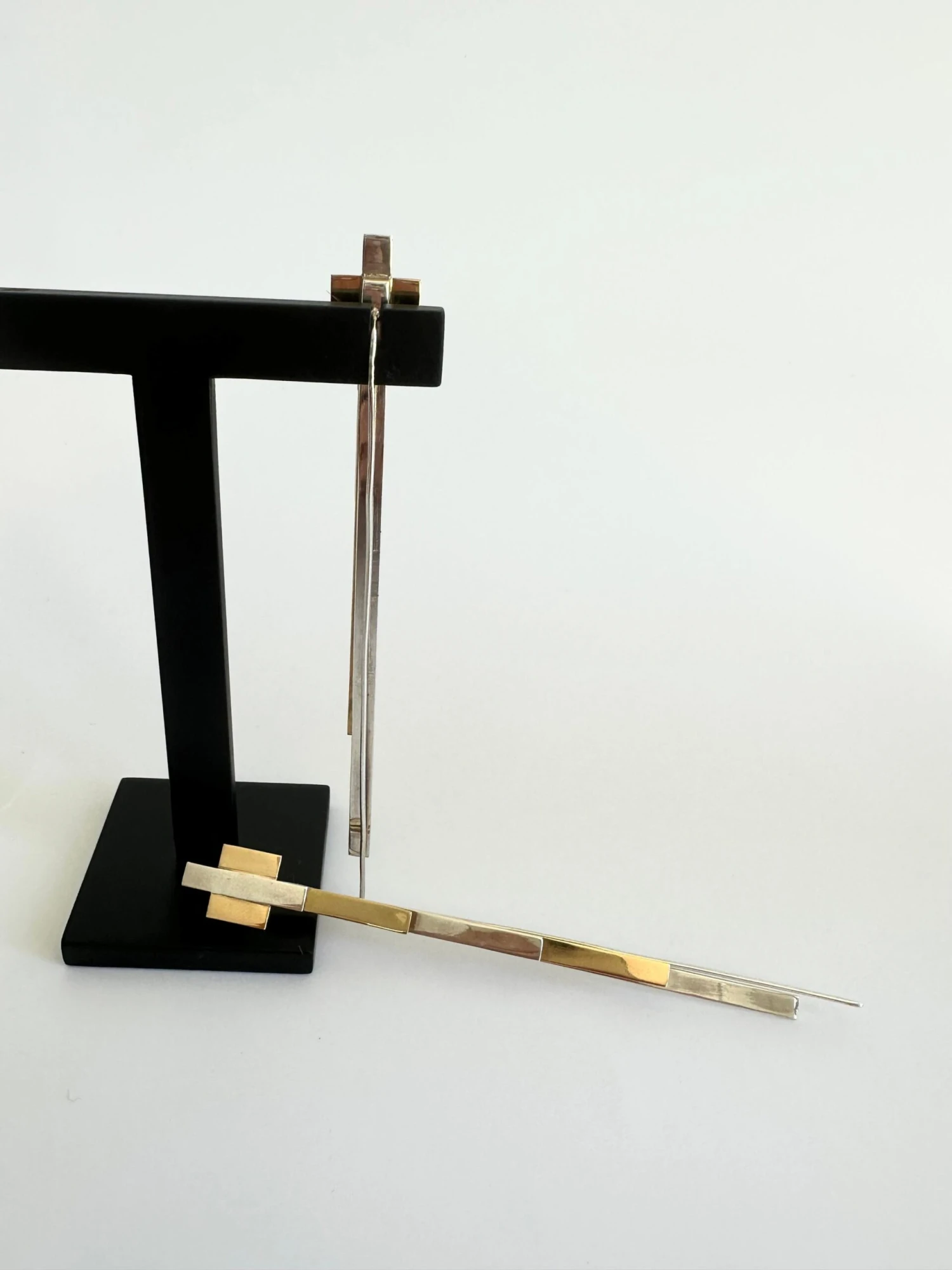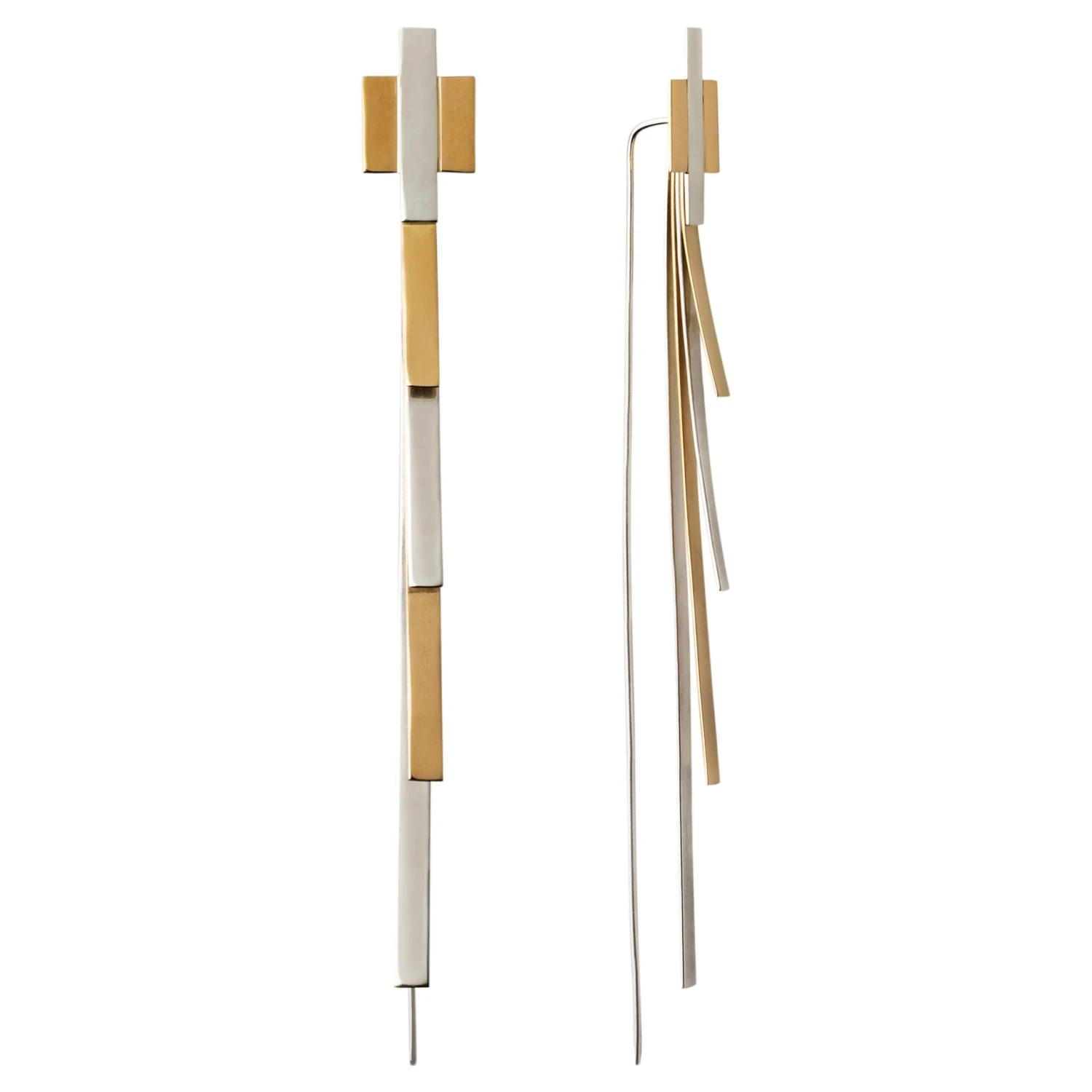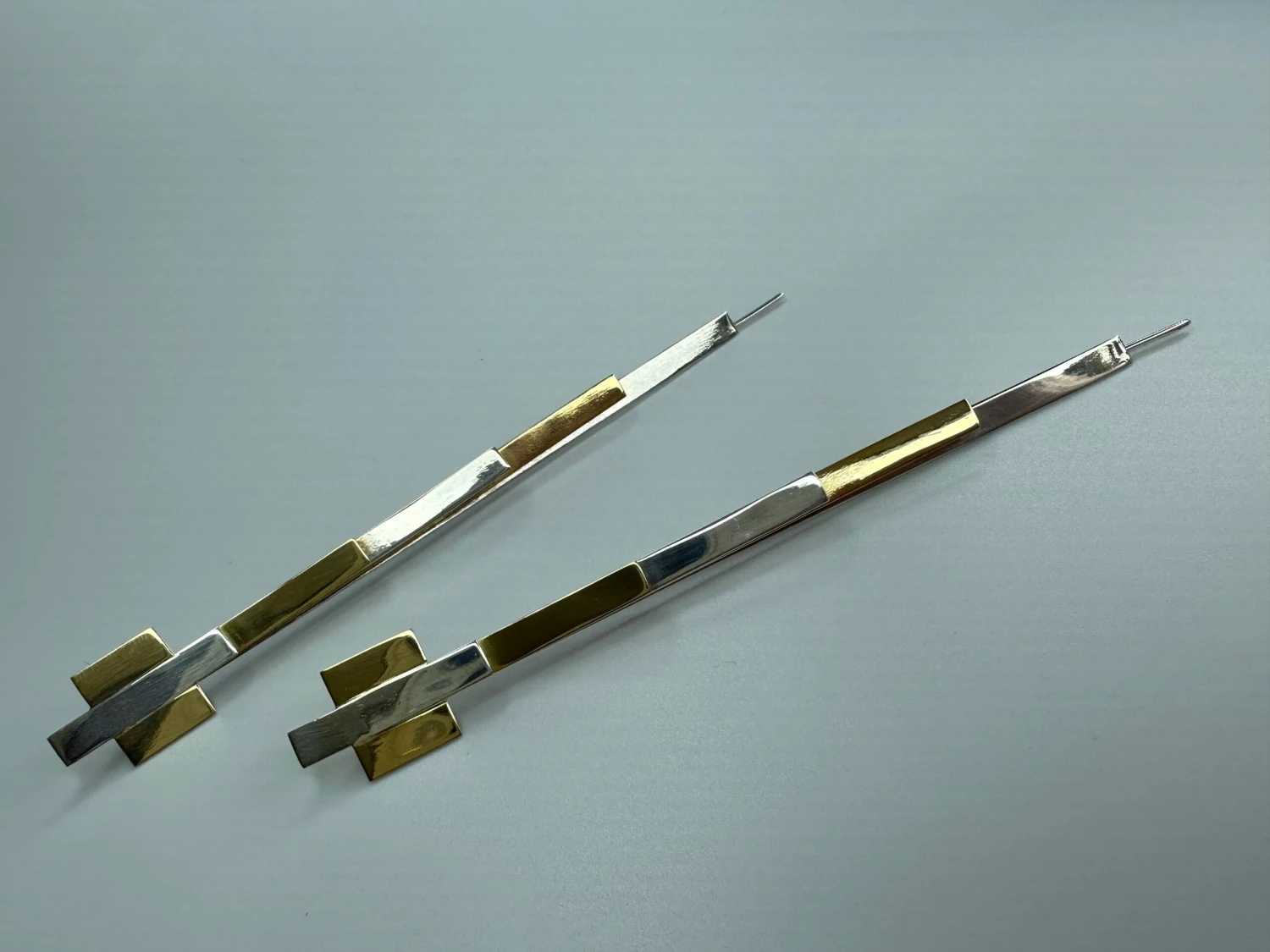 The earrings have four overlapping rows in 19.2 carat gold and 925 silver with rhodium plating to maintain shine in different sizes, the longest being in 925 silver, followed by gold and again 925 silver and 19.2 carat gold. The top finish has a central 925 silver line, with the sides in 19.2 carat gold soldered to this line.
