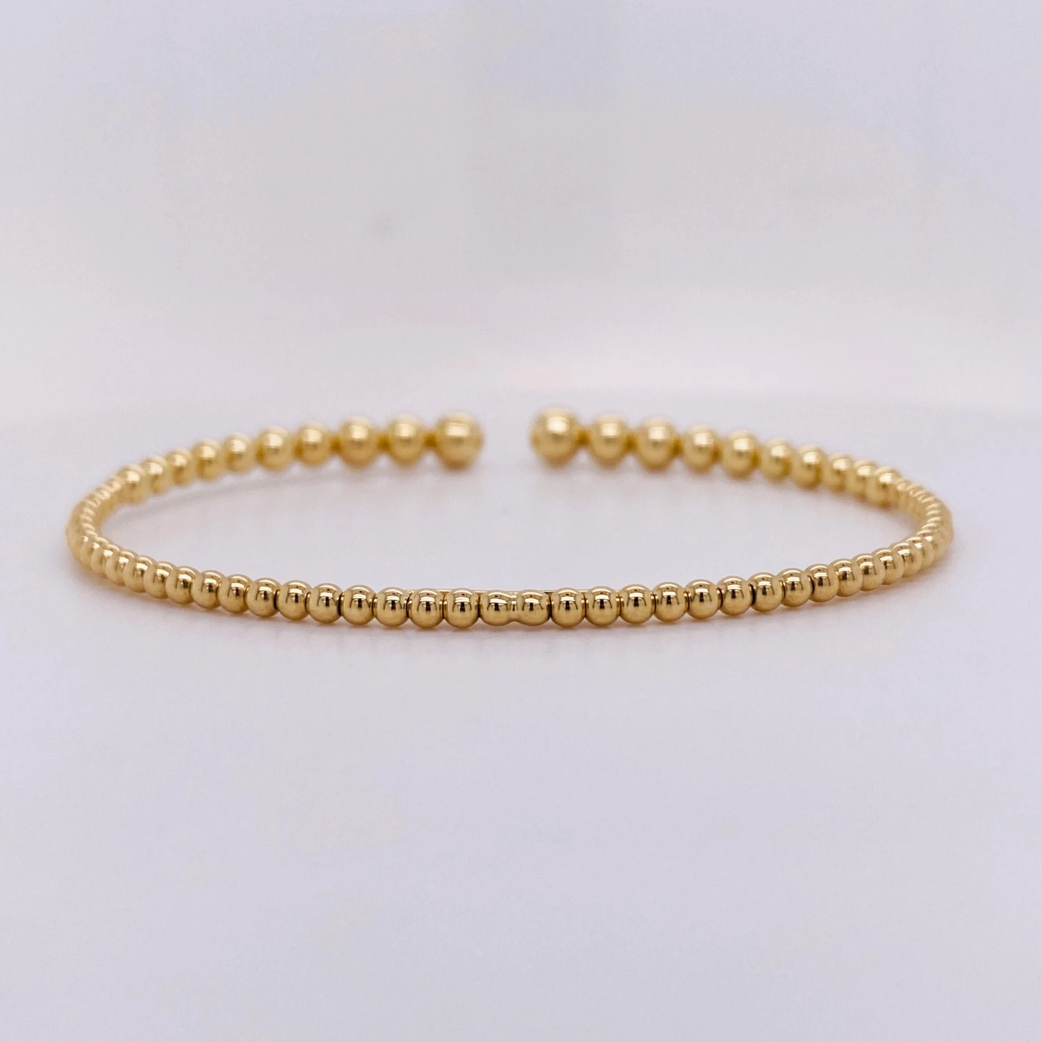 Beautifully slender and comfortable, this low-profile bangle bracelet is a winner on your wrist! You can wear it alone or stacked, perfect for any and every day wear. We love that this bracelet turns standard cuff bracelet design on its head by making the cuff opening the focal point! The center of the bangle has slender beads that graduate to a large beaded design at the open cuff ends. You get to decide how to wear this lovely bangle! The beaded design of the bangle is comfortably rounded and goes with any dressed up or down occasion! The bracelet is designed to flex easily to slide on your wrist and then bounce back into shape! Fine attention to craftsmanship and finishing makes this a wonderful piece! This bracelet is made in 14 karat yellow gold for a 6.25-inch wrist. We can also make this for you in white gold and lengths from 5 to 7.75 inches. Just message us! For orders in different sizes and metals, please allow 4-6 weeks for delivery.