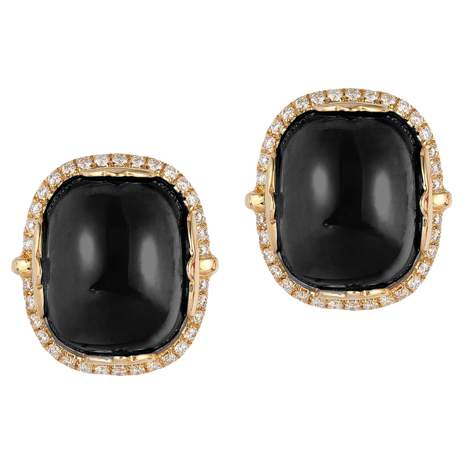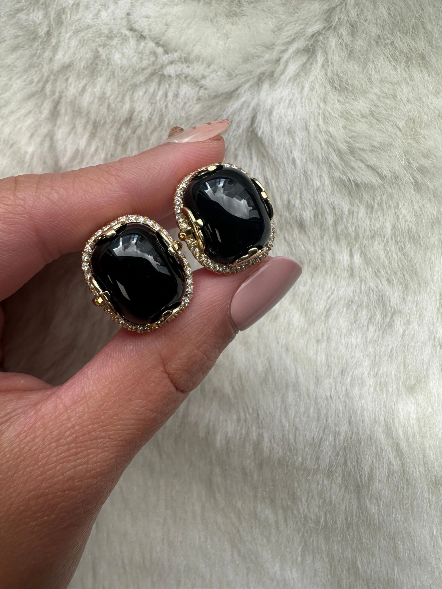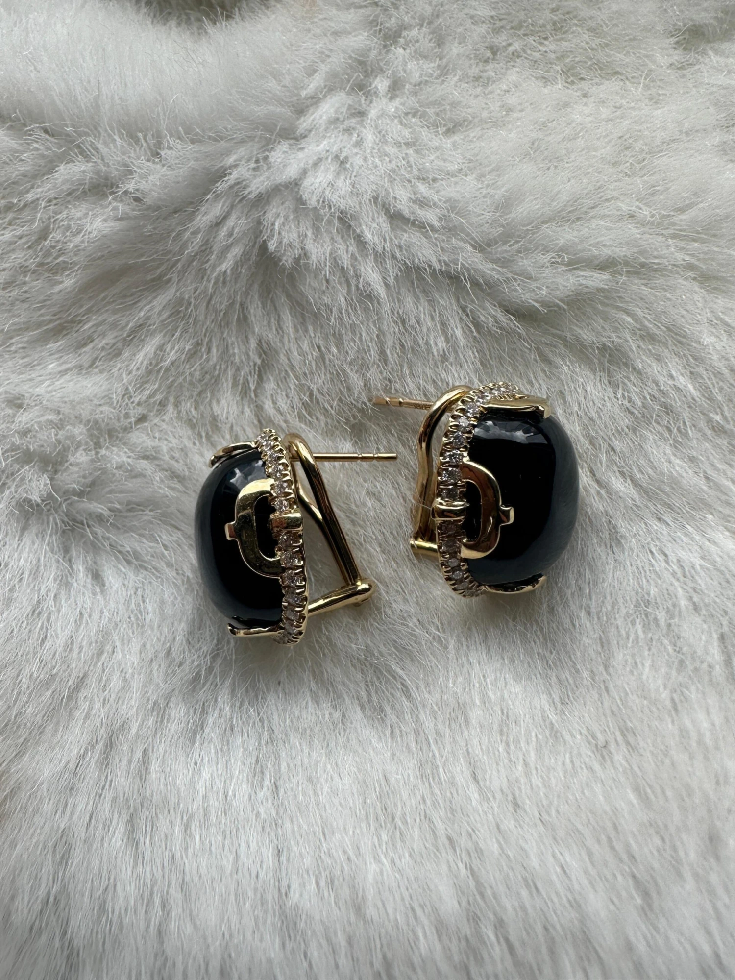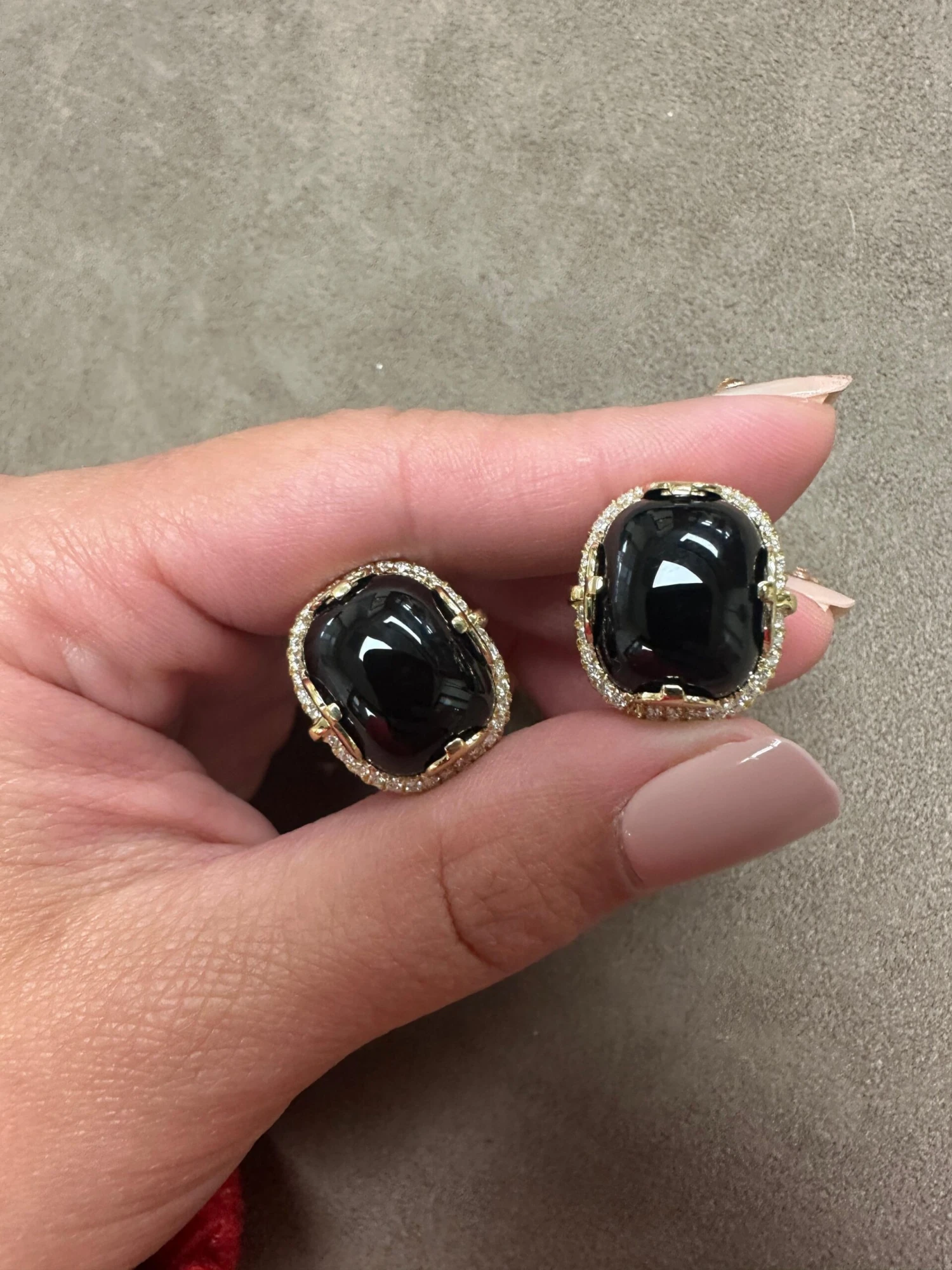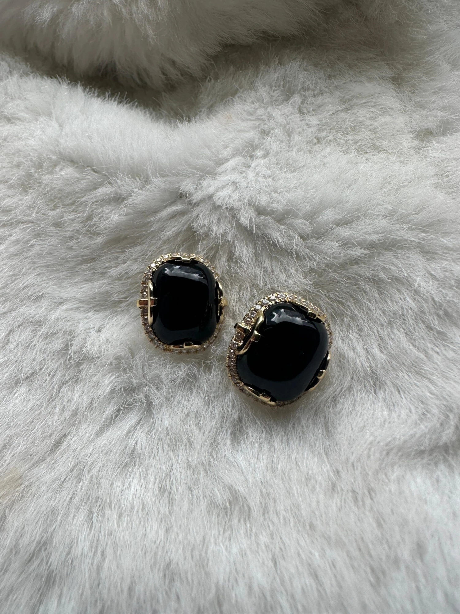 Crafted with meticulous attention to detail, each earring features a captivating cushion-shaped Onyx cabochon. Enhancing the allure of these earrings, a delicate halo of sparkling diamonds encircles the Onyx cabochons. The contrast between the black Onyx and the shimmering diamonds creates a striking visual impact.
