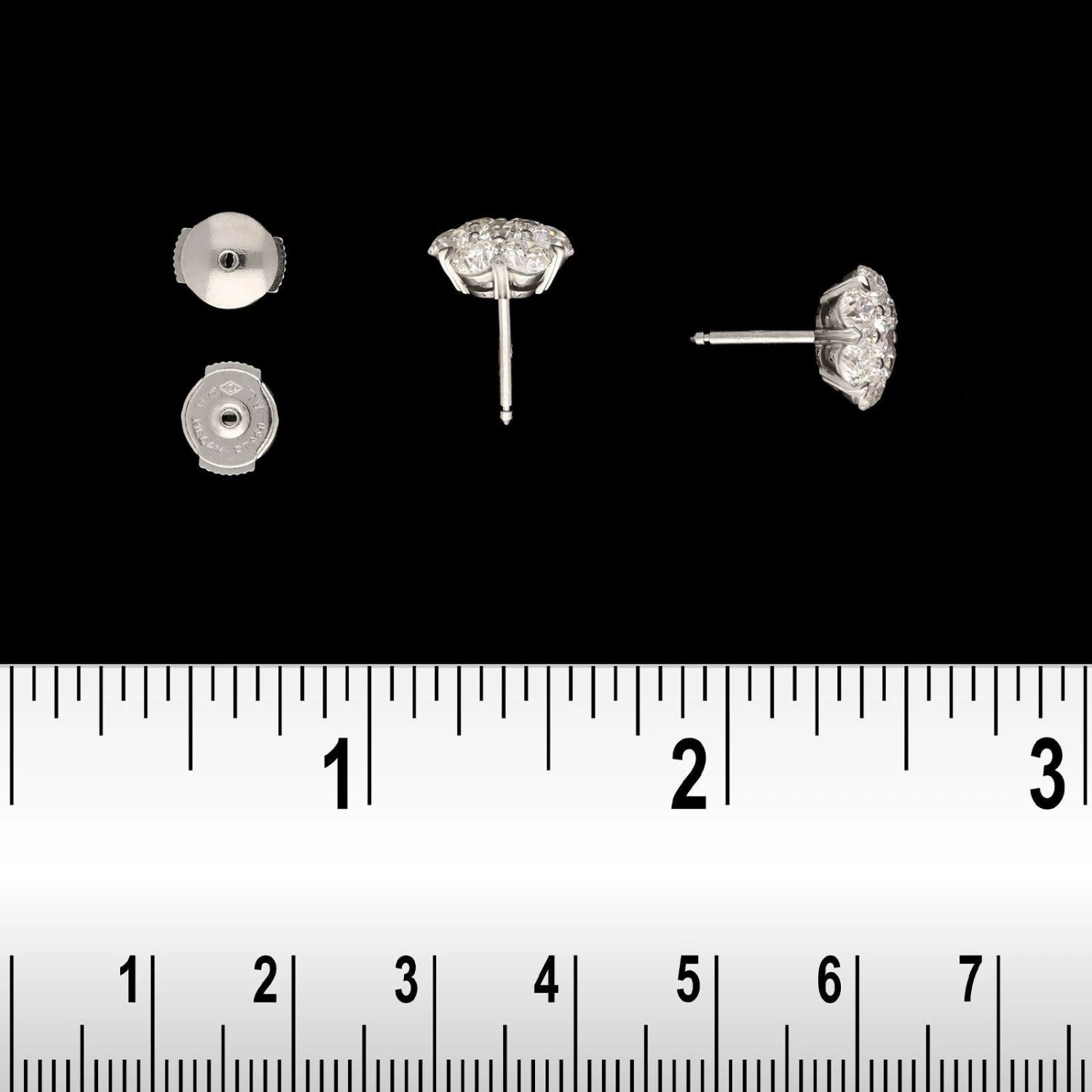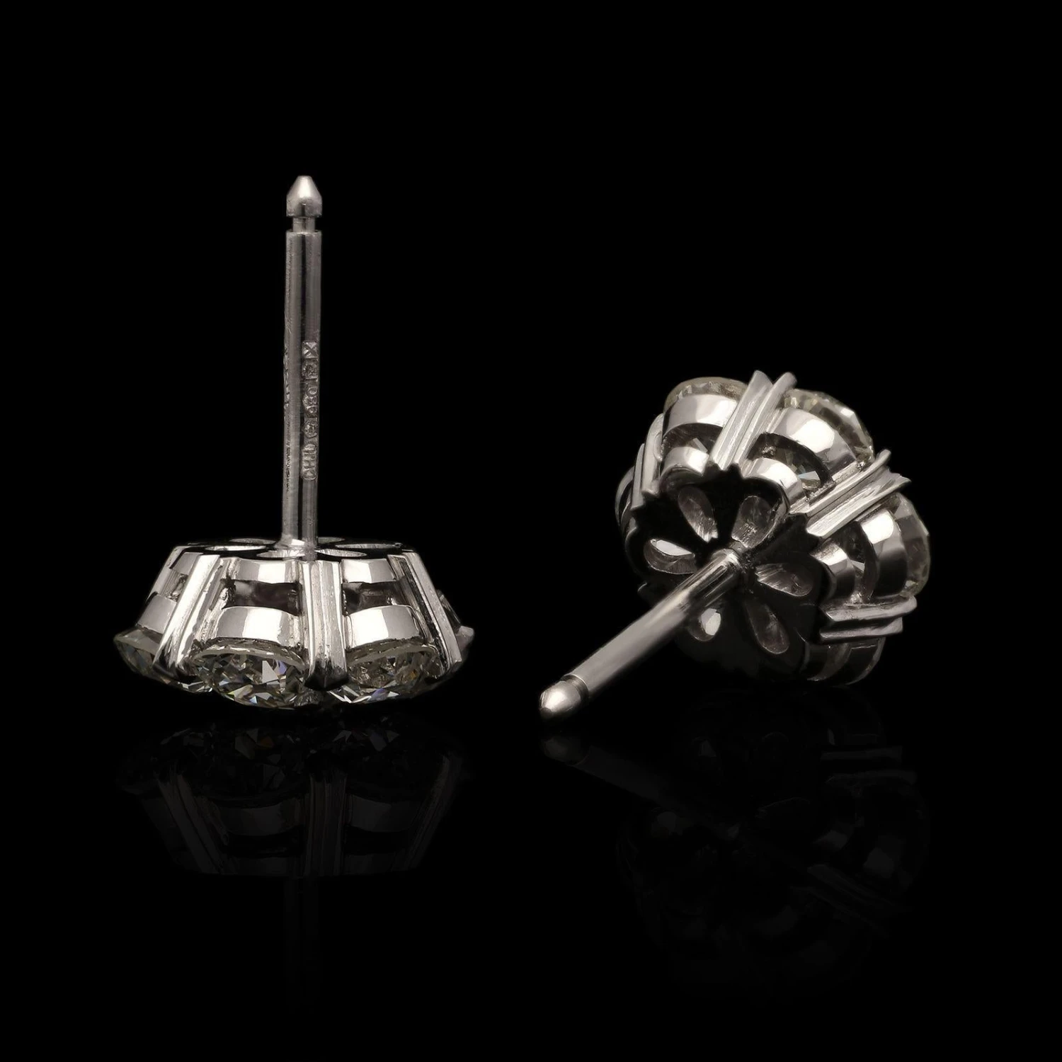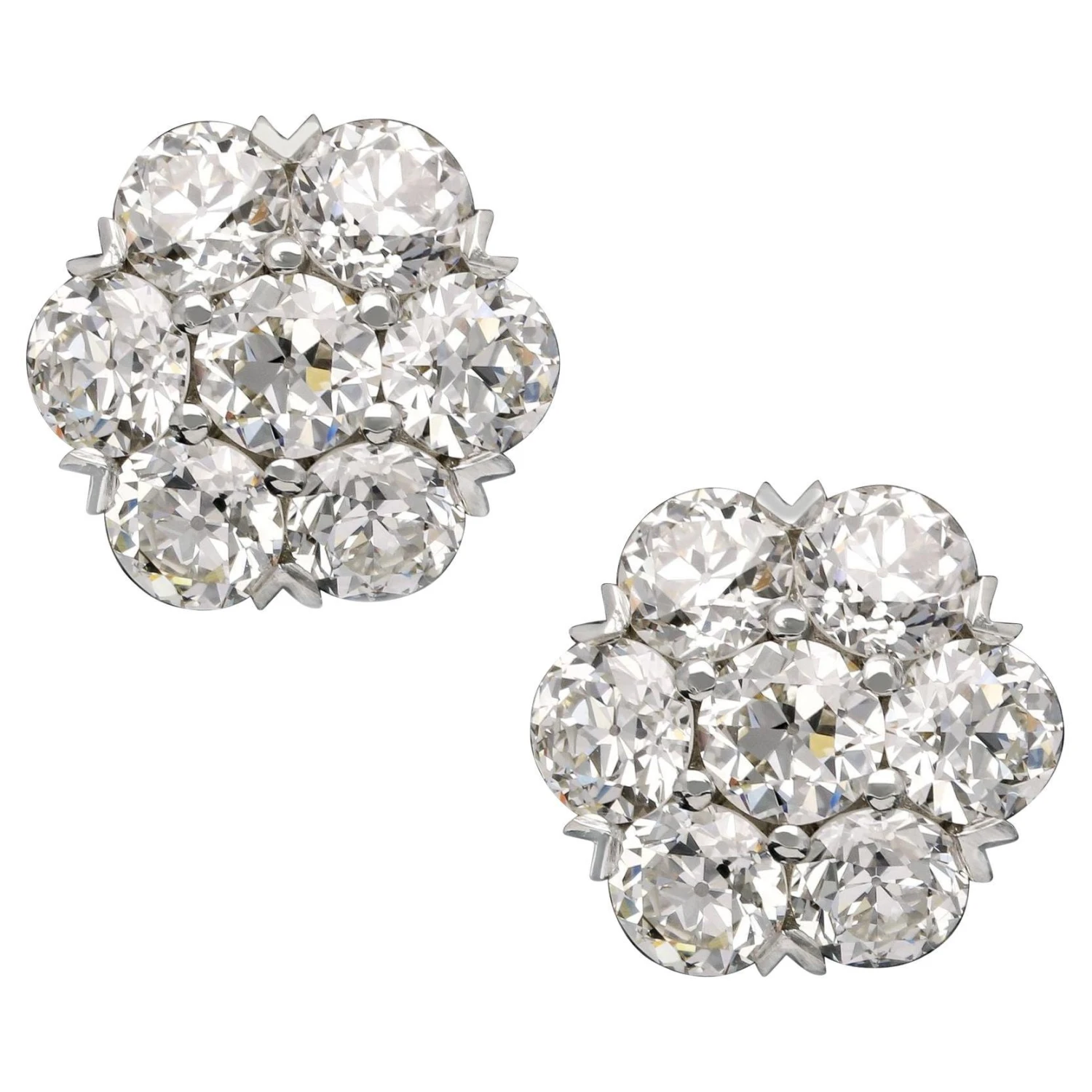 A beautiful and classic pair of diamond cluster earrings by Hancocks, each set to the centre with a bright and lively old European brilliant cut diamond surrounded by six others, the diamonds weighing 2.80cts in total and all set in platinum claw settings to post and alpha backs.