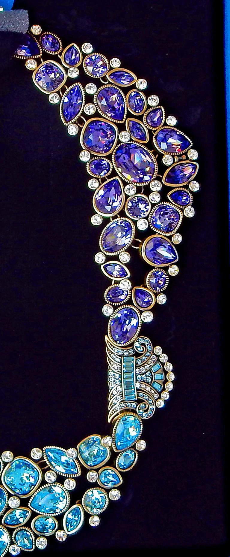A stunning elevated Heidi Daus crystal collar necklace. Wide collar necklace features 3 tapered section of bezel-set, multi shaped crystals in clustered patterns. Three (3) scrolling Art Deco designed stations lined with pave-set round crystals are accented by channel-set crystal baguettes. Enhanced by a milgrain texture. The crystals are clear, aquamarine- tanzanite and lavender-color crystal baguettes. Features bonzetone metal oxidized and polished. Very rich and stunning in person. (see matching bracelet in separate listing)